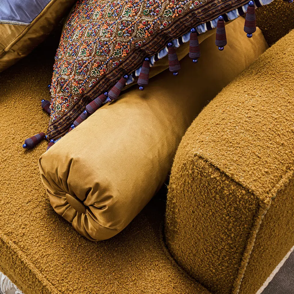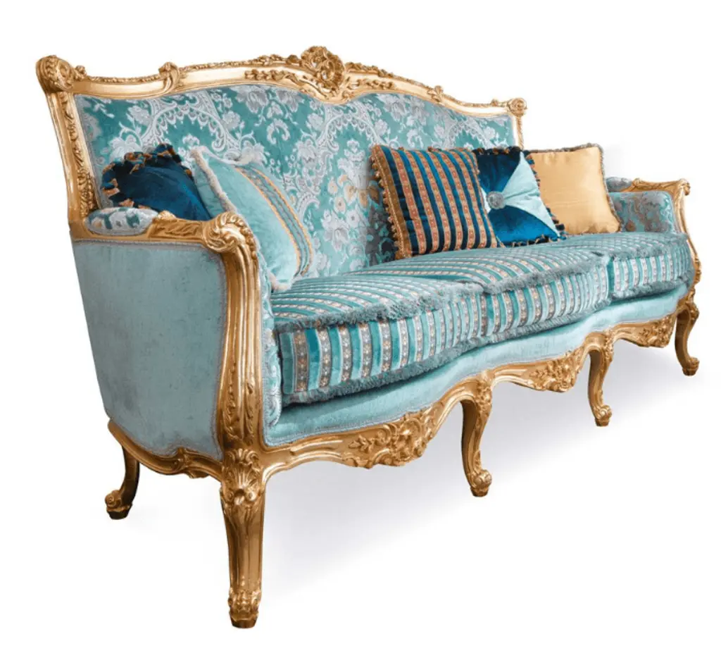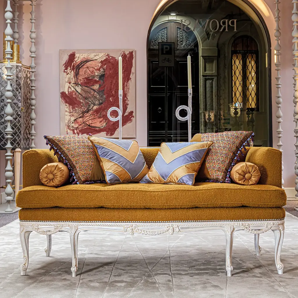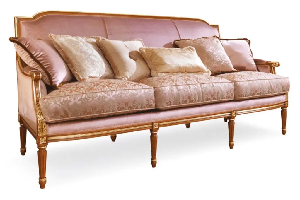 Sofa with hand-carved legs in silver decapè finishing. Pillows included as per the photo.