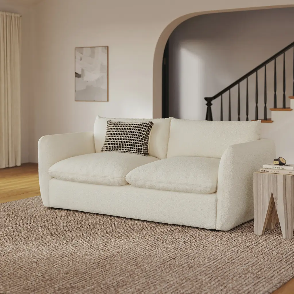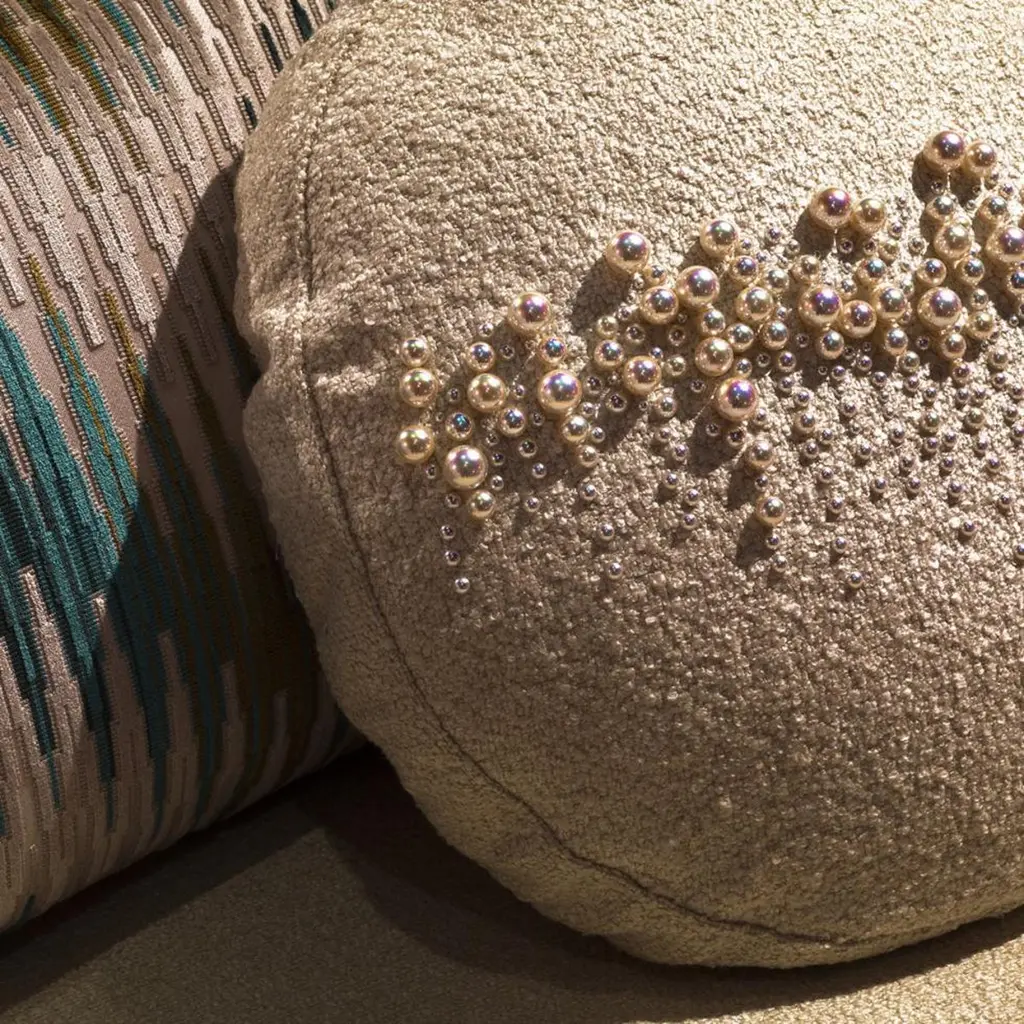 Boasting a stunning sinuous silhouette, this superb Maurice three-seater sofa will be a statement piece in elegant modern and classic interiors, alike. Showcasing a luxuriously padded curved-back and single seat cushion upholstered in refined white bouclé, along with natural wood rounded feet. Embellished by four rectangular and three round accent pillows, whose central pillow flaunts an exquisitely embroidered pearl detail. Best paired with other elements from the same Collection.