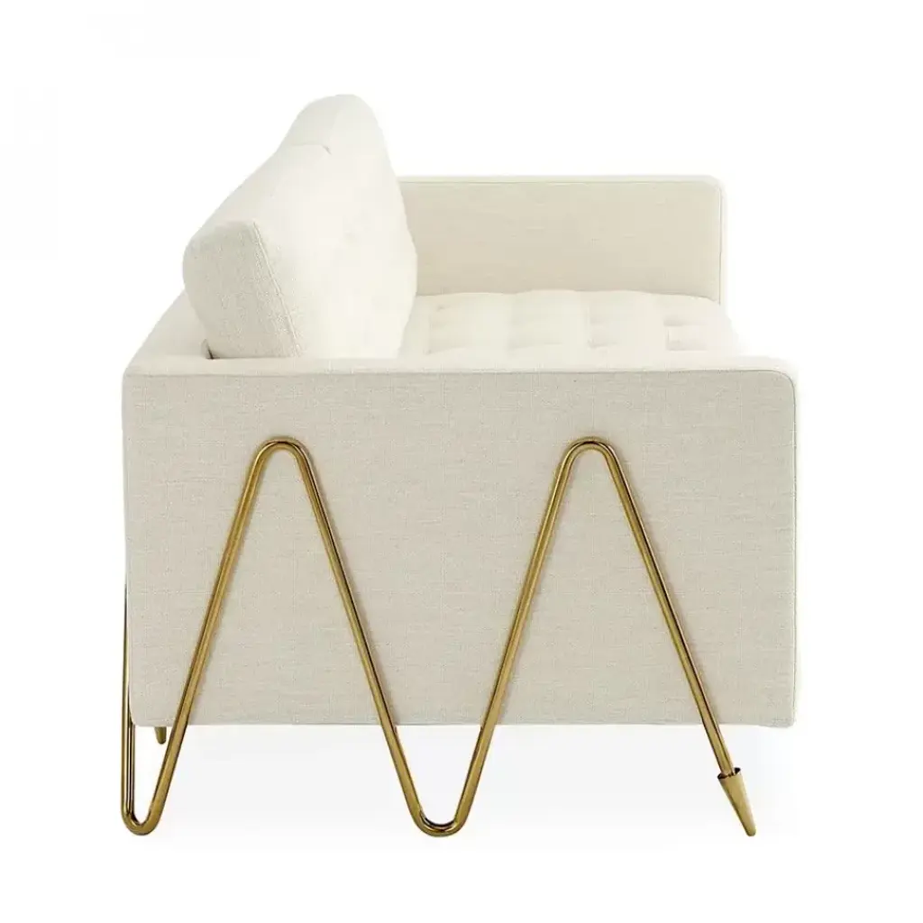 A hard-working sofa with an haute couture finish. Our Maxime Sofa features a mid-century-inspired silhouette cradled by an undulating brass frame featuring our signature arrow sabots. Upholstered in Lucerne Oyster bouclé and marked by its reversible topstitched cushions—buttons on one side and pull tufts on the reverse to let you tailor the tailoring. This profile is the stuff design magazine dreams are made of—float it in the center of the room to show off your bold bona fides.