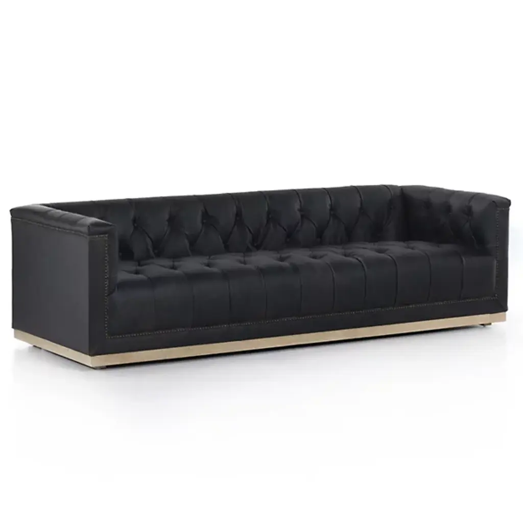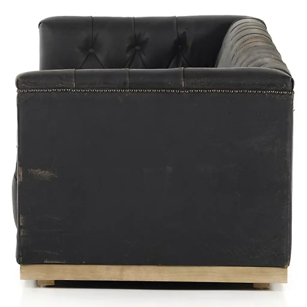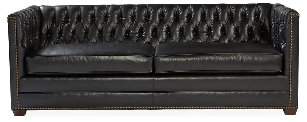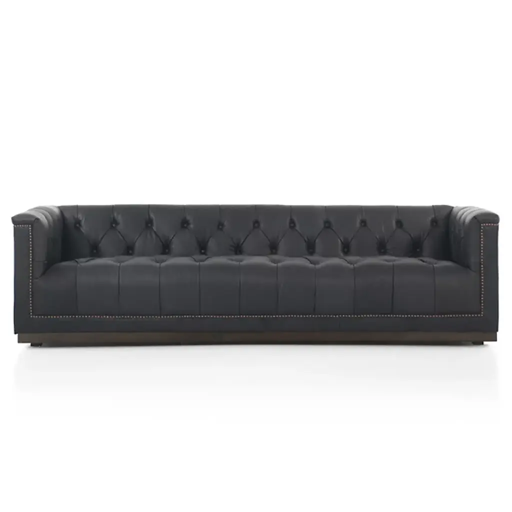 Bring lasting vintage appeal to interiors with the tasteful, intricate lines of the Maxx Sofa from Four Hands. A large, prominent offering ideal for retro spaces, it’s upholstered in top-grain leather; it rises from a rectangular base of oak, with some iron accents for reinforcement and aged bronze nailheads for contrast. The sofa’s surface is artificially aged and naturally distressed for a delightfully vintage look, its inset buttons creating an enduring diagonal pattern between them.