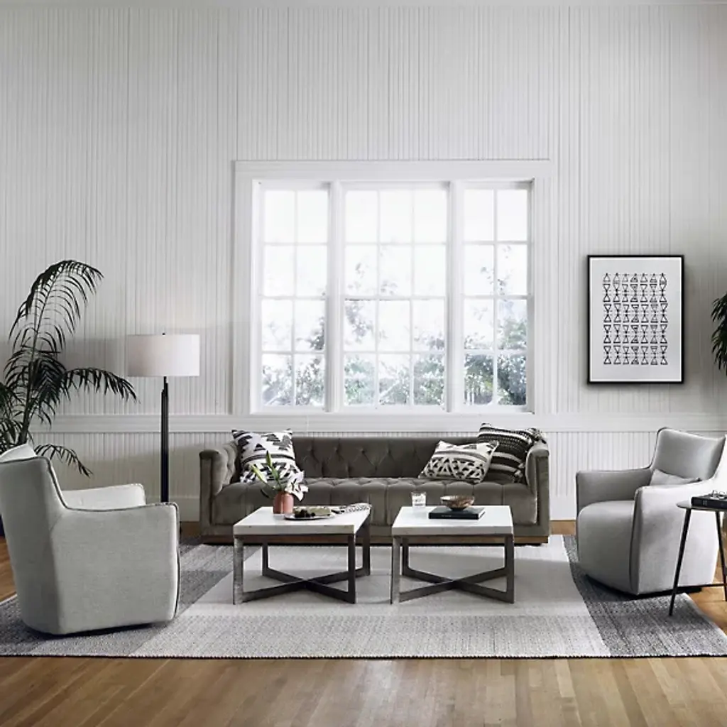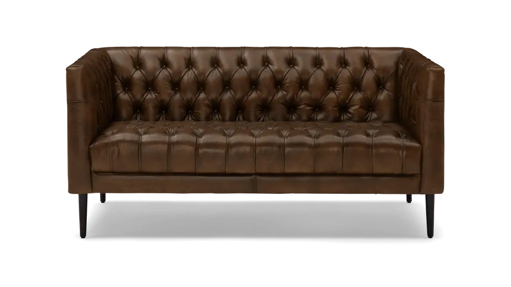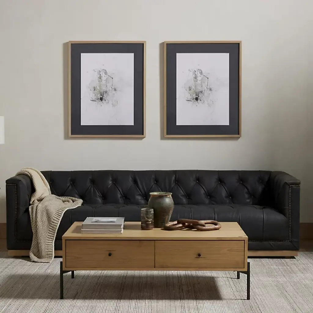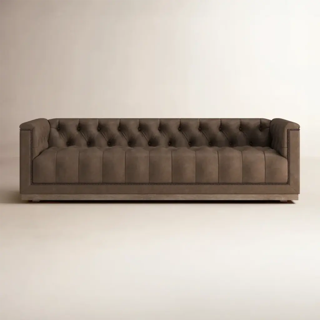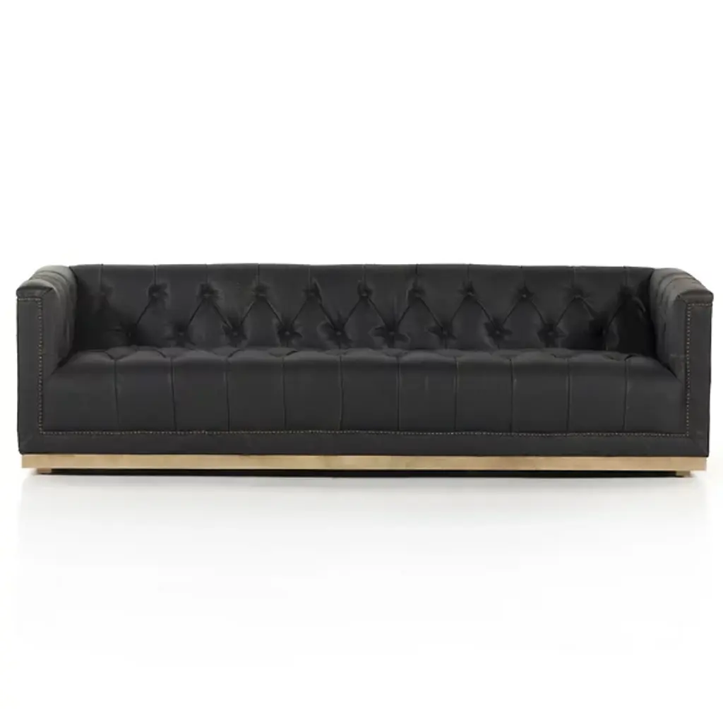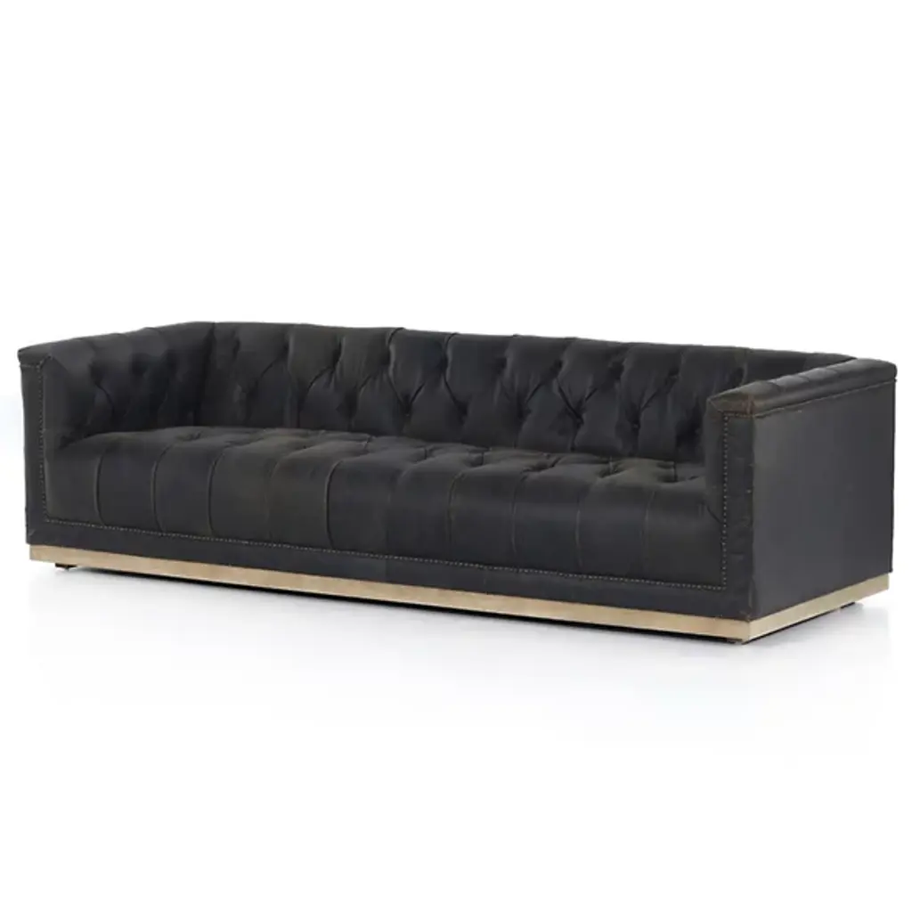 Bring lasting vintage appeal to interiors with the tasteful, intricate lines of the Maxx Sofa from Four Hands. A large, prominent offering ideal for retro spaces, it’s upholstered in top-grain leather; it rises from a rectangular base of oak, with some iron accents for reinforcement and aged bronze nailheads for contrast. The sofa’s surface is artificially aged and naturally distressed for a delightfully vintage look, its inset buttons creating an enduring diagonal pattern between them.