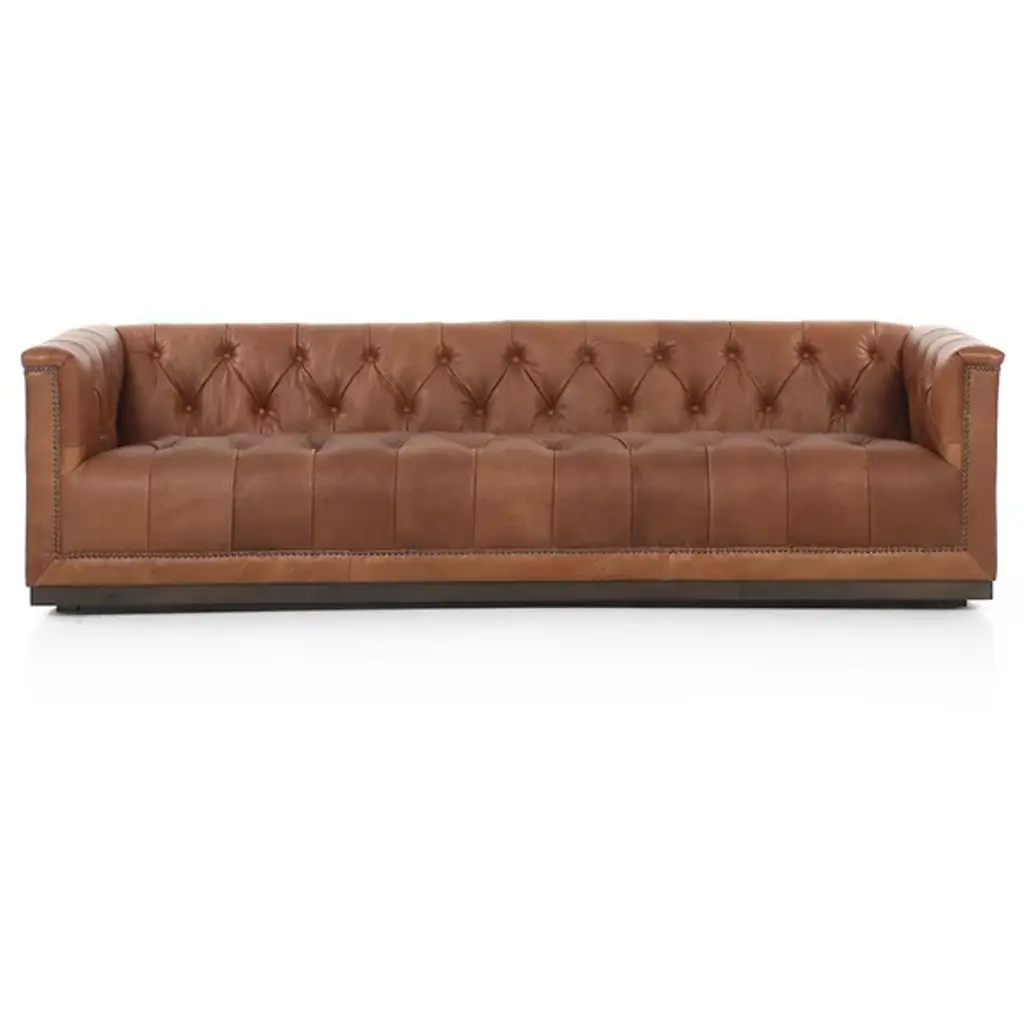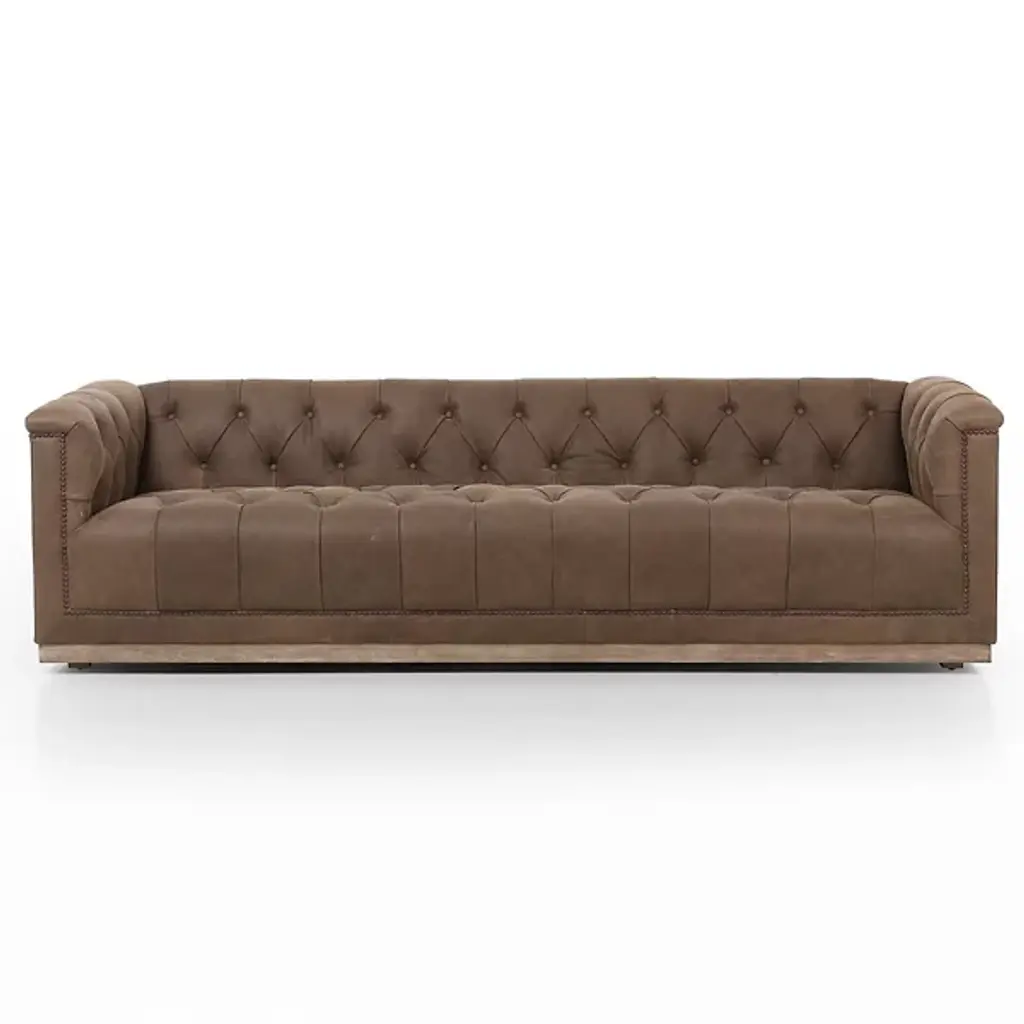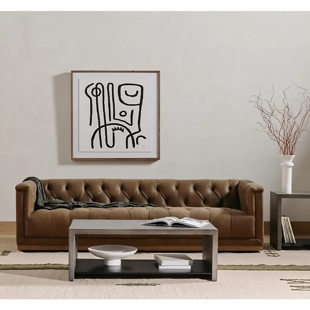 Bring lasting vintage appeal to interiors with the tasteful, intricate lines of the Maxx Sofa from Four Hands. A large, prominent offering ideal for retro spaces, it’s upholstered in top-grain leather; it rises from a rectangular base of oak, with some iron accents for reinforcement and aged bronze nailheads for contrast. The sofa’s surface is artificially aged and naturally distressed for a delightfully vintage look, its inset buttons creating an enduring diagonal pattern between them.
