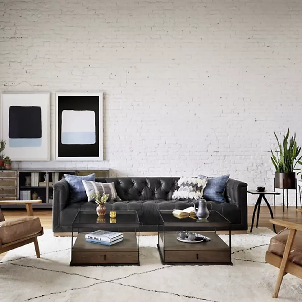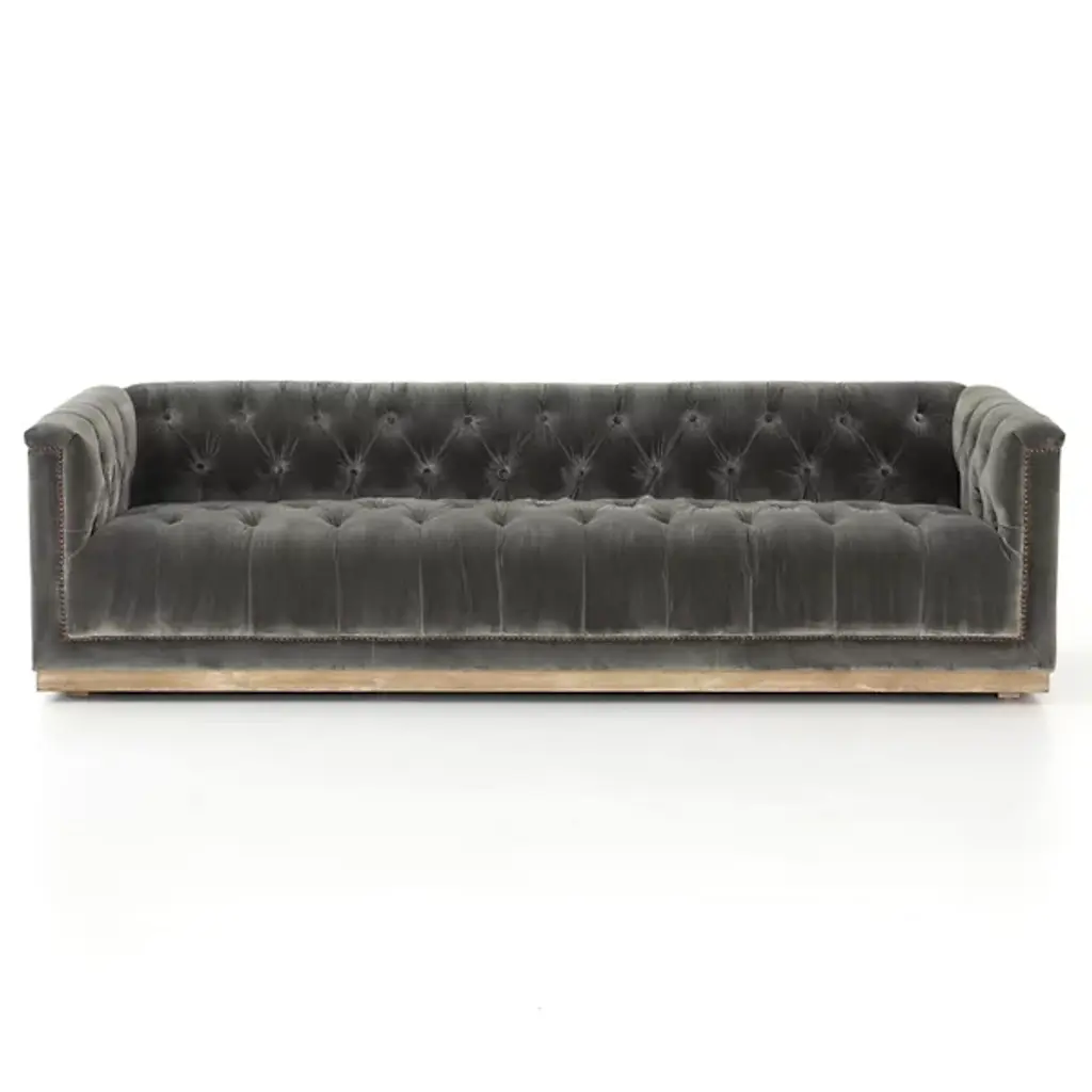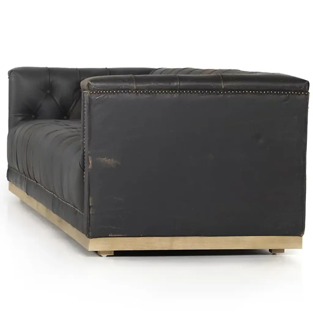 Bring lasting vintage appeal to interiors with the tasteful, intricate lines of the Maxx Sofa from Four Hands. A large, prominent offering ideal for retro spaces, it’s upholstered in top-grain leather; it rises from a rectangular base of oak, with some iron accents for reinforcement and aged bronze nailheads for contrast. The sofa’s surface is artificially aged and naturally distressed for a delightfully vintage look, its inset buttons creating an enduring diagonal pattern between them.