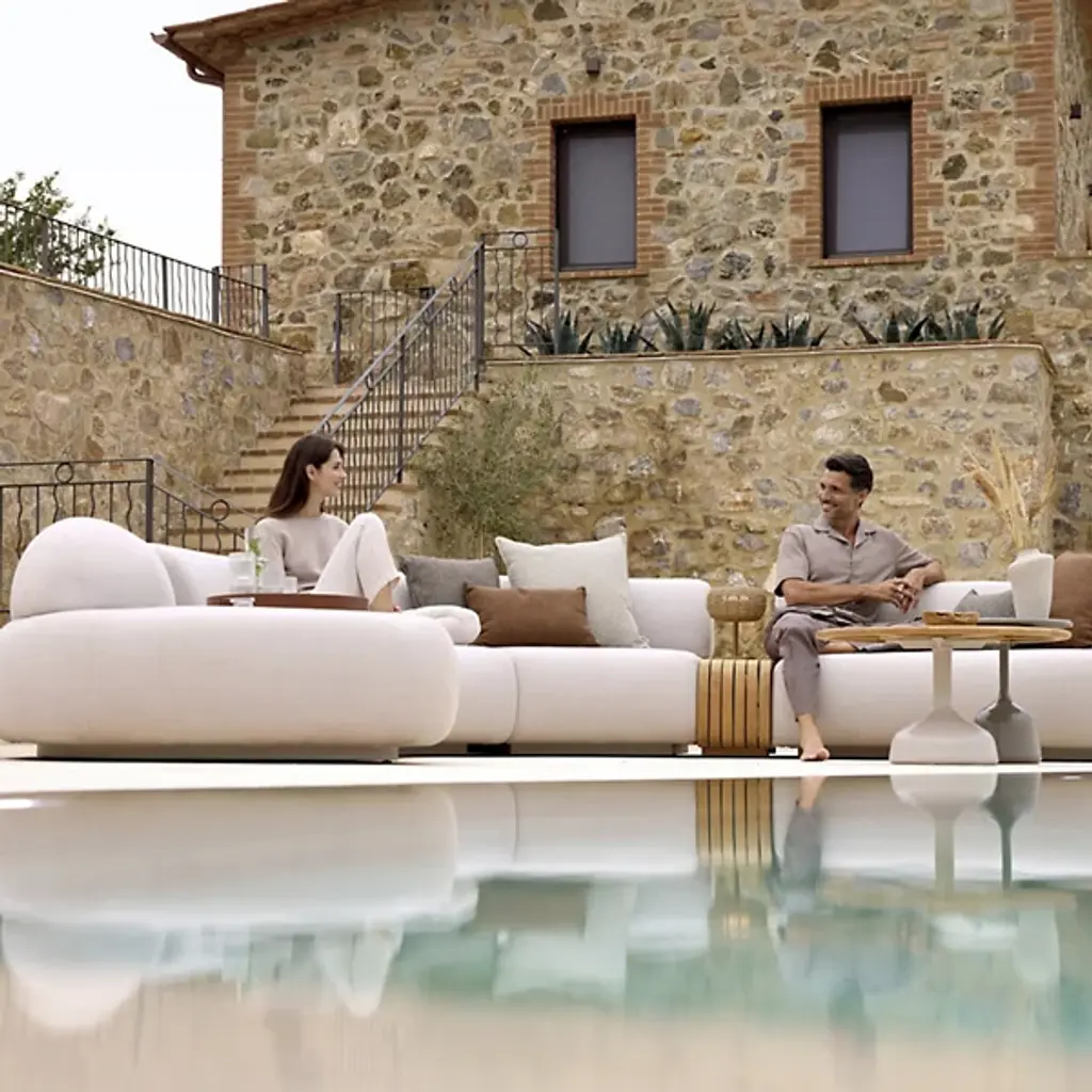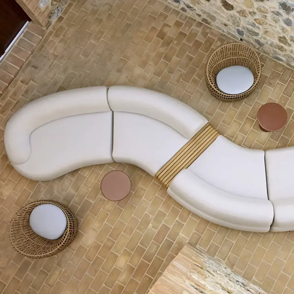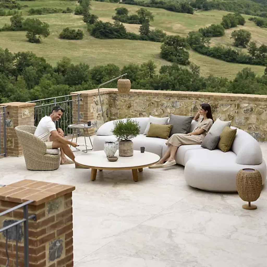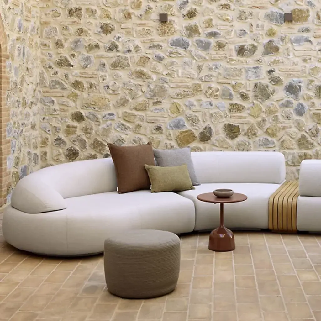 The Mellow Outdoor Short Backrest Module Sofa from Cane-line presents a lower back profile that maintains support while preserving an open feel. This module functions as either an end piece or an intermediate section, offering construction flexibility. The abbreviated backrest allows easy conversation across seating areas while providing lumbar support. Aluminum construction ensures outdoor longevity, while AirTouch fabric manages moisture through quick-drying properties. Airflow channels prevent water retention and promote faster drying after rain exposure. Its compact design suits spaces where maintaining sightlines or creating casual environments matters most.