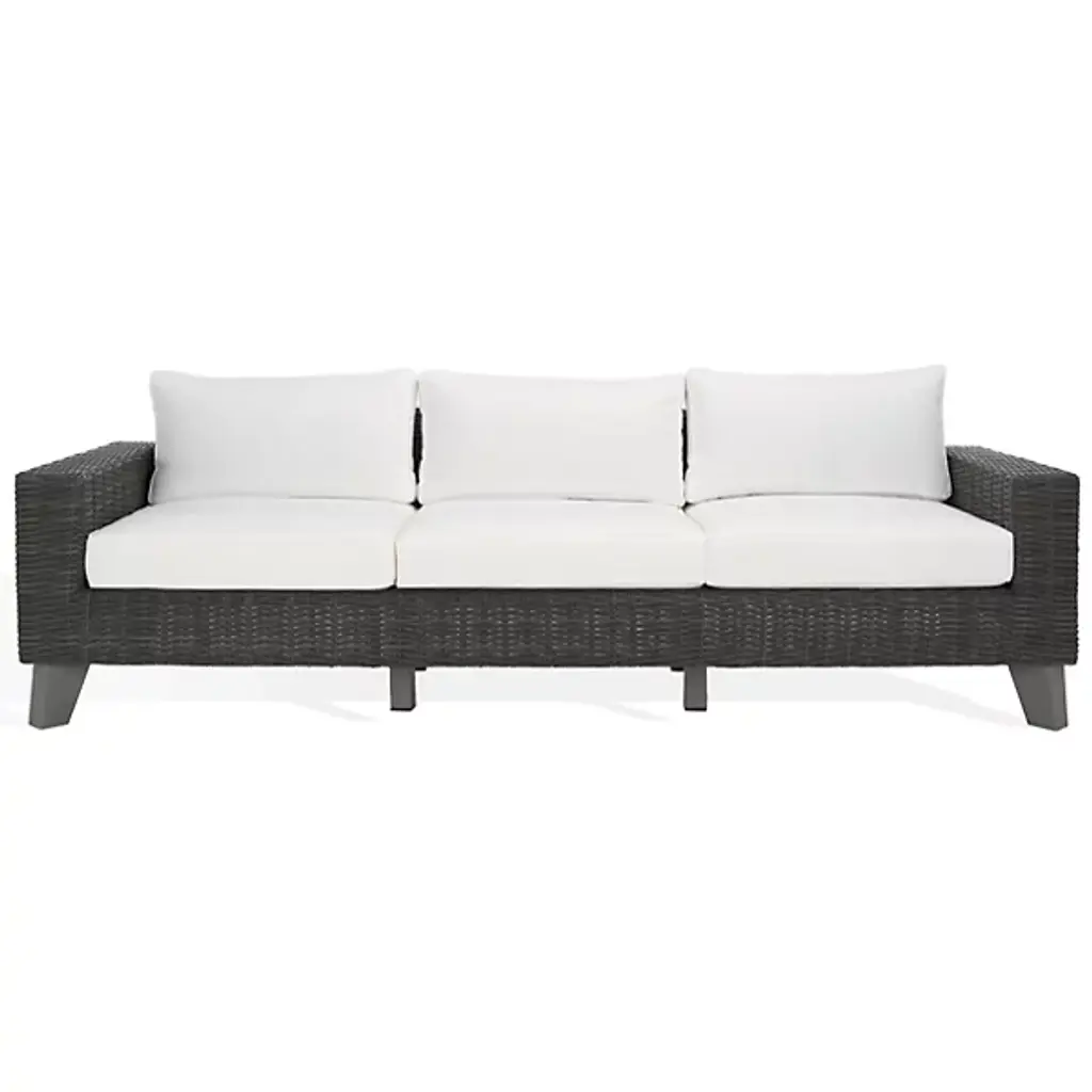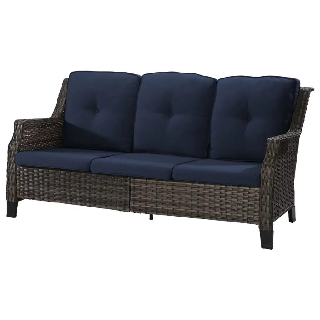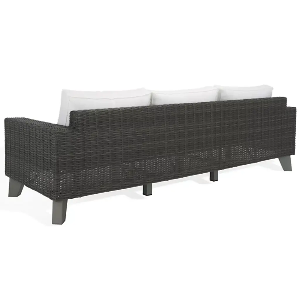 The Melva Wicker Patio Outdoor Sofa from Alder & Ore makes a statement with its intricate PE wicker weave pattern that catches light throughout the day. The metal frame provides a sturdy foundation while maintaining a light visual presence. Performance fabric cushions offer sink-in comfort with quick-drying properties. The sofa's generous proportions accommodate multiple guests without overwhelming outdoor spaces. Wooden feet add a natural element while lifting the piece for improved airflow.