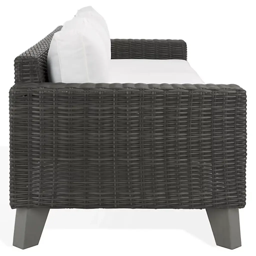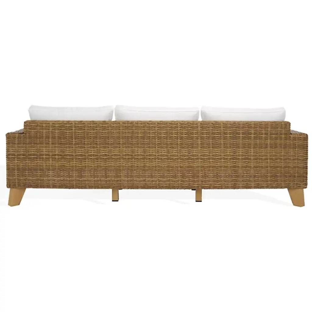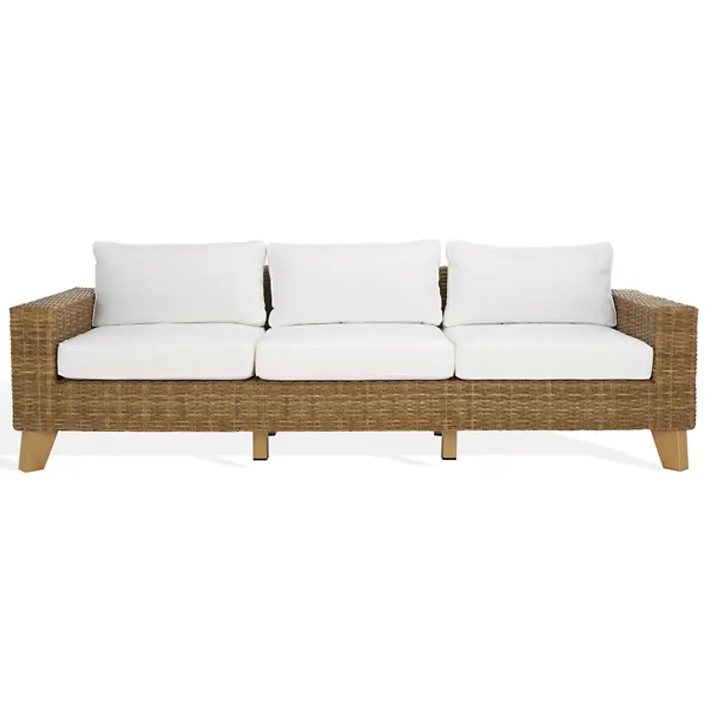 The Melva Wicker Patio Outdoor Sofa from Alder & Ore makes a statement with its intricate PE wicker weave pattern that catches light throughout the day. The metal frame provides a sturdy foundation while maintaining a light visual presence. Performance fabric cushions offer sink-in comfort with quick-drying properties. The sofa's generous proportions accommodate multiple guests without overwhelming outdoor spaces. Wooden feet add a natural element while lifting the piece for improved airflow.
