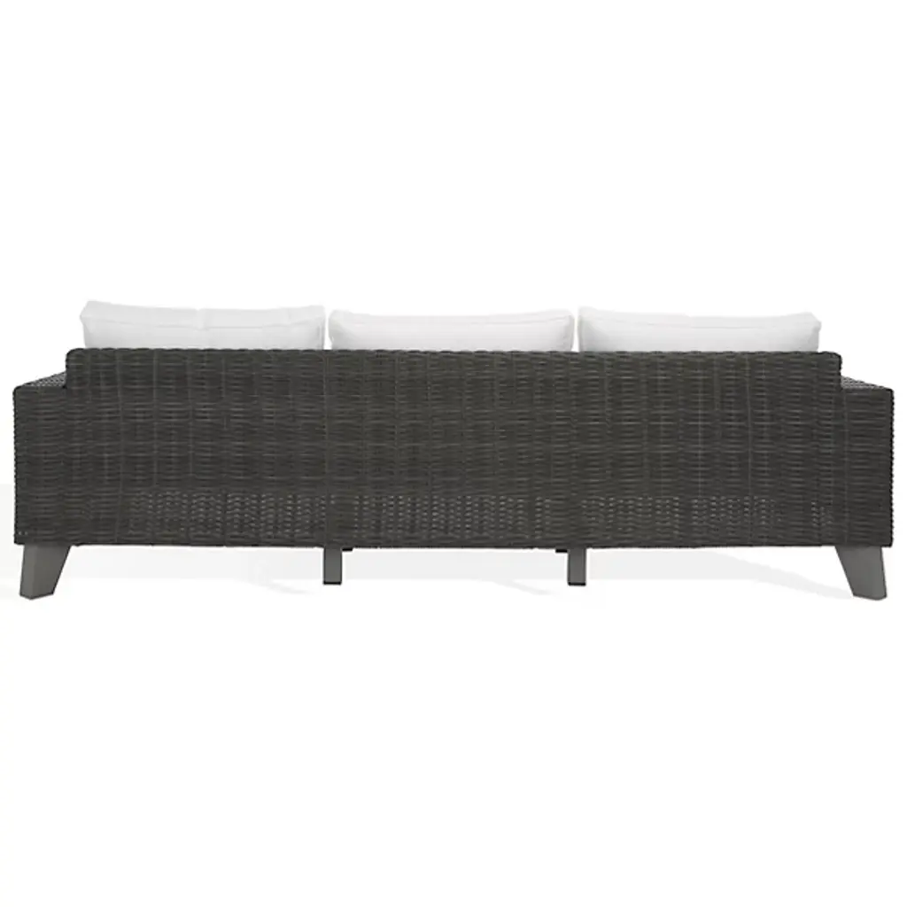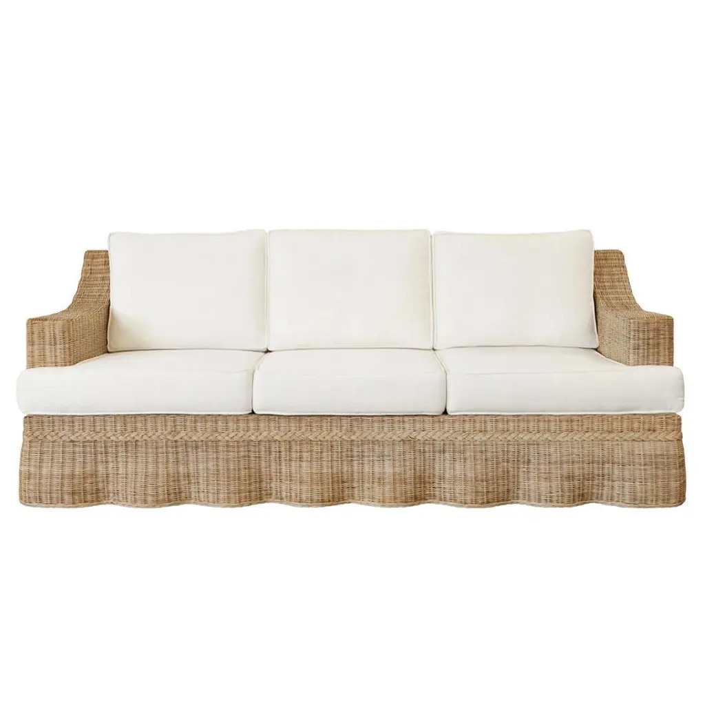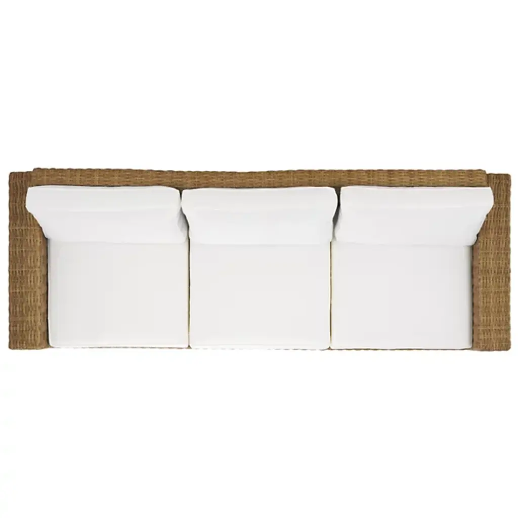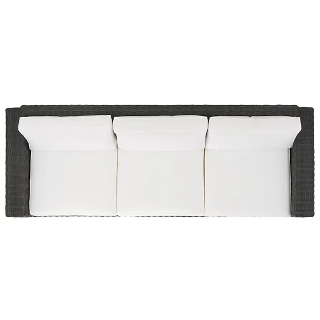 The Melva Wicker Patio Outdoor Sofa from Alder & Ore makes a statement with its intricate PE wicker weave pattern that catches light throughout the day. The metal frame provides a sturdy foundation while maintaining a light visual presence. Performance fabric cushions offer sink-in comfort with quick-drying properties. The sofa's generous proportions accommodate multiple guests without overwhelming outdoor spaces. Wooden feet add a natural element while lifting the piece for improved airflow.