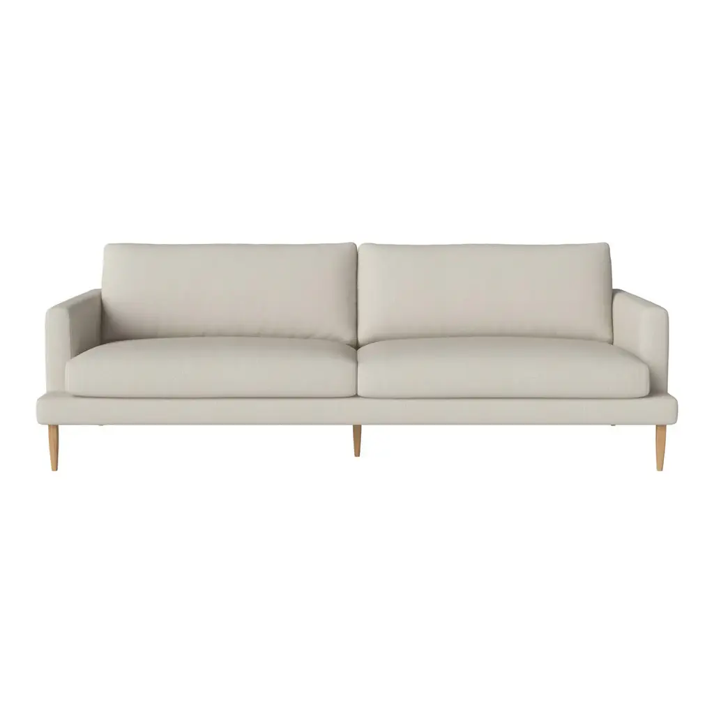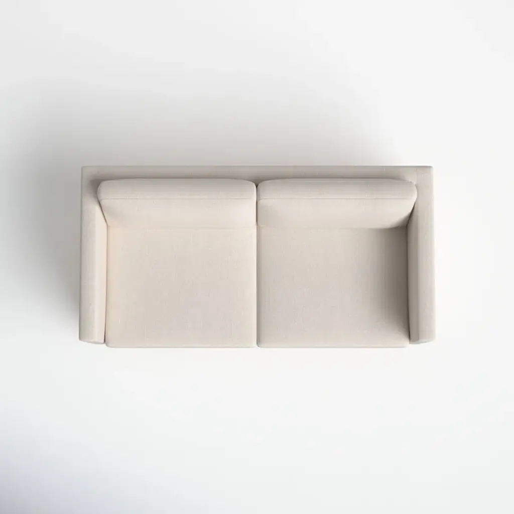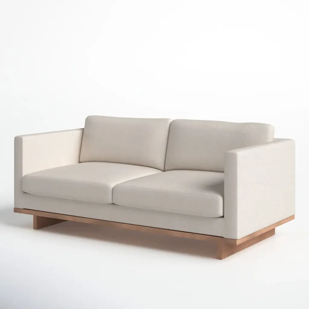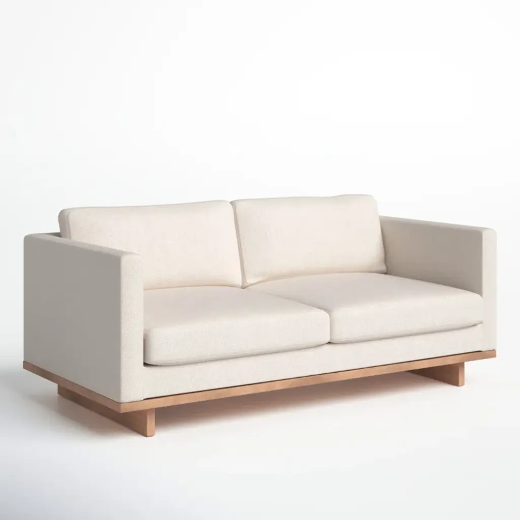 This sofa puts a contemporary twist on a classic design. It's made with a solid wood frame that rests on two wooden, rectangular legs in a natural brown hue. This beige couch is upholstered in a polyester blend, and its foam-and synthetic fiber-filled cushions offer just the right amount of padding. We love how the square arms lend this sofa a modern feel. Plus, the seat and back cushions are removable, so it's a breeze to find that lost remote.