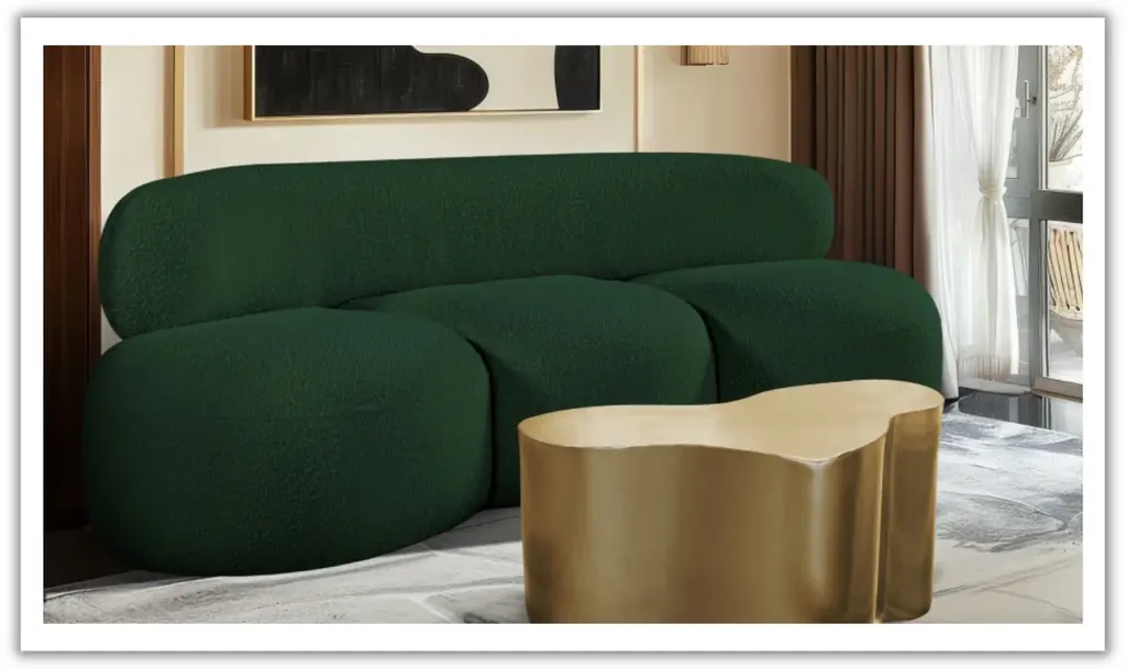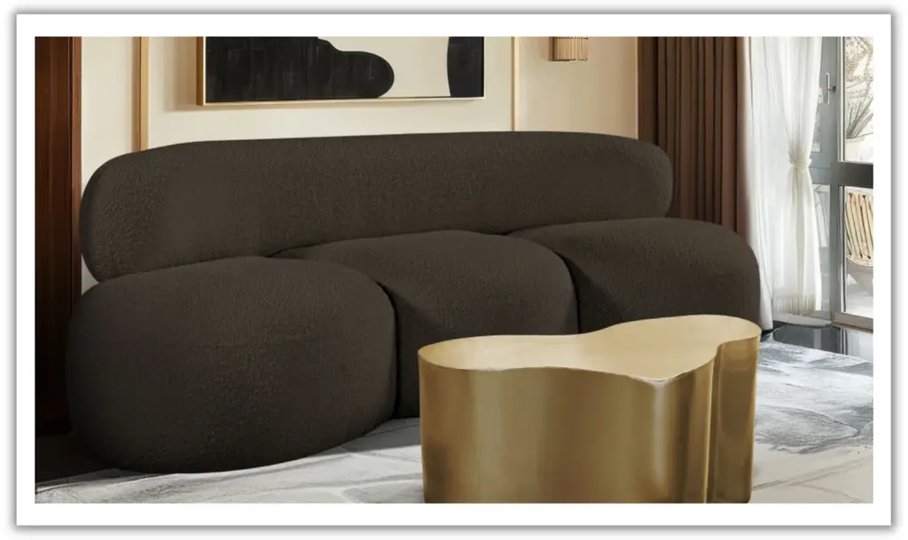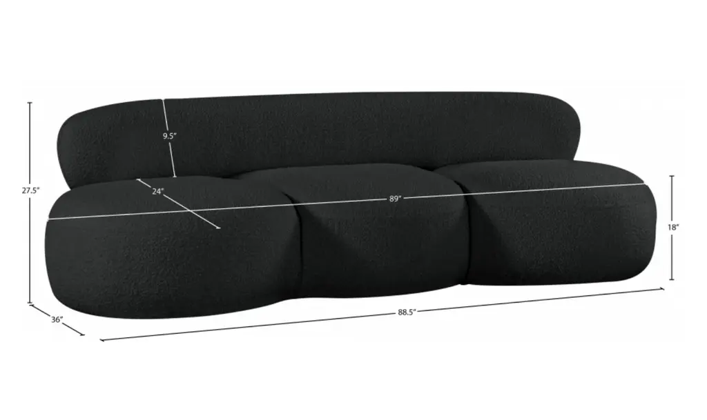The Venti 88 Inches Sofa is built with a distinct Art Deco influence, defined by its smooth, curved frame and low-slung profile. Upholstered in rich black boucle fabric, the texture lends a soft, tactile quality that pairs well with its sculptural form. With generous seat dimensions and dense foam cushioning, this piece delivers consistent support without compromising on visual elegance. The structured silhouette is grounded by eucalyptus wood and plywood framing, ensuring long-term structural stability. Whether placed as a focal point or styled with other pieces from the Venti collection, this sofa offers a balanced blend of statement design and everyday usability. The monochromatic boucle finish enhances its versatility, while the armless design and low back lend it a refined, gallery-like presence. Suitable for contemporary living rooms or curated lounge spaces, it’s a thoughtful combination of form and function