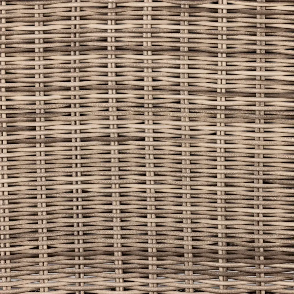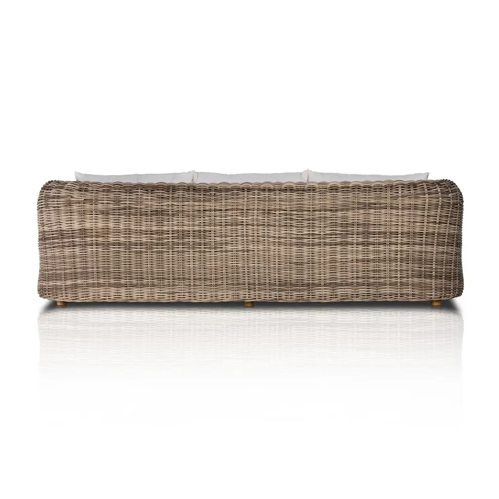 Traditional heritage shape on a grand scale. An outdoor dining sofa is crafted from durable natural teak in a gorgeous, woven pattern highlighting the texture's natural highs and lows. Oversized with deep-seated comfort with loose pillows for the ultimate outdoor lounge. Cover or store indoors during inclement weather and when not in use. Ships In 10-14 Business Days All-weather cushion All-weather woven wicker frame This image is for illustrative purposes only. The colors shown are accurate within the constraints of lighting, photography, and the color accuracy of your screen.