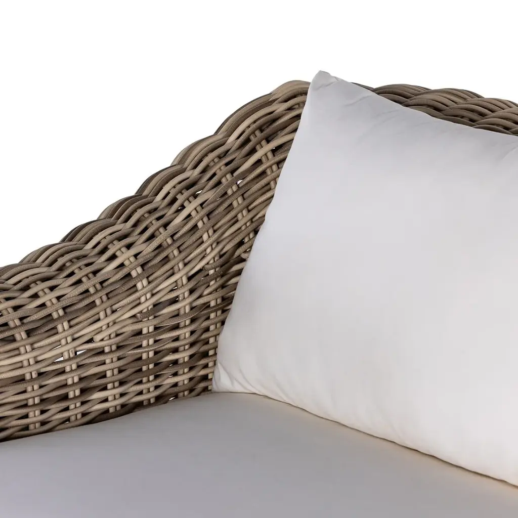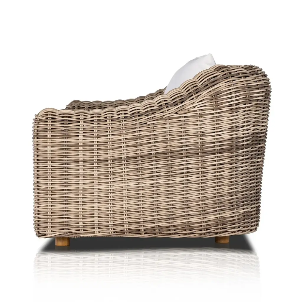 Traditional heritage shape on a grand scale. An outdoor dining sofa is crafted from durable natural teak in a gorgeous, woven pattern highlighting the texture's natural highs and lows. Oversized with deep-seated comfort with loose pillows for the ultimate outdoor lounge. Cover or store indoors during inclement weather and when not in use. Ships In 10-14 Business Days All-weather cushion All-weather woven wicker frame This image is for illustrative purposes only. The colors shown are accurate within the constraints of lighting, photography, and the color accuracy of your screen.