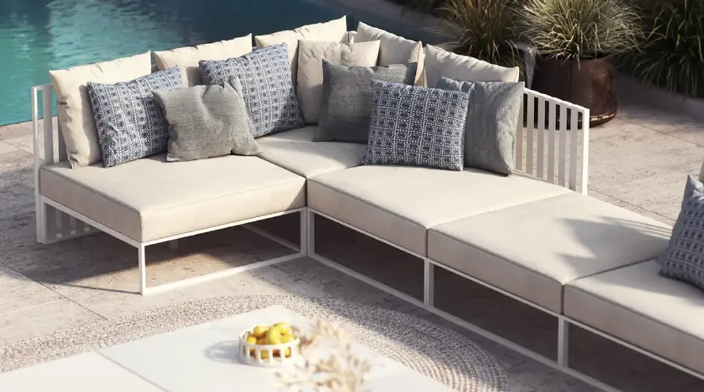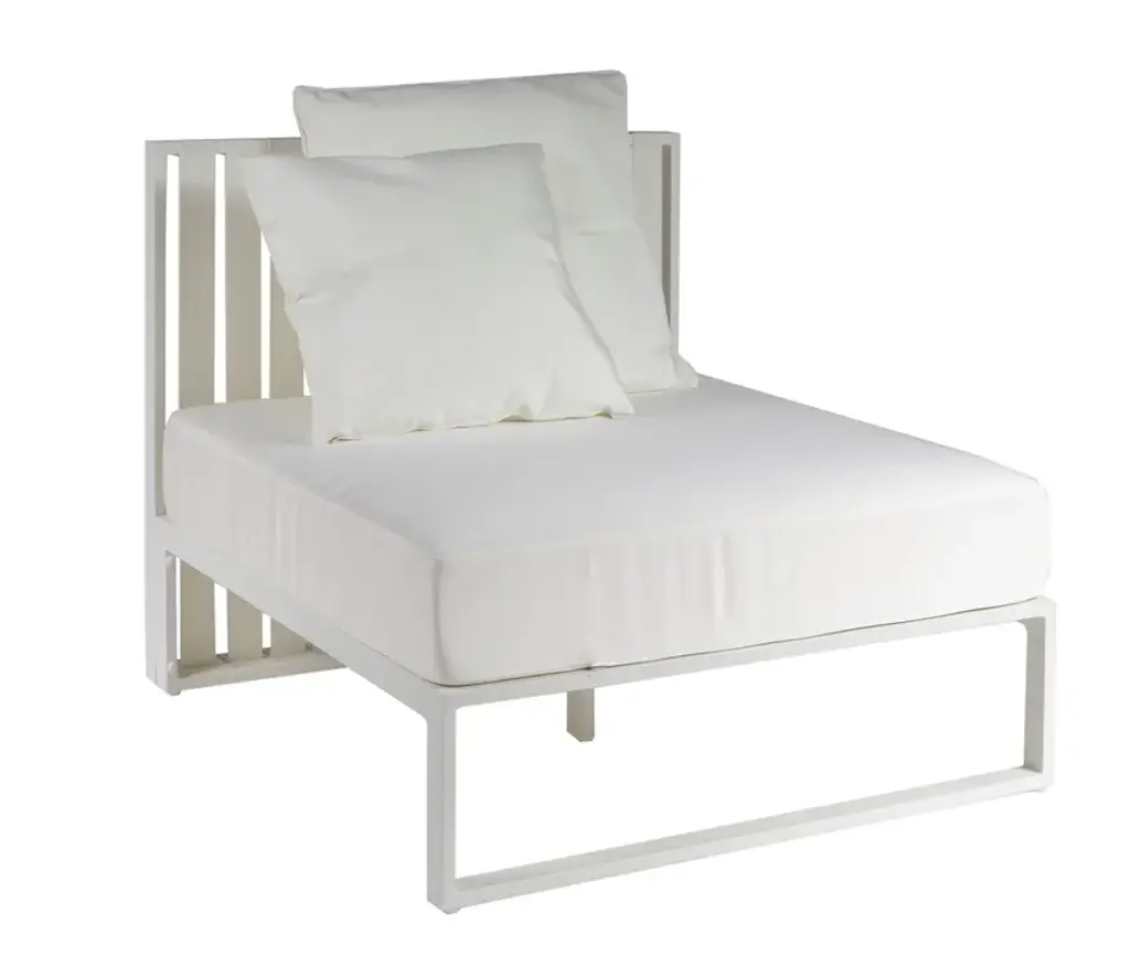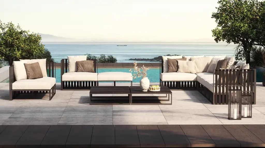 The polished look of Metropolitan shines for its alternation of solids and voids that gives the structure a sense of lightness. Its frame made of epoxy-powder-coated aluminum (with scratch-proof and shockproof properties) is available in white, taupe, and gold color. Polyester bands are coordinated with the frame and available in ice, taupe, and gold color. The wide range of seats and backrests come with a semi-circular or linear structure. The linear choice gives the possibility to create infinite modular configurations. In addition to sofas, armchairs and chairs, the collection includes tables, coffee tables, and sun loungers.