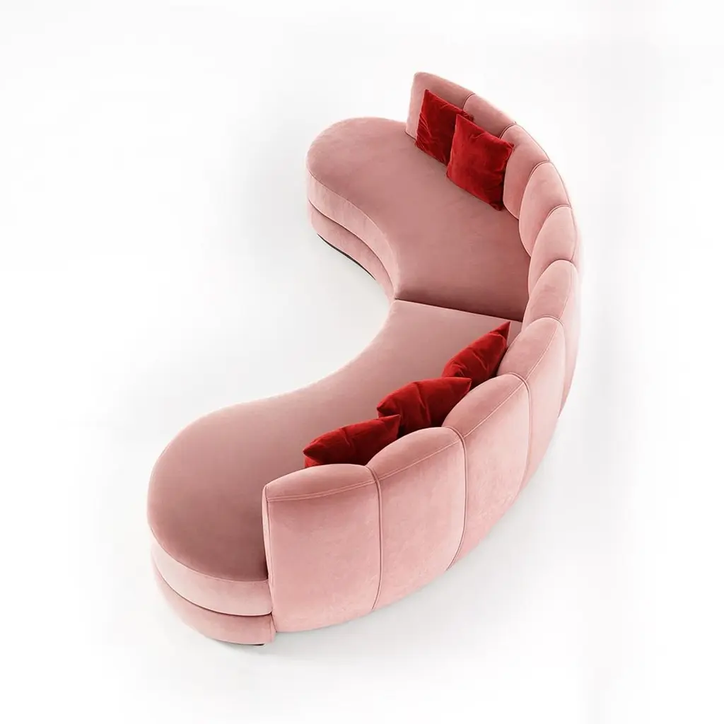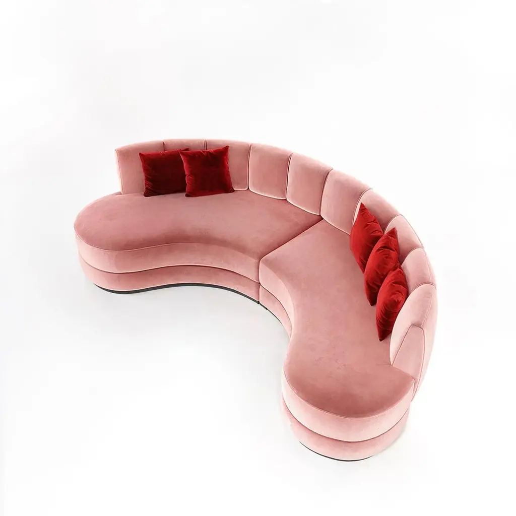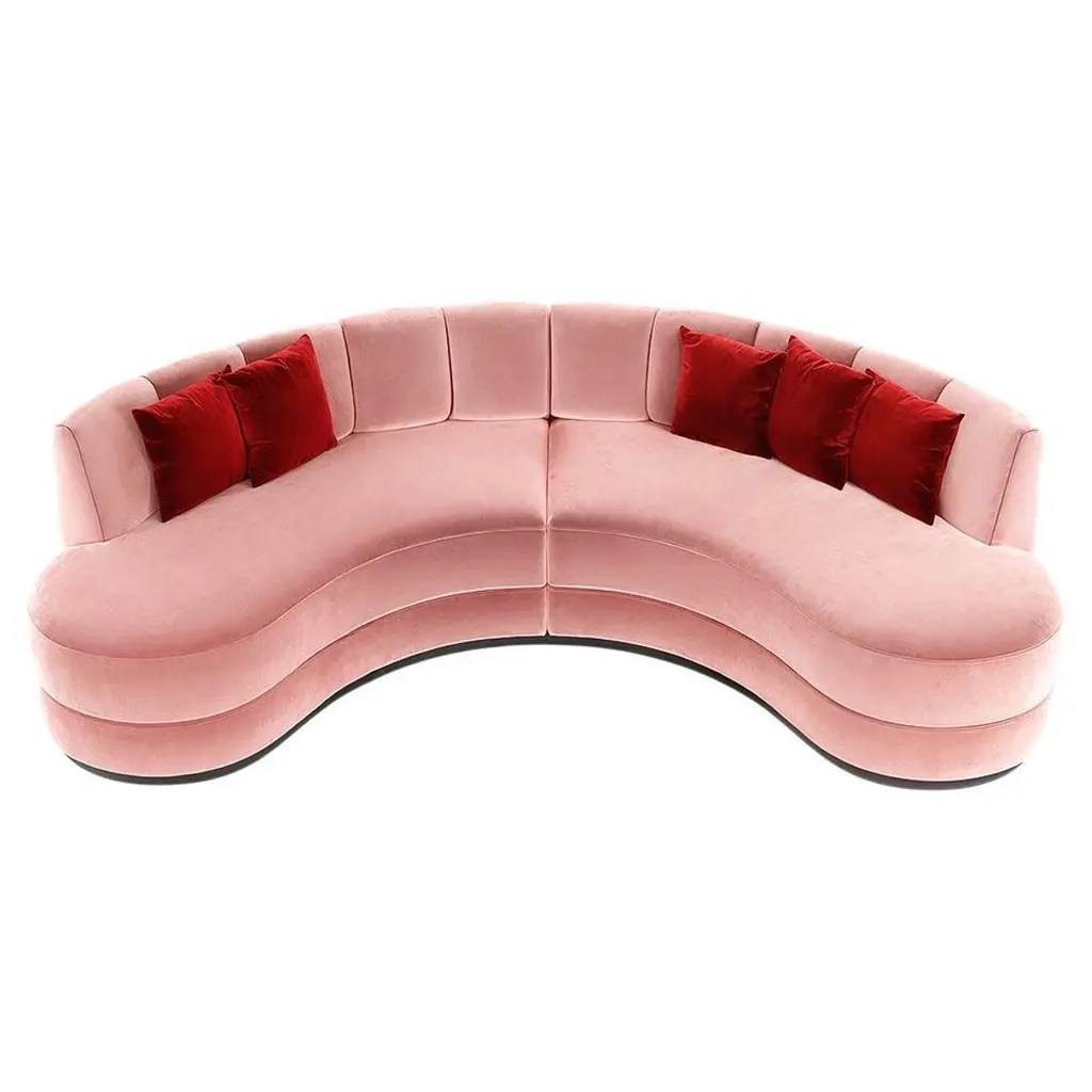 A sculptural interpretation of midcentury modern elegance, this curved sofa is upholstered in pink velvet that adds depth and style to any setting. The tailored silhouette features vertical channel detailing along the backrest and a smooth, triple-layered base that rests on a walnut-finished plinth. Generously padded cushions provide both structure and comfort, making it an ideal centerpiece for sophisticated interiors.This sofa is offered in a variety of velvet colors. The base can be in wood veneer is several colors, or in metal in different color polished or brushed stainless steel. See attached photos for color options. Note: Cushions are not included in the price but can be purchased separately.Finishes:Fabrics: Portofino FR 31Finishes: Matte Walnut Wood Veneer Base3 cushions included COM and COL are also available.Contact us to enquire about COM/COL production, requirements and material shipping instructions.Please contact us if you have any questions about customization and pricing. We will be glad to check with the factory’s technical team if sizes, finishes, and colors can be customized. We do our best to expedite production and to ship and deliver product within the listed lead time, however current lead times might be longer due to global shipping backlog and delays. These delays are out of our control and cannot be a reason to cancel an order.Our pricing includes all costs for international shipping to the U.S., as well as duties and customs clearance fees. Please be aware that local delivery within the U.S. is not included. We offer white glove, front door, and warehouse delivery options. For shipments outside the U.S., kindly reach out to us for a detailed quote.
