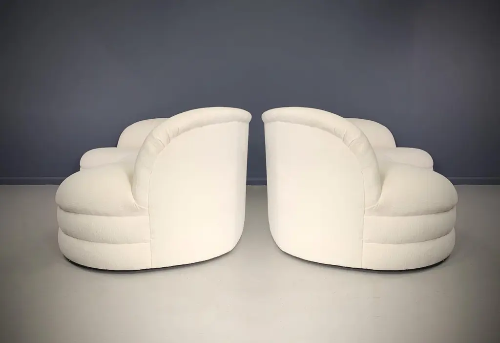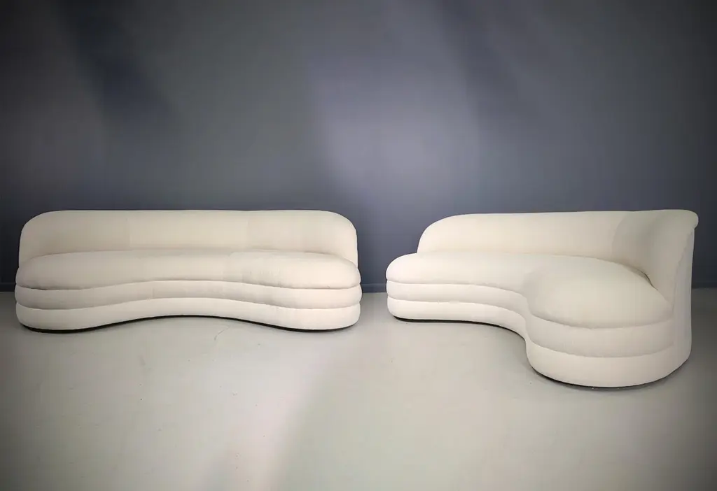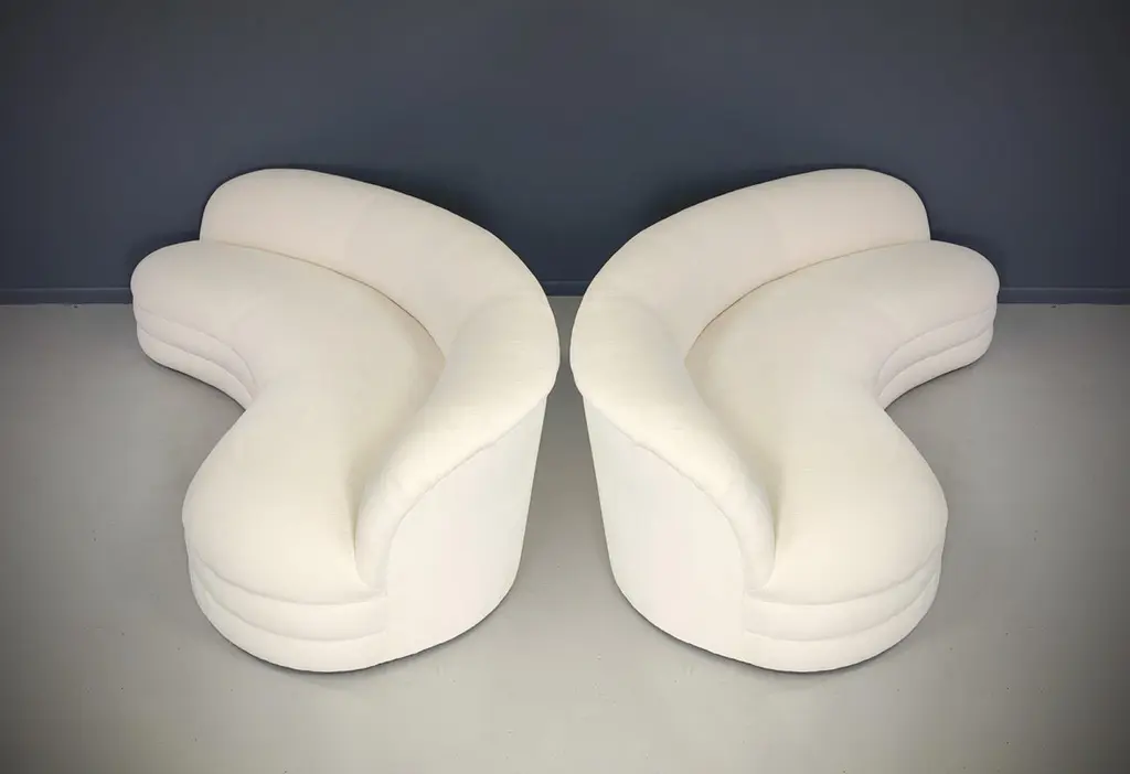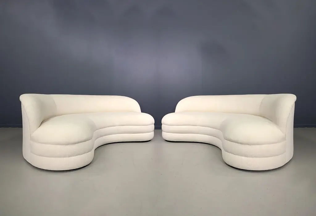 A pair of kidney-shaped sofas feature a nice sculptural modern design, with a curved arched back. These sofas are newly produced and have been handcrafted with a solid hardwood frame, manufactured in the United States with an 8 to 10 week turnaround. We have finished them in a beautiful textured white velvet. Your choice of fabric is an optionThis listing is for a pair of sofas only, please see my other listing for a single sofa.Measures: 84" W x 47" D x 30" H. Seat height is 18".