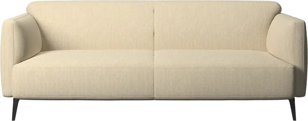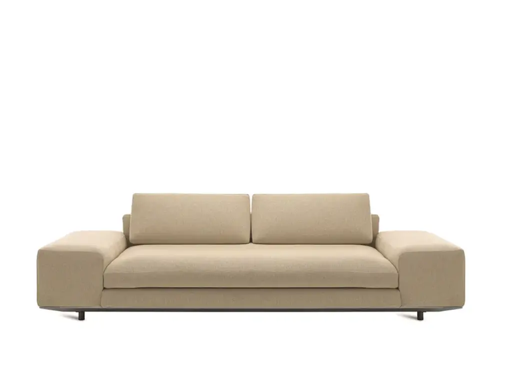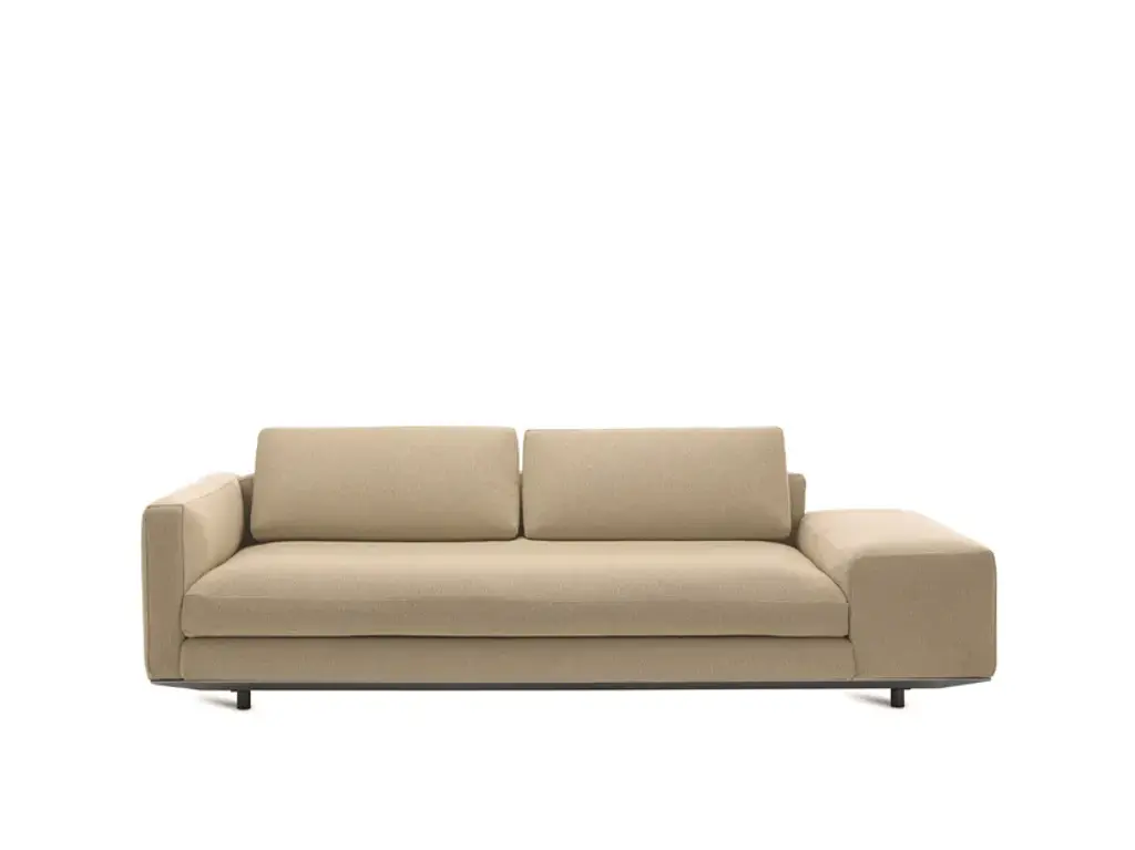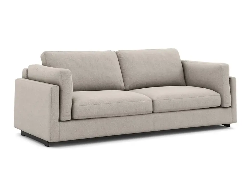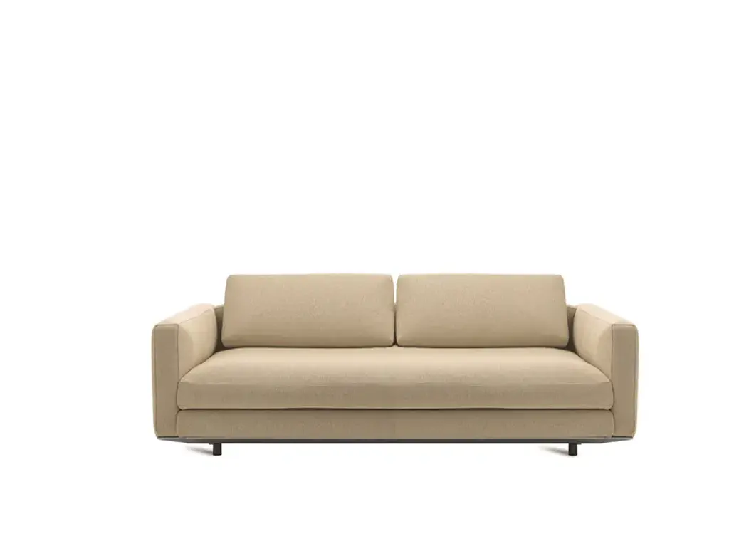 Miles is a fabric sofa, also available in leather or eco-leather.Miles features two thin cushions, resting on an upholstered and straped base, with hidden aluminium foot (7cm), and is available in two seat depths: 90 or 105cm. Backrests and armrests structure made of solid wood and plywood covered with variable density polyurethane foam.Seat cushions in non-deformable, high-resilience, and variable density polyurethane foam. They rest on high rubber content elastic webbing inserted in the aluminium frame.Back cushions in high resilience, variable density polyurethane foam.To facilitate removal of the covers, the armrests and backrests can be removed from the frame by means of a quick coupling and release system.Aluminium frame and feet, finish: polished, bronze, brick