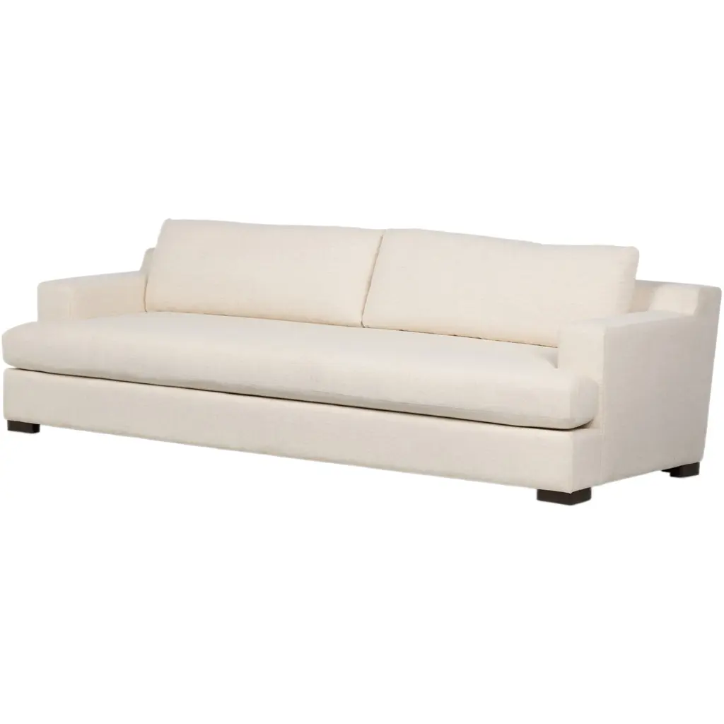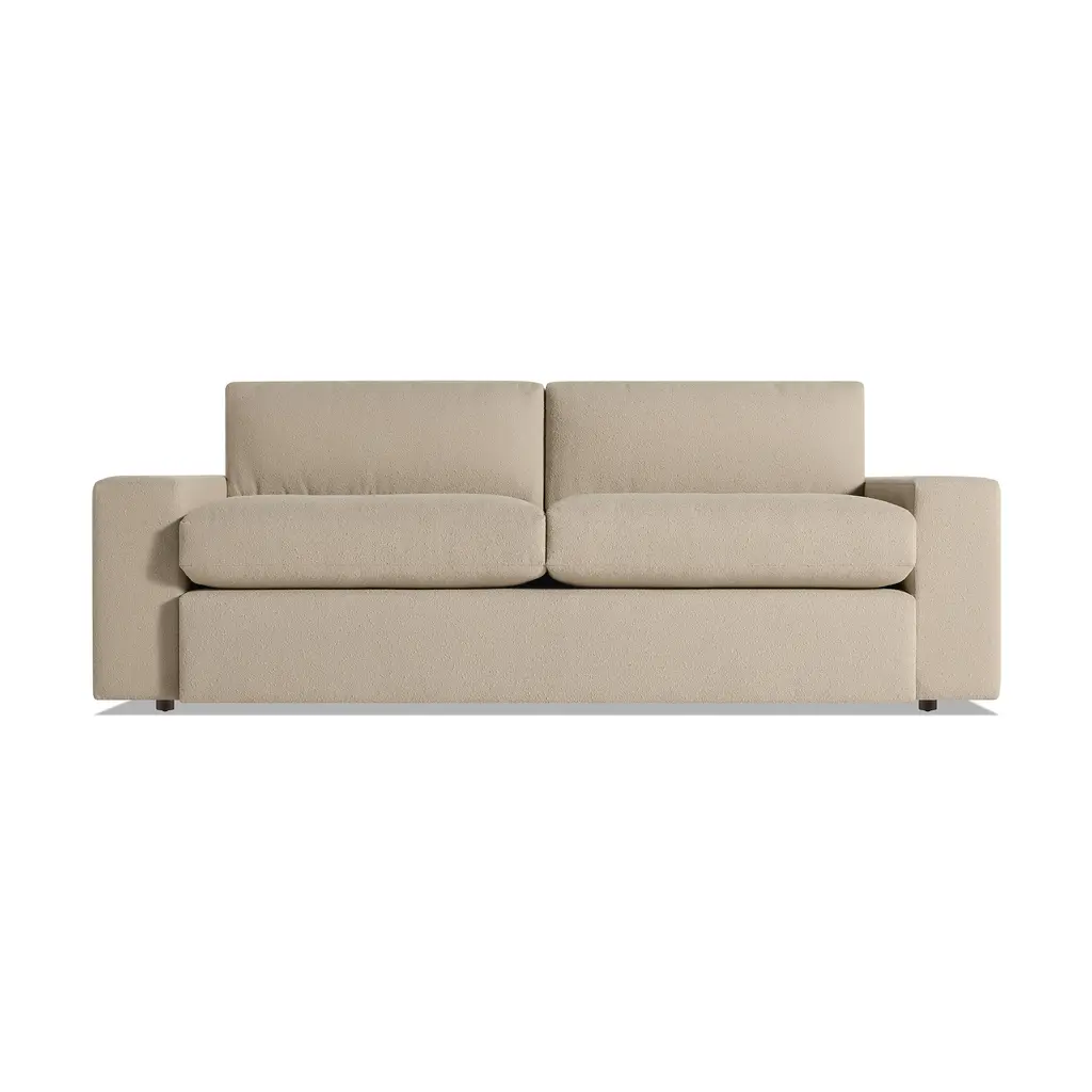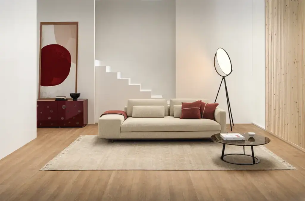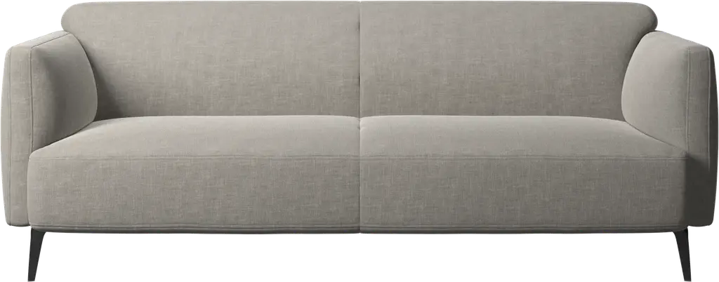 Miles is a fabric sofa, also available in leather or eco-leather.Miles features two thin cushions, resting on an upholstered and straped base, with hidden aluminium foot (7cm), and is available in two seat depths: 90 or 105cm. Backrests and armrests structure made of solid wood and plywood covered with variable density polyurethane foam.Seat cushions in non-deformable, high-resilience, and variable density polyurethane foam. They rest on high rubber content elastic webbing inserted in the aluminium frame.Back cushions in high resilience, variable density polyurethane foam.To facilitate removal of the covers, the armrests and backrests can be removed from the frame by means of a quick coupling and release system.Aluminium frame and feet, finish: polished, bronze, brick