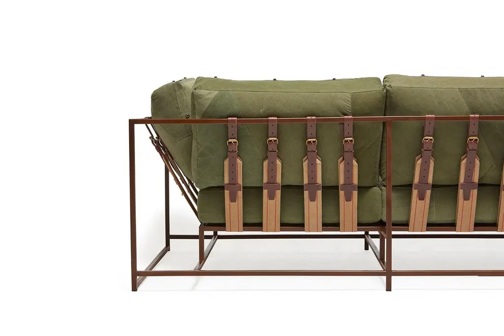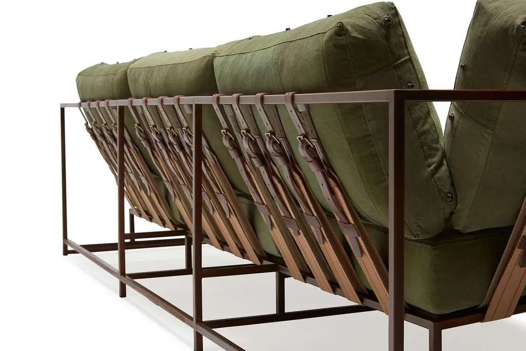 Conceived in 2011, this sofa design was the first piece in The Inheritance Collection by Stephen Kenn. Beginning from a place of curiosity about how furniture was constructed, the collection is a result of reimagining typical upholstered seating.Since first designing Inheritance Collection, Stephen Kenn has been inspired by the inherent history in vintage military-issue materials. Each piece of vintage olive green military canvas is distinctive and will have unique markings from its long history of use. The foam seat cushions have been wrapped in polyfiber, allowing for a soft and comfortable lounge experience. Sitting atop an antique copper plated steel frame, the piece has support belts featuring Swiss Military style cotton webbing of a deep tan with dual red striping, oxblood leather, and antique brass buckles.Every Stephen Kenn piece is made to order through our Los Angeles studio. We create these pieces utilizing a number of small businesses and fabricators in the LA area. We welcome inquiries about custom dimensions or custom material combinations to best fit your space and personal aesthetic.