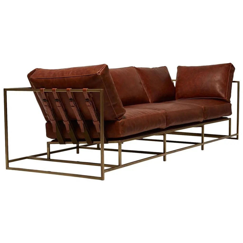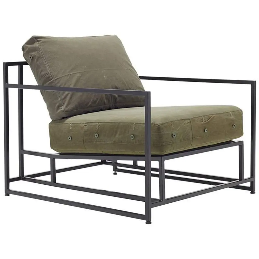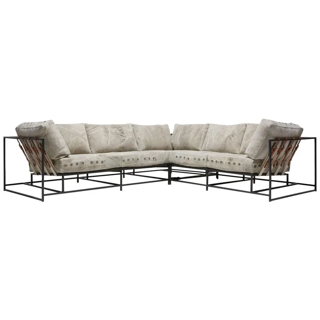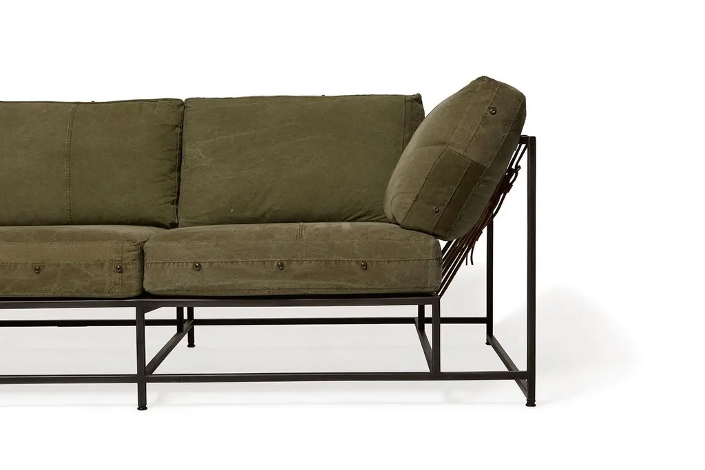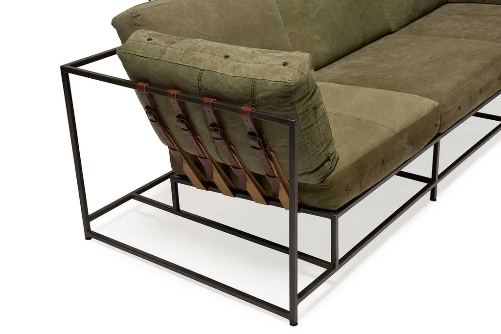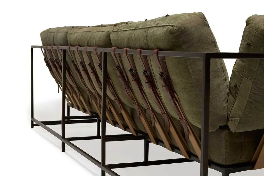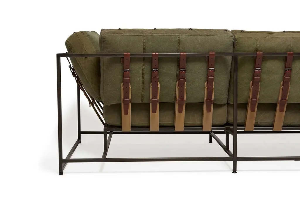 Conceived in 2011, this sofa design was the first piece in The Inheritance Collection by Stephen Kenn. Beginning from a place of curiosity about how furniture was constructed, the collection is a result of reimagining typical upholstered seating.Since first designing Inheritance Collection, Stephen Kenn has been inspired by the inherent history in vintage military-issue materials. Each piece of vintage olive green military canvas is distinctive and will have unique markings from its long history of use. The foam seat cushions have been wrapped in polyfiber, allowing for a soft and comfortable lounge experience. Sitting atop a blackened steel frame, the piece has support belts featuring taupe cotton webbing, oxblood leather, and blackened steel buckles.Every Stephen Kenn piece is made to order through our Los Angeles studio. We create these pieces utilizing a number of small businesses and fabricators in the LA area. We welcome inquiries about custom dimensions or custom material combinations to best fit your space and personal aesthetic.