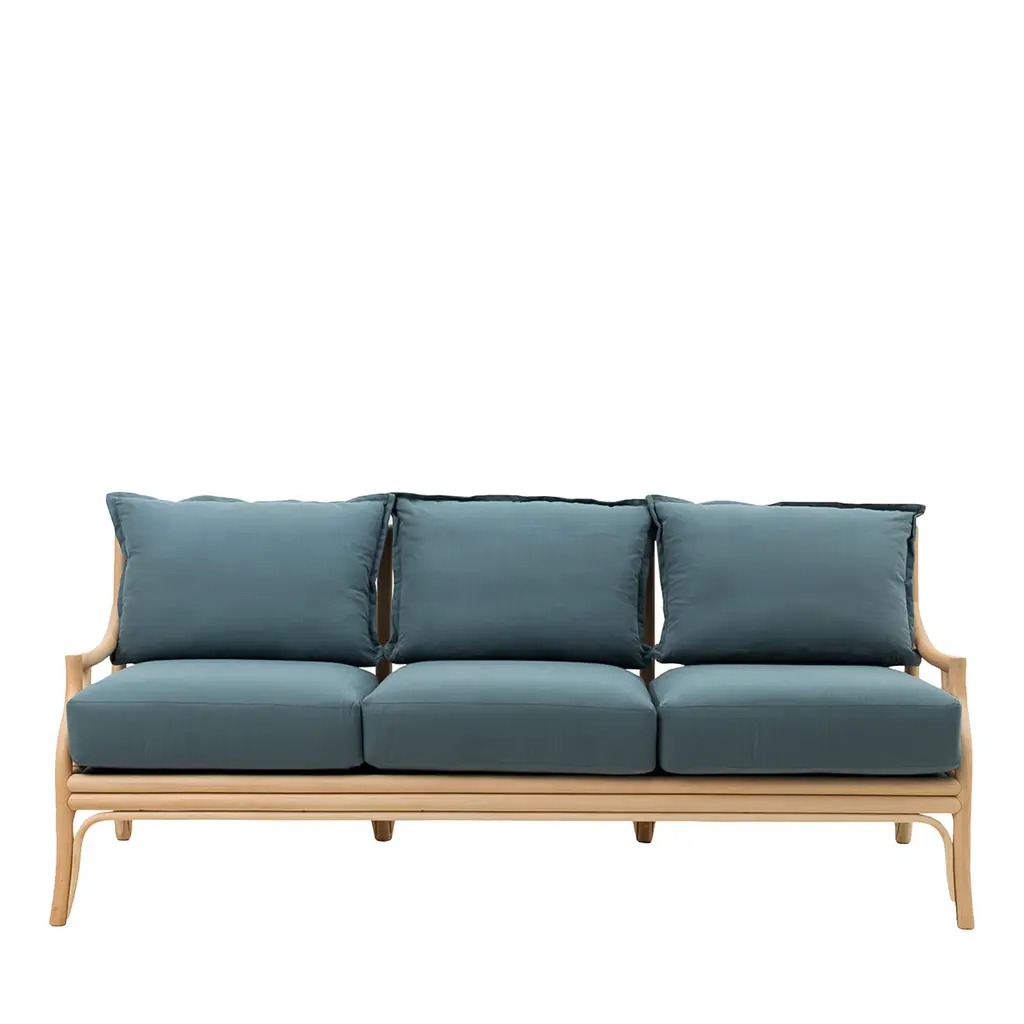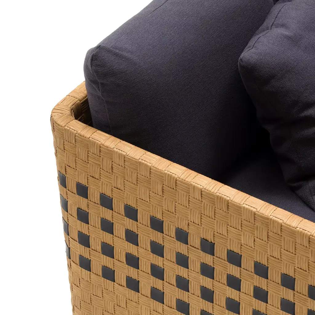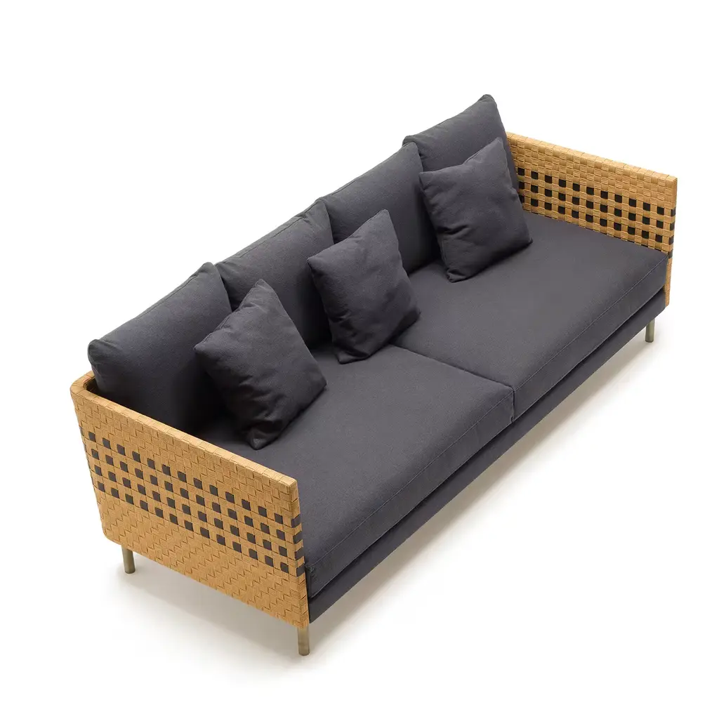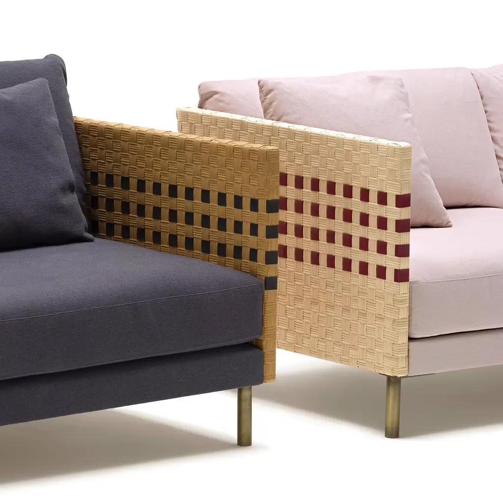 This generously sized sofa features armrests crafted from alternating rattan and leather strips, inspired by a traditional regional woven motif, reinterpreted here for indoor use. The corners showcase intricate detailing, tapering from five to three strips. Available in three customizable sizes and a range of leather and fabric color combinations. Please contact the concierge for more details.