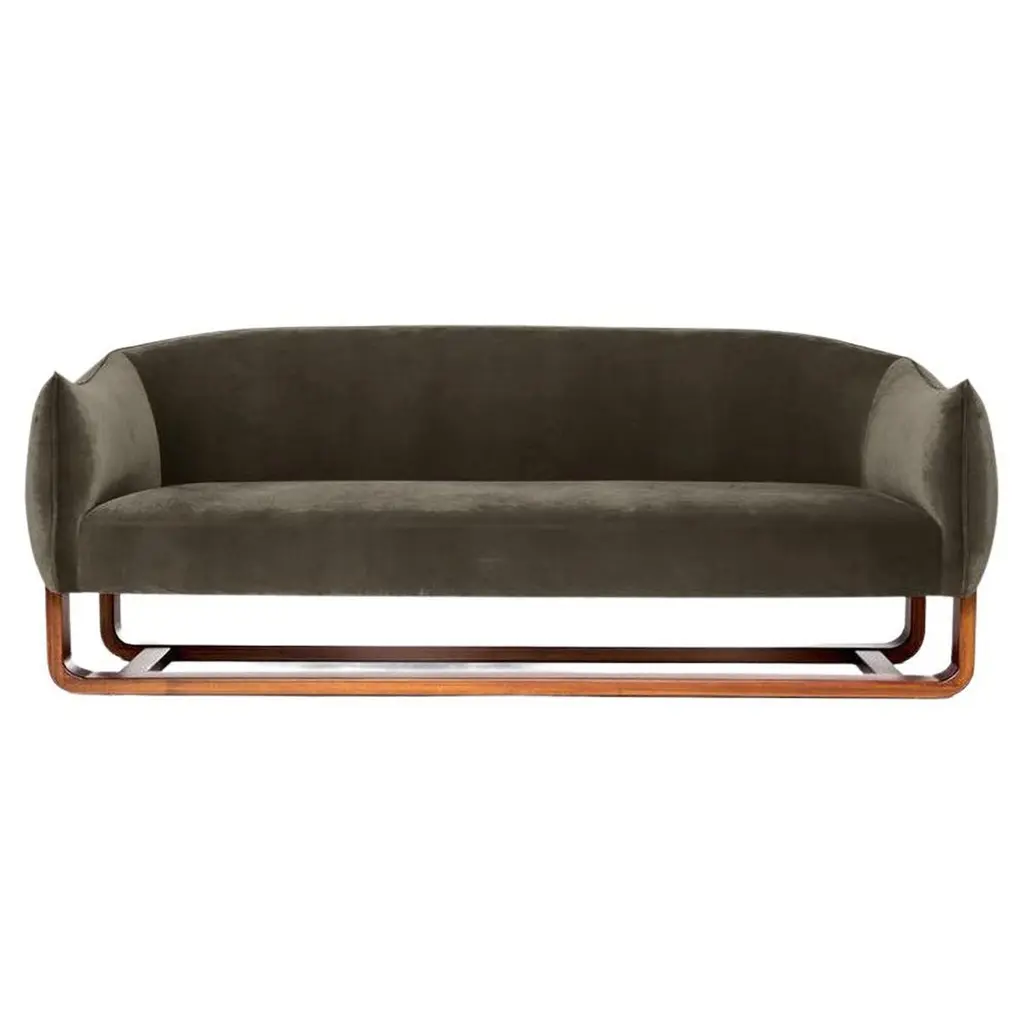 Designer Marie Burgos has expanded on the design concept for her acclaimed Milo lounge chair and created the newly introduced Milo sofa. She uses a molded wooden frame to support the luxuriously comfortable seating that is covered in any of a wide selection of fabrics, including the red velvet shown here. The tailored contemporary style is designed to compliment room settings in virtually any style from traditional to Minimalist modern.Structure: Handcrafted wooden frame Finish: Variety of Fabrics with leather handle.COM available.