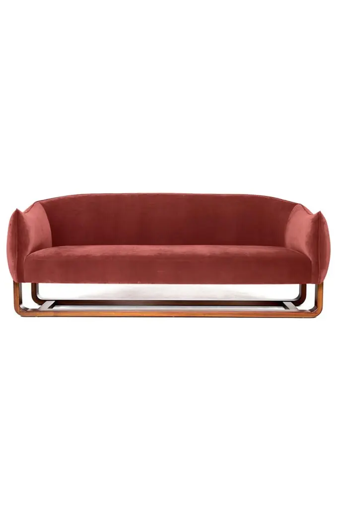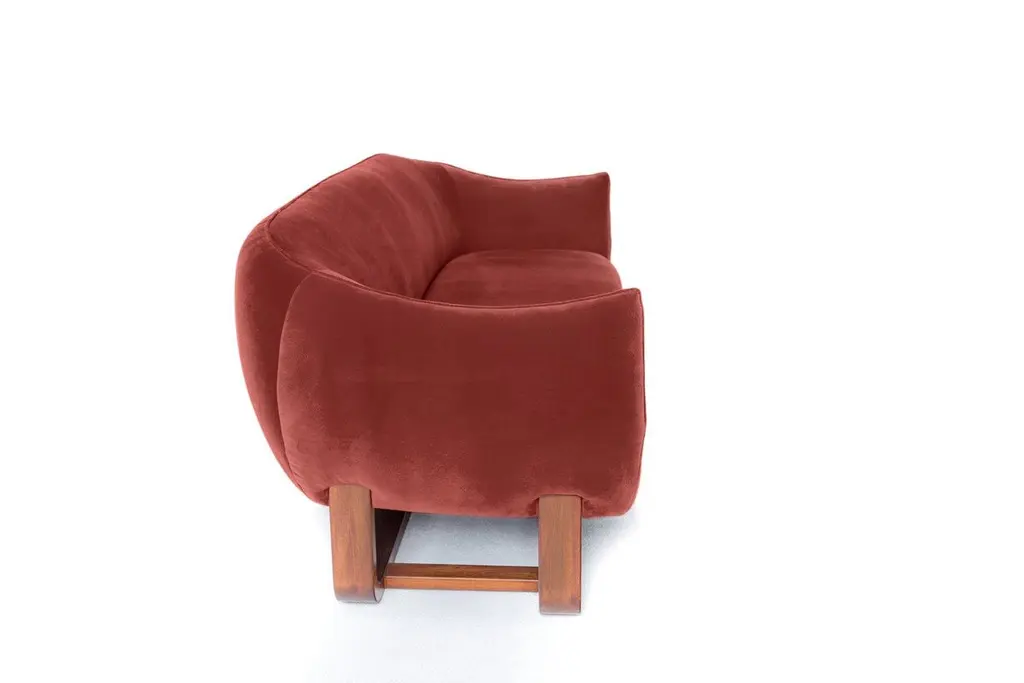 Designer Marie Burgos has expanded on the design concept for her acclaimed Milo lounge chair and created the newly introduced Milo sofa. She uses a molded wooden frame to support the luxuriously comfortable seating that is covered in any of a wide selection of fabrics, including the red velvet shown here. The tailored contemporary style is designed to compliment room settings in virtually any style from traditional to Minimalist modern.Structure: Handcrafted wooden frame Finish: Variety of Fabrics with leather handle.COM available.