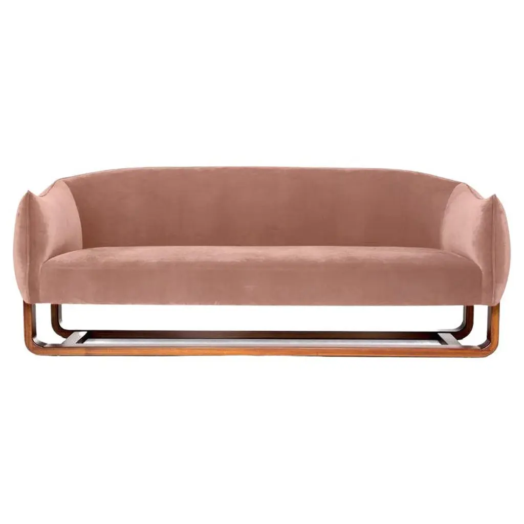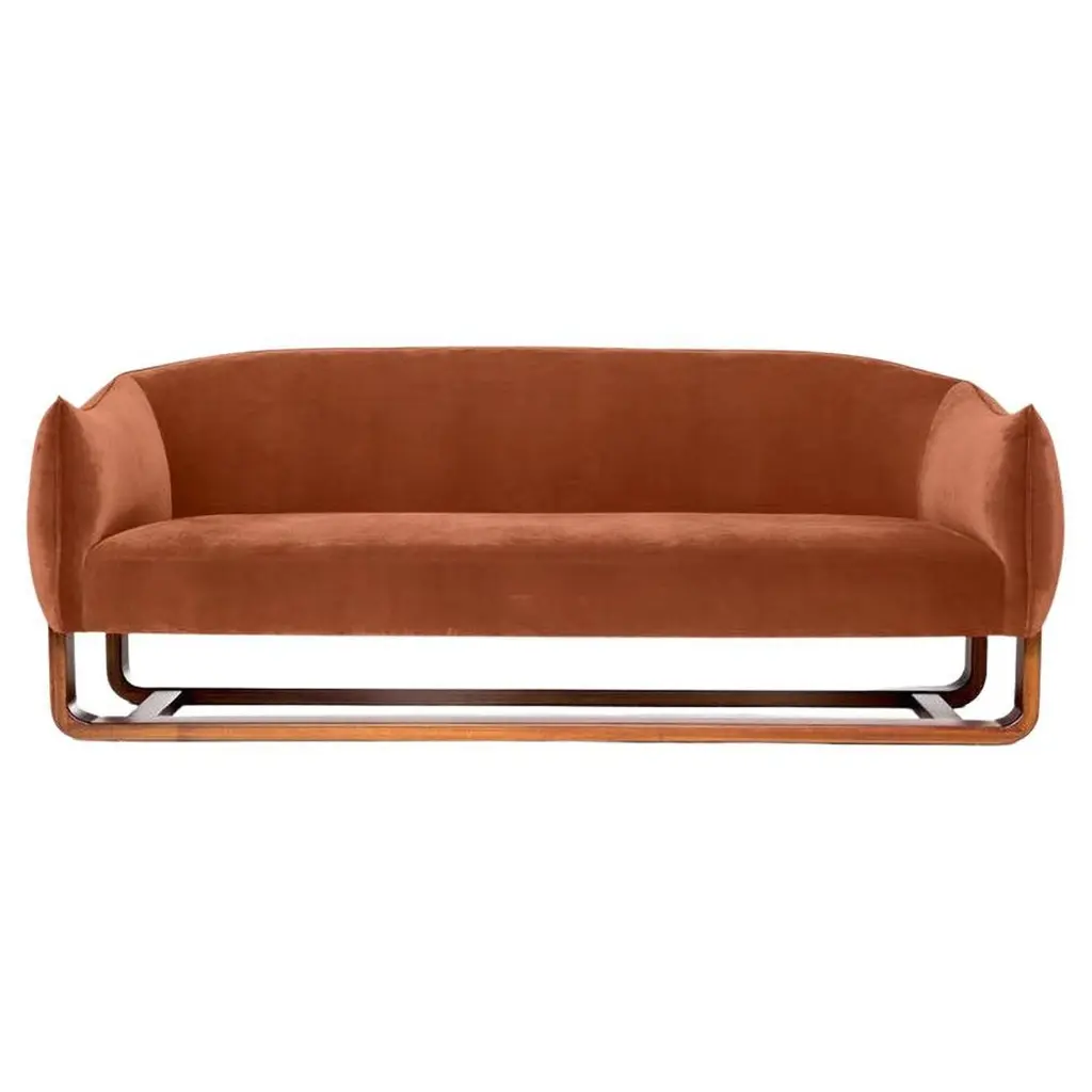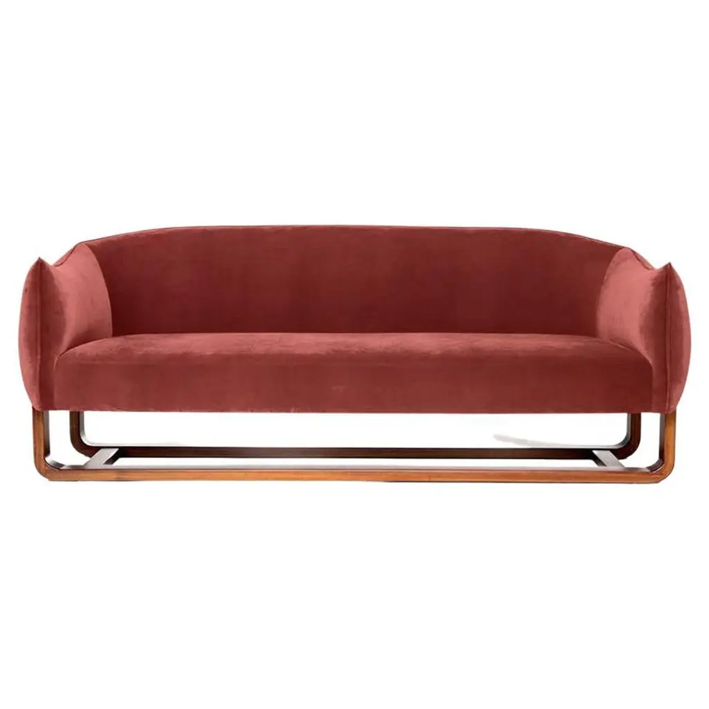 Designer Marie Burgos has expanded on the design concept for her acclaimed Milo lounge chair and created the newly introduced Milo sofa. She uses a molded wooden frame to support the luxuriously comfortable seating that is covered in any of a wide selection of fabrics, including the red velvet shown here. The tailored contemporary style is designed to compliment room settings in virtually any style from traditional to minimalist modern.Structure: Handcrafted wooden frame Finish: Variety of Fabrics with leather handle.COM available.