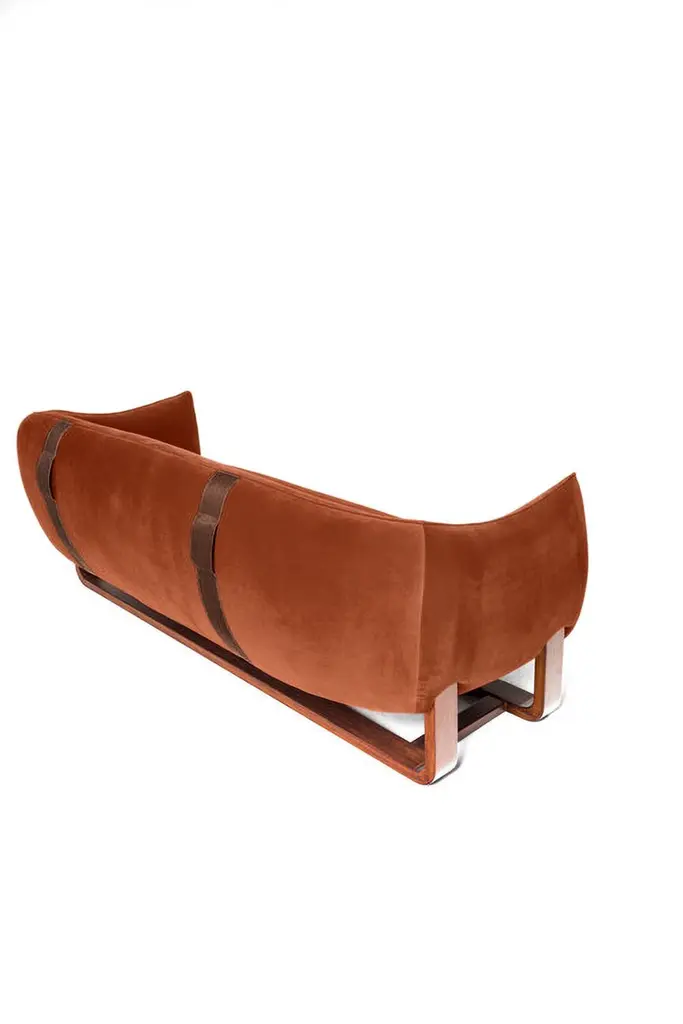 Designer Marie Burgos has expanded on the design concept for her acclaimed Milo lounge chair and created the newly introduced Milo sofa. She uses a molded wooden frame to support the luxuriously comfortable seating that is covered in any of a wide selection of fabrics, including the red velvet shown here. The tailored contemporary style is designed to compliment room settings in virtually any style from traditional to minimalist modern.Structure: Handcrafted wooden frame Finish: Variety of Fabrics with leather handle.COM available.
