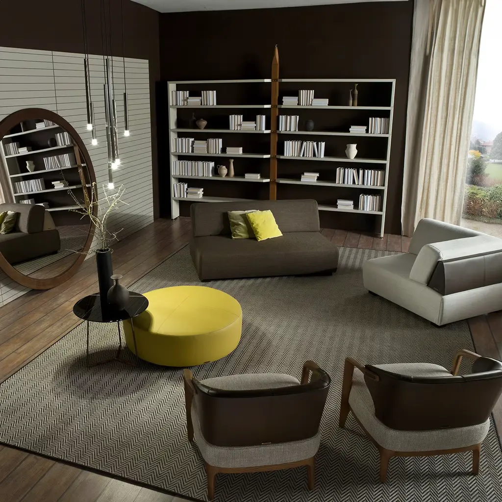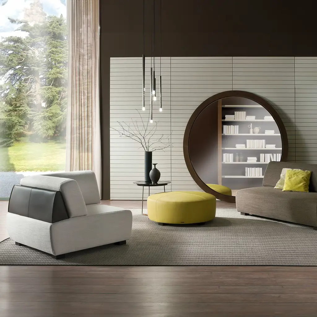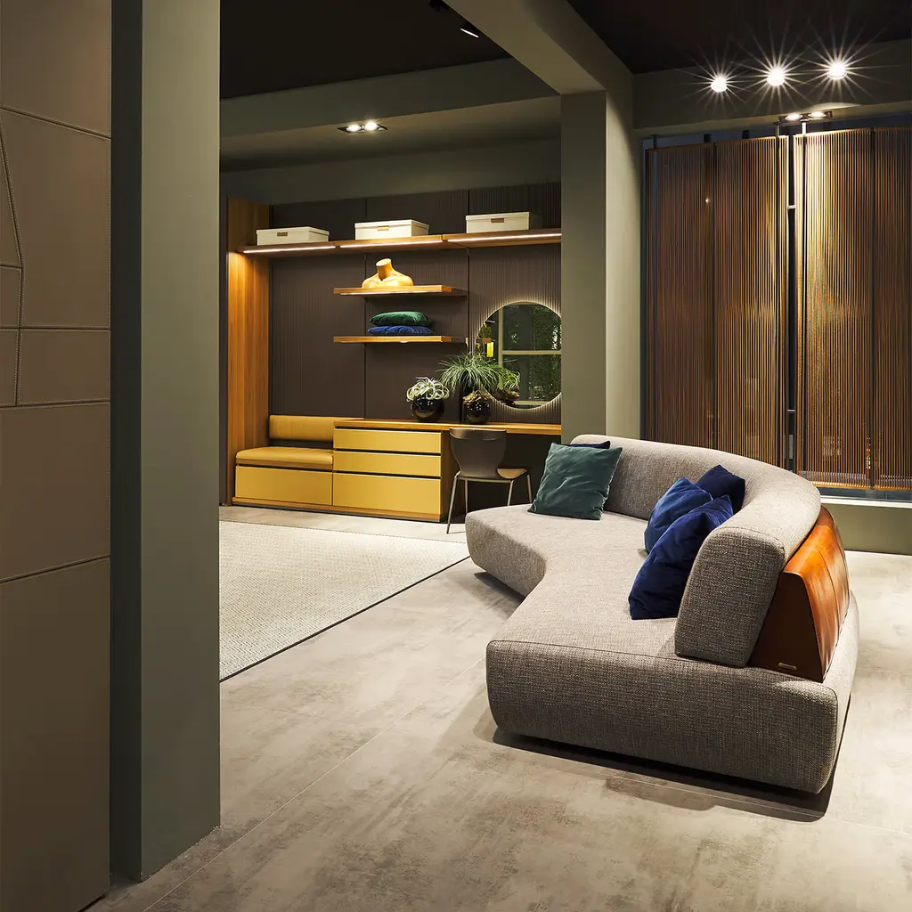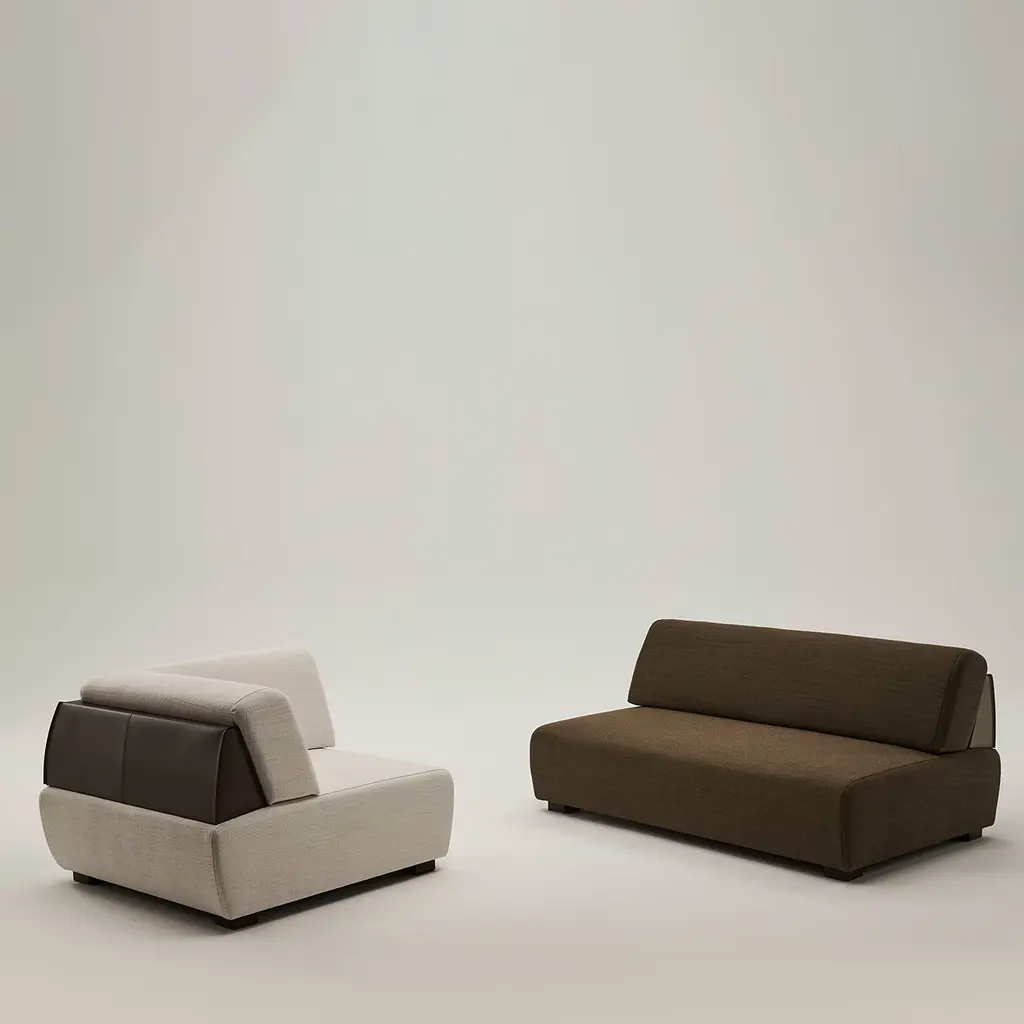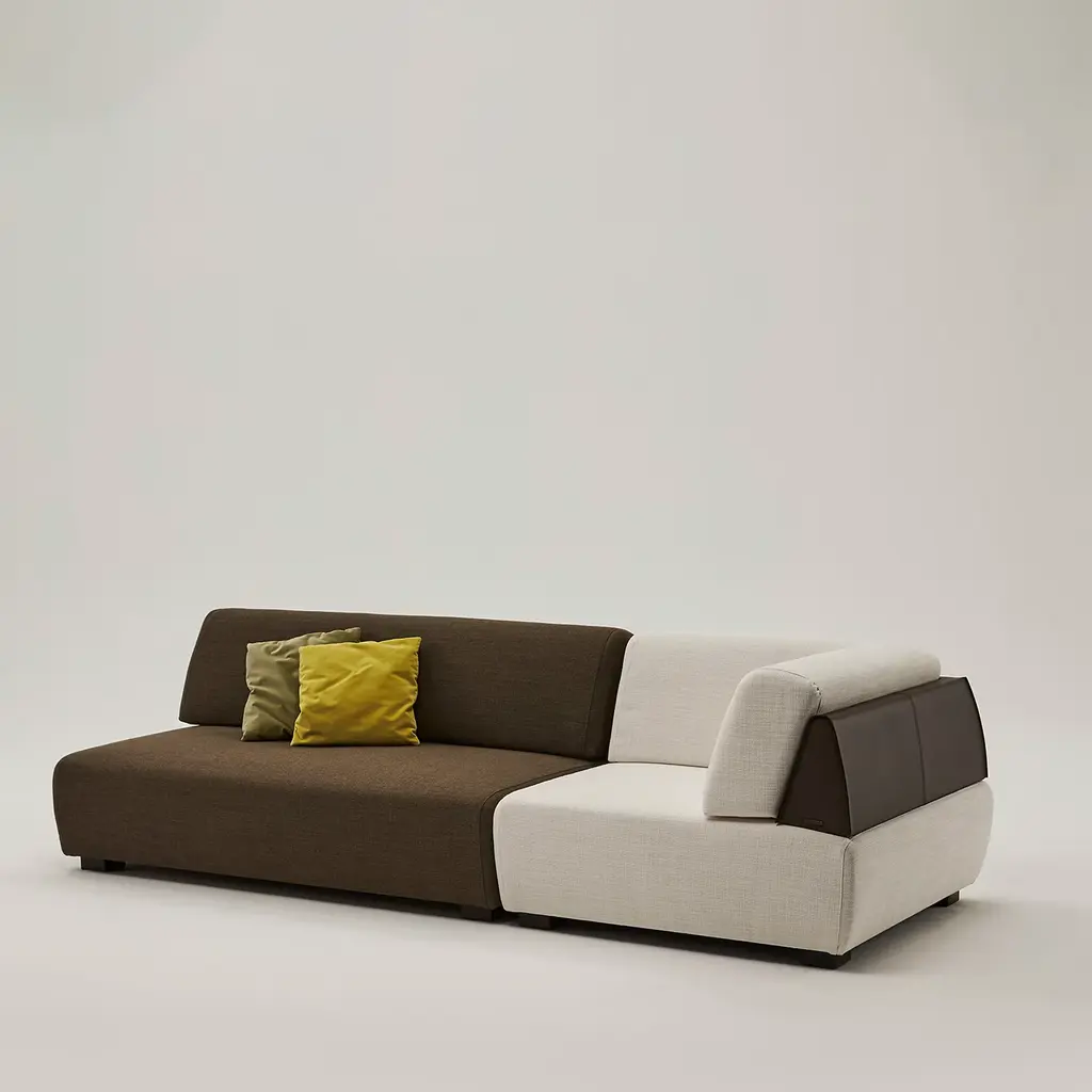 Bold in its volumes as it is in its chromatic contrasts, this modular composition of the Mistral sofa makes for a spot-on addition to neutral-toned modern settings. Fine tobacco-hued cuoietto leather complements the duo of beige and brown fabric, enveloping the smaller and larger modules, respectively. Utmost comfort is ensured by the inner combination of different-density expanded polyurethane padding and elastic belts. Please contact the Concierge for the fireproof padding variant.