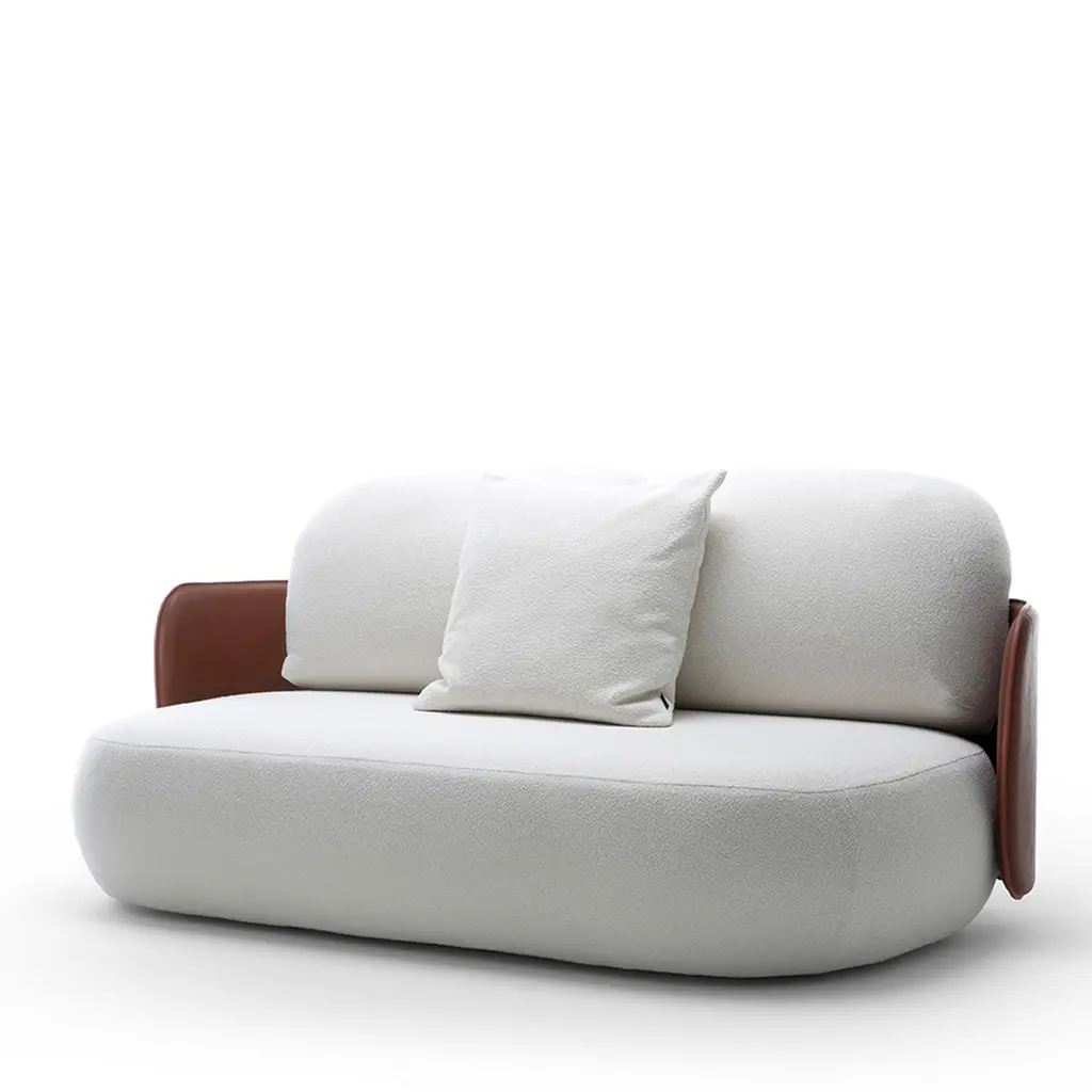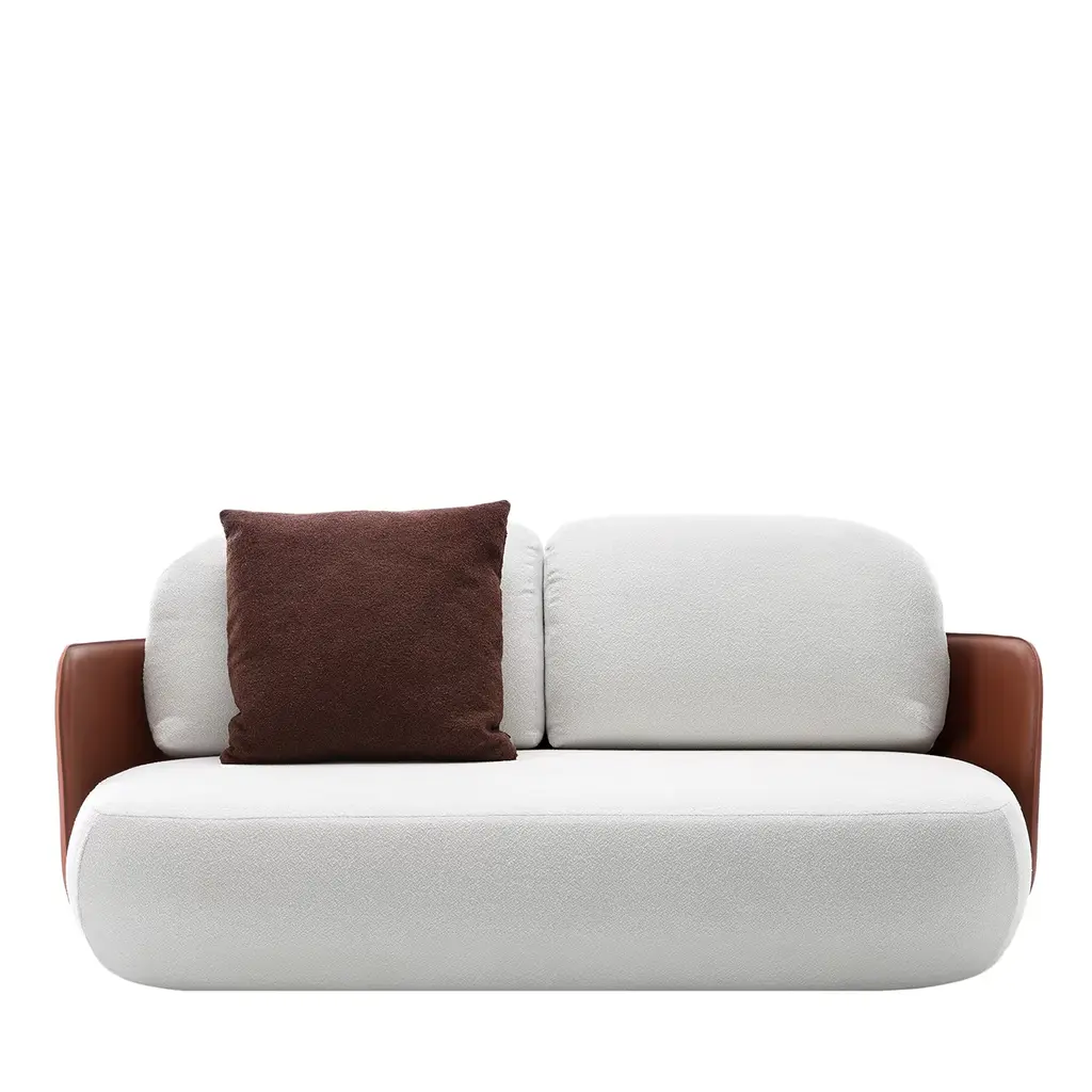 Precious sartorial details meets the playfulness of generous volumes inspired by the eponymous Japanese rice cake in this glamorous outdoor sofa. Designed for complementing refined contemporary-style terraces or patios thanks to its high resistance to humidity and sun exposure, it sports plump cushions covered in bright-white Blaze fabric enveloped by a curved back shell sealed by prized brown saddle leather for a luxurious feel. If the products are placed completely outside, nightcovers that can be purchased at an extra price are recommended. Please contact the Concierge for further information. Decorative cushion is not included.