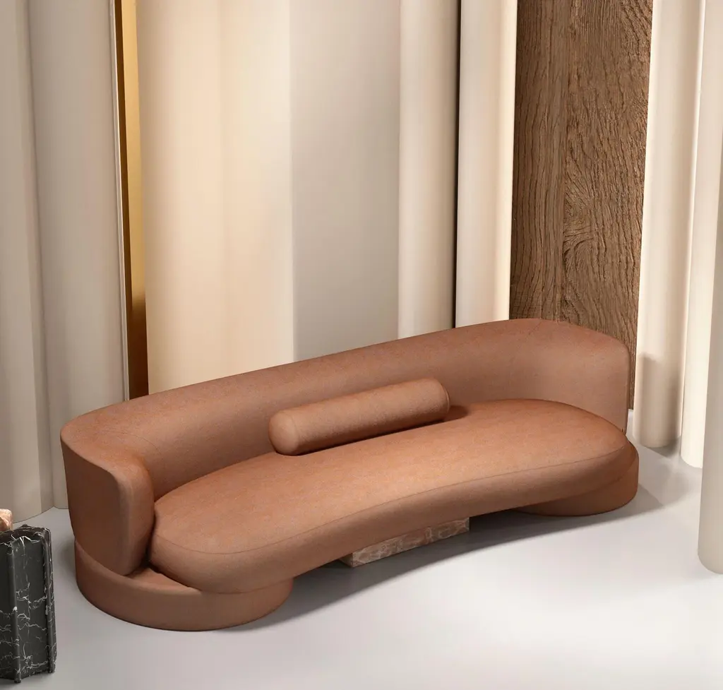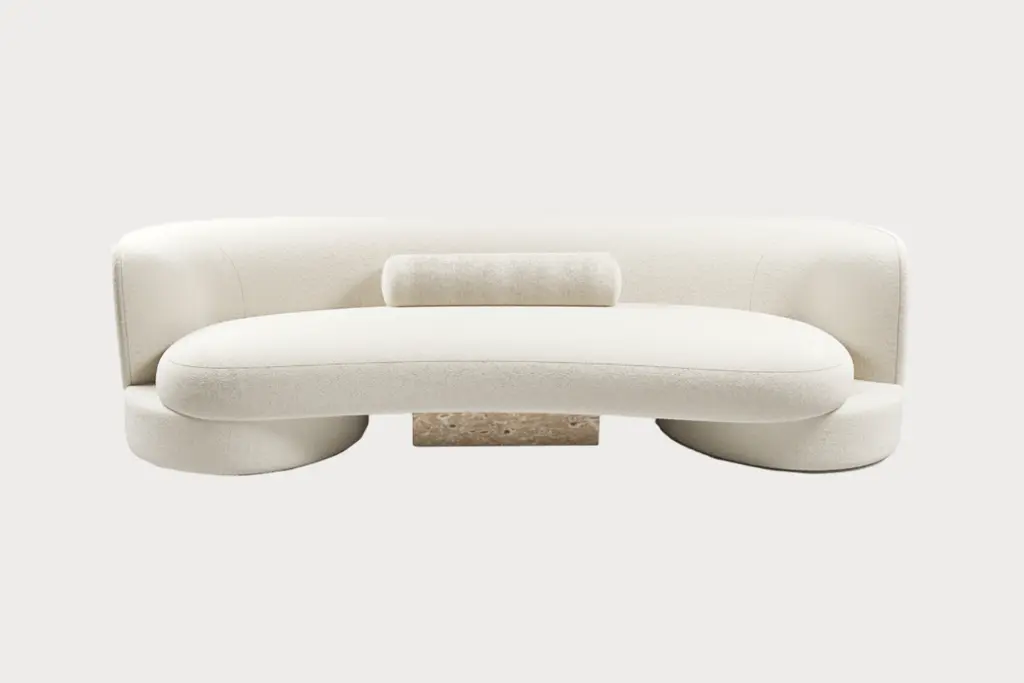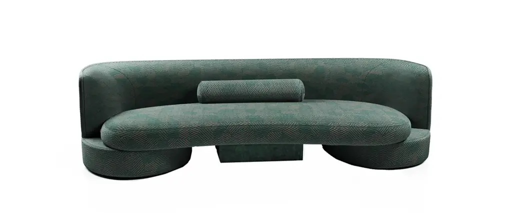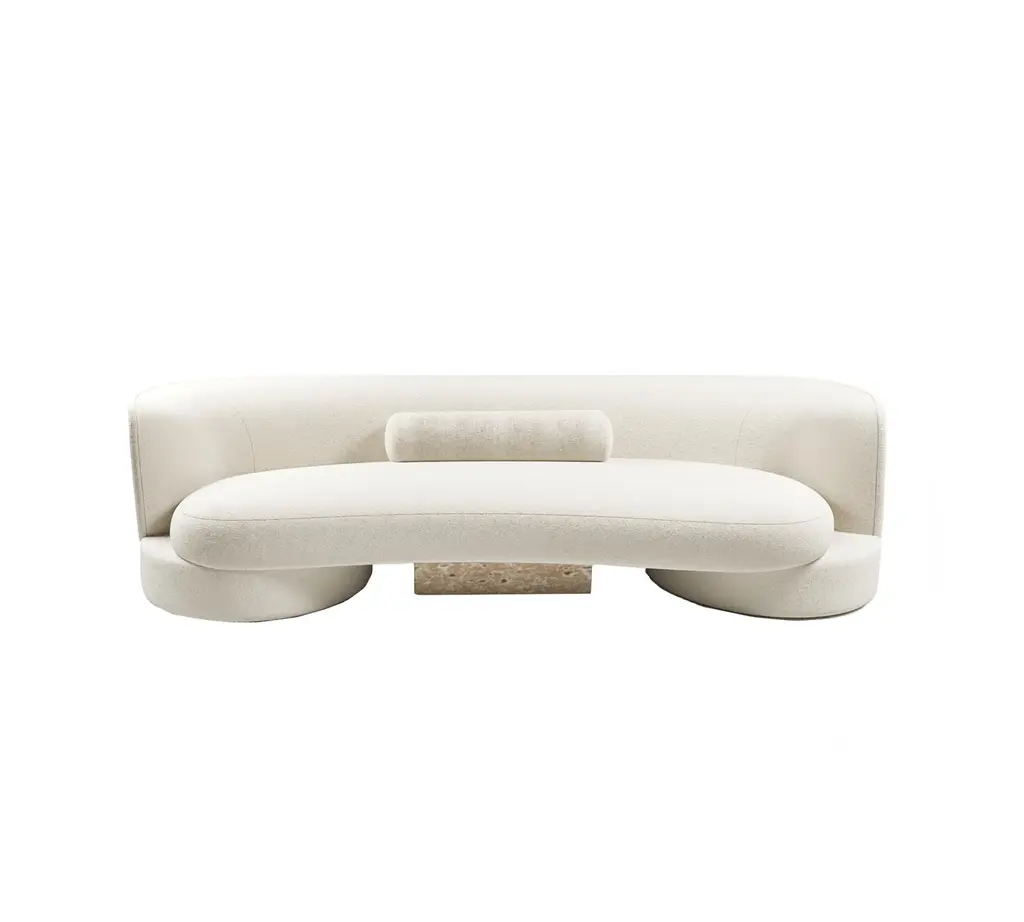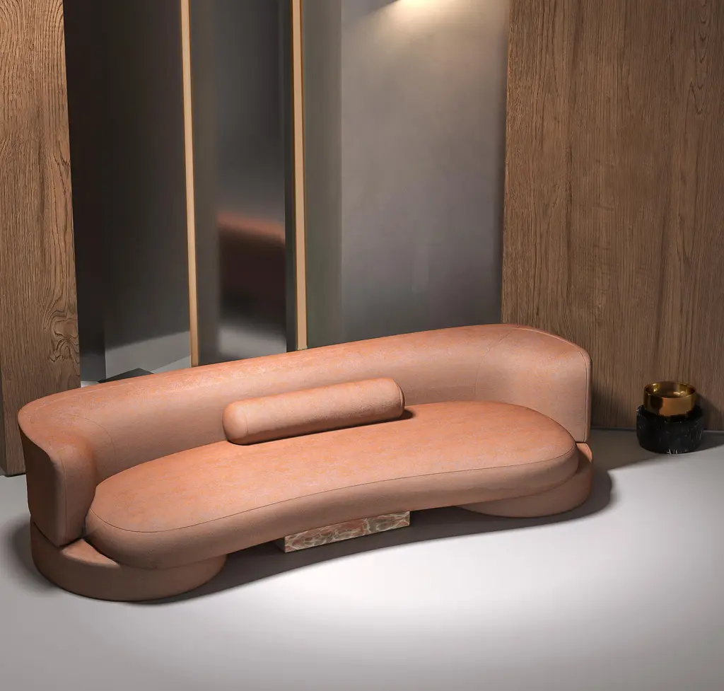 The sofa's shape combines round and square shapes, harmoniously complementing each other. Despite its authentic shape, the sofa is versatile and blends seamlessly into a variety of interiors. Its central insert in natural stone or glossy lacquered wood adds a touch of originality.