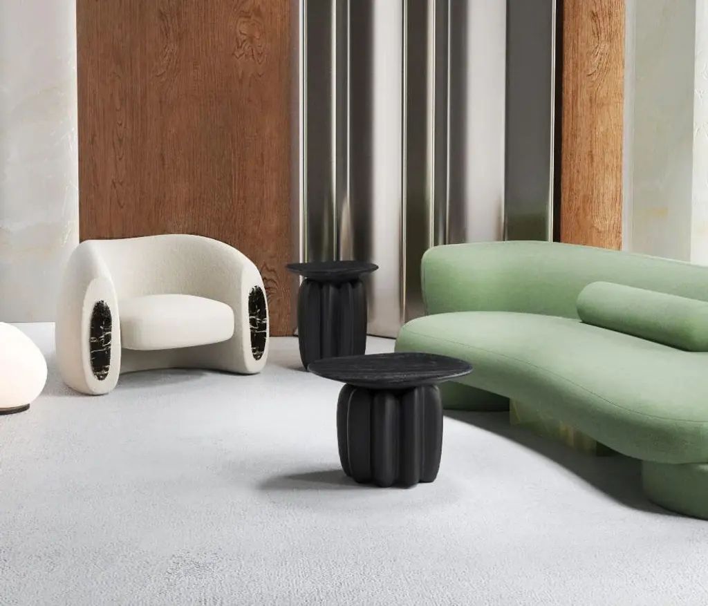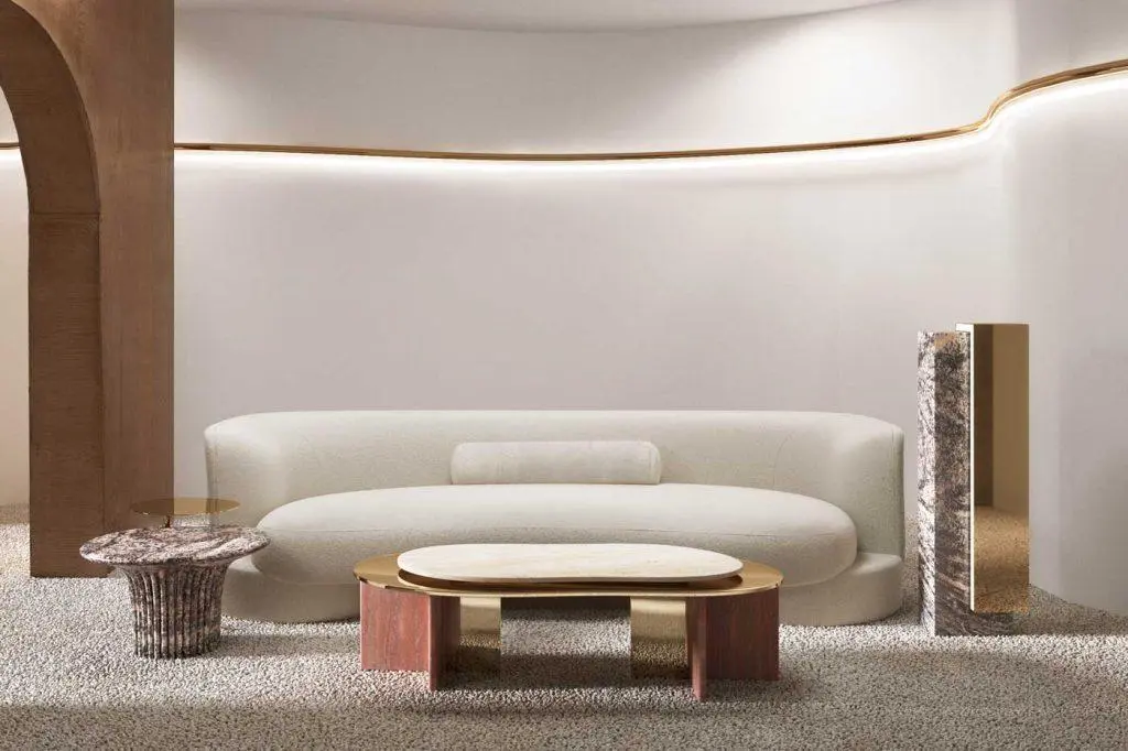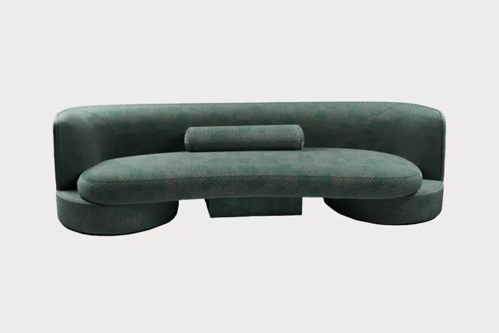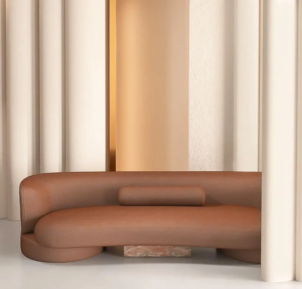 The sofa's shape combines round and square shapes, harmoniously complementing each other. Despite its authentic shape, the sofa is versatile and blends seamlessly into a variety of interiors. Its central insert in natural stone or glossy lacquered wood adds a touch of originality.