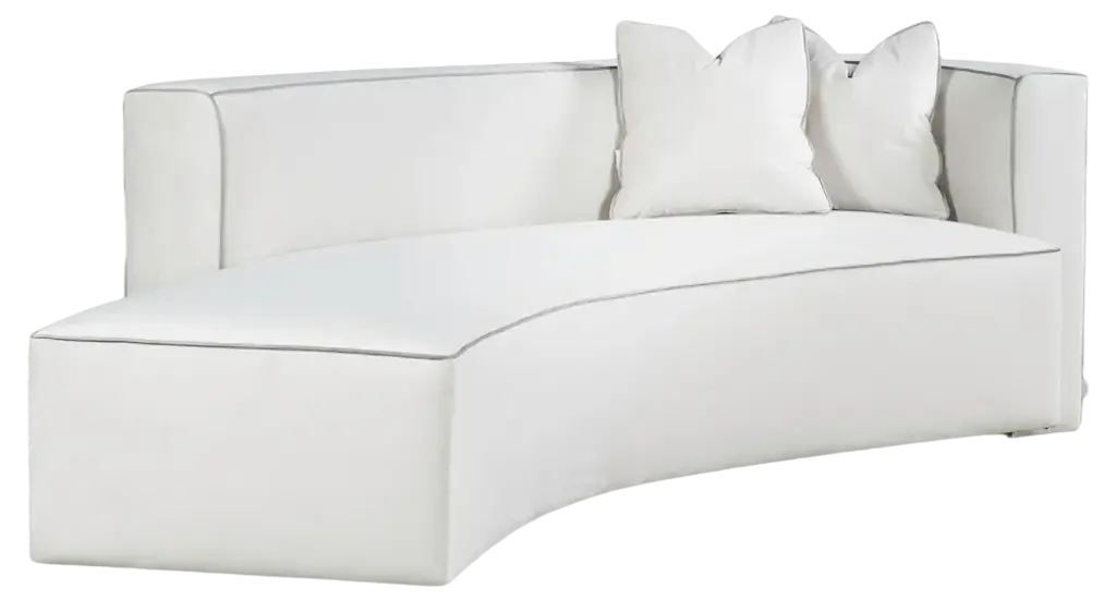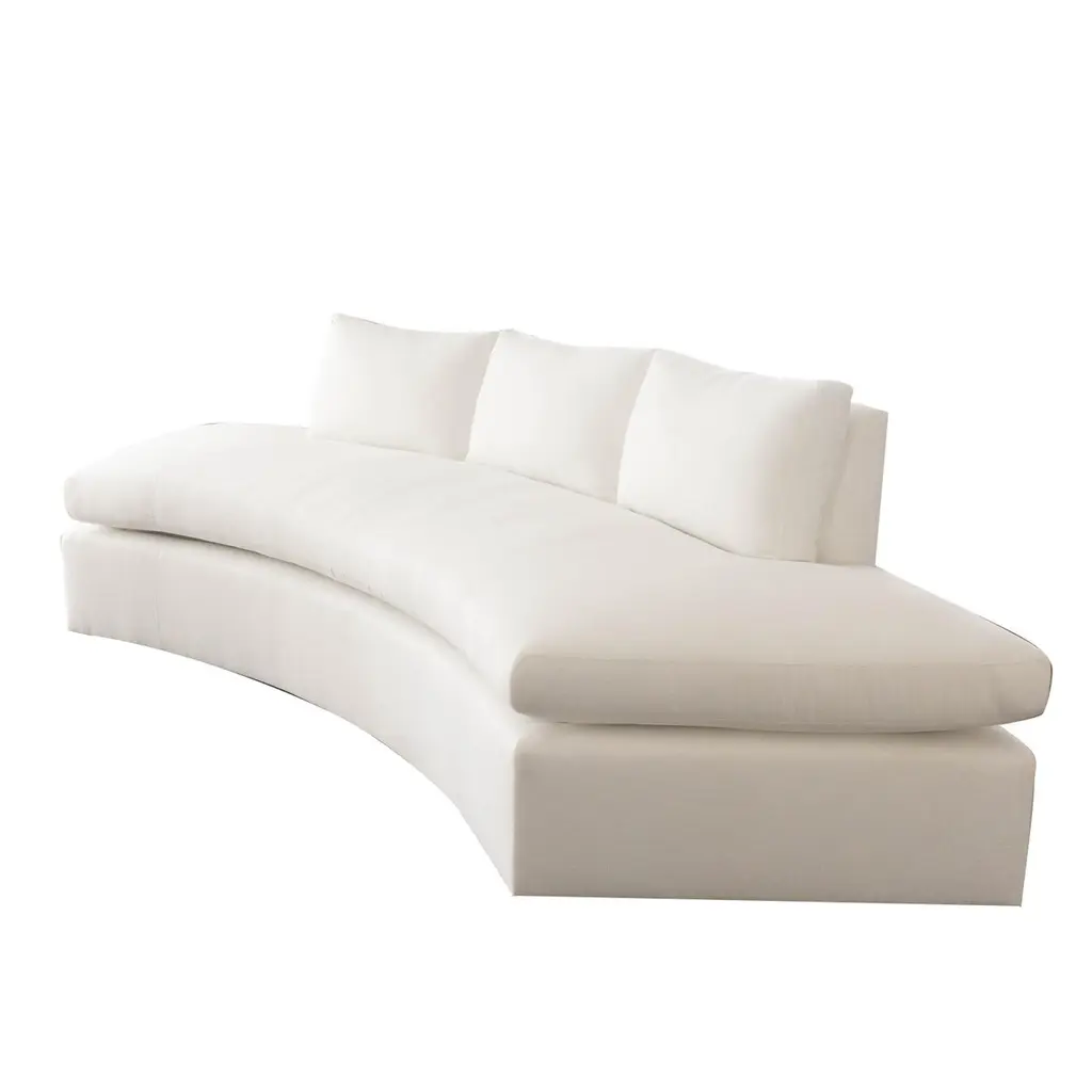 This modern curved sofa is built to order and features 3 loose back cushions with a single cushioned seat. This piece is customizable and can be built to the size specifications of your liking. COM (Customers' Own Material) Price: $6,962Measurements: 34" height (including cushions) x 130" long x 36" depth.