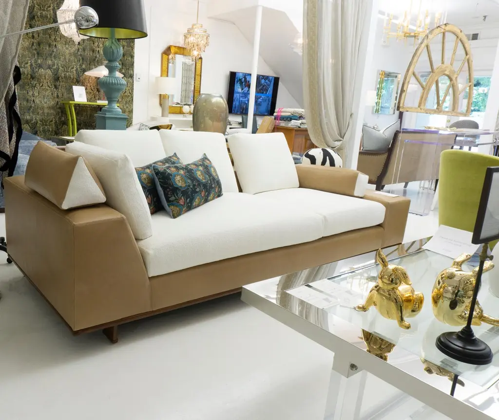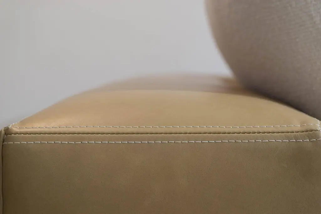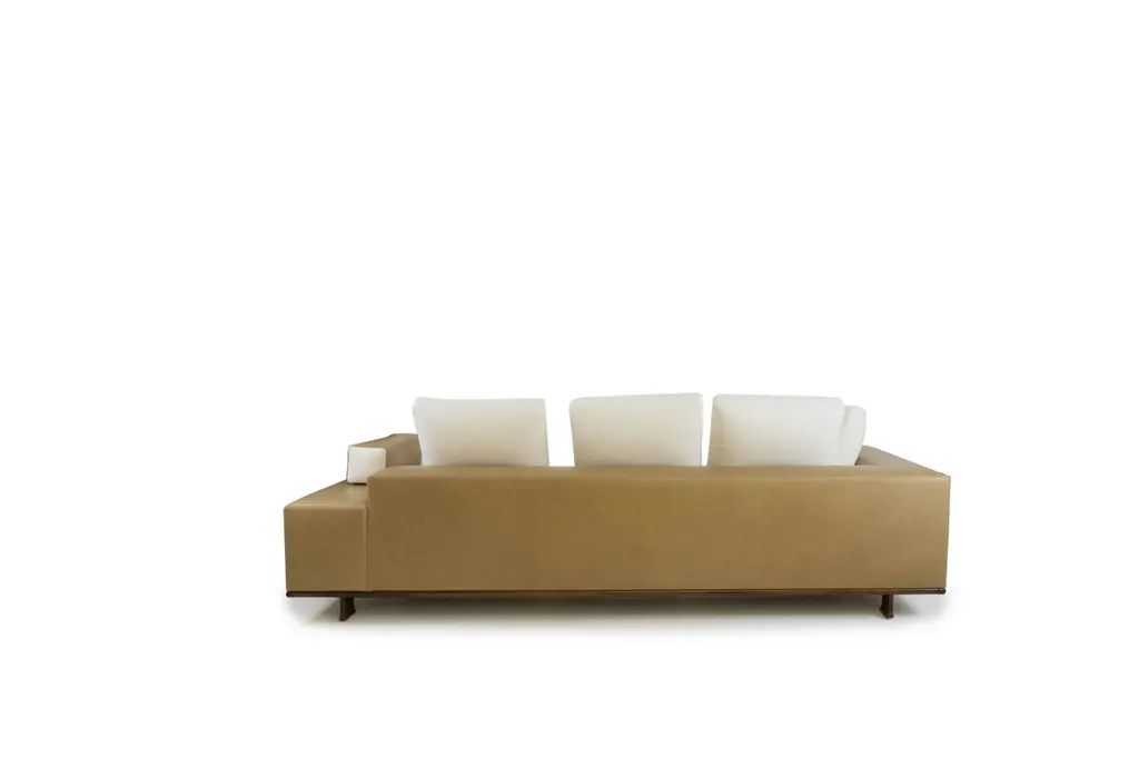 Inspired by Italian design, this contemporary sofa features a leather frame, nubby cotton cushions and an elegant wood trim. Loose back cushions keep the aesthetic airy and the asymmetrical seat cushion design is both beautiful and functional, offering a unique lounge option. Arms double as extra seating or a place to set your laptop.Foam in cushions is high density and supportive. The floating back cushions provide enough support to keep you upright and not slouched. Cushions also have feather for added luxe.A beautiful and delicious design. Caramel and marshmallow.Available for sale COM (Customers' Own Material) for $7,930Outside measurements:34" H at back pillows x 100" W x 40" DInside measurements:18" H seat x 75" W x 24" DLeft arm and back are 23" HRight arm is 18 1/2" H and 13" WLeft seat cushion 48" Right seat cushion 27"