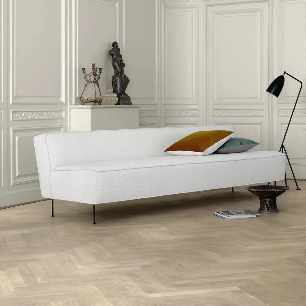 This masterful sofa is the starting point for Swedish design icon Greta M. Grossman’s collection Modern Line. First unveiled in 1949, it remains a timeless paradigm of luxurious minimalist expression with its bold geometric lines. The sleek and substantial upholstered form contrasts with the elegantly slender legs, a Grossman signature, which impart a sense of leavening weightlessness.