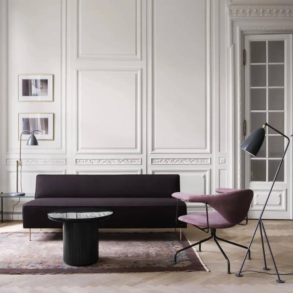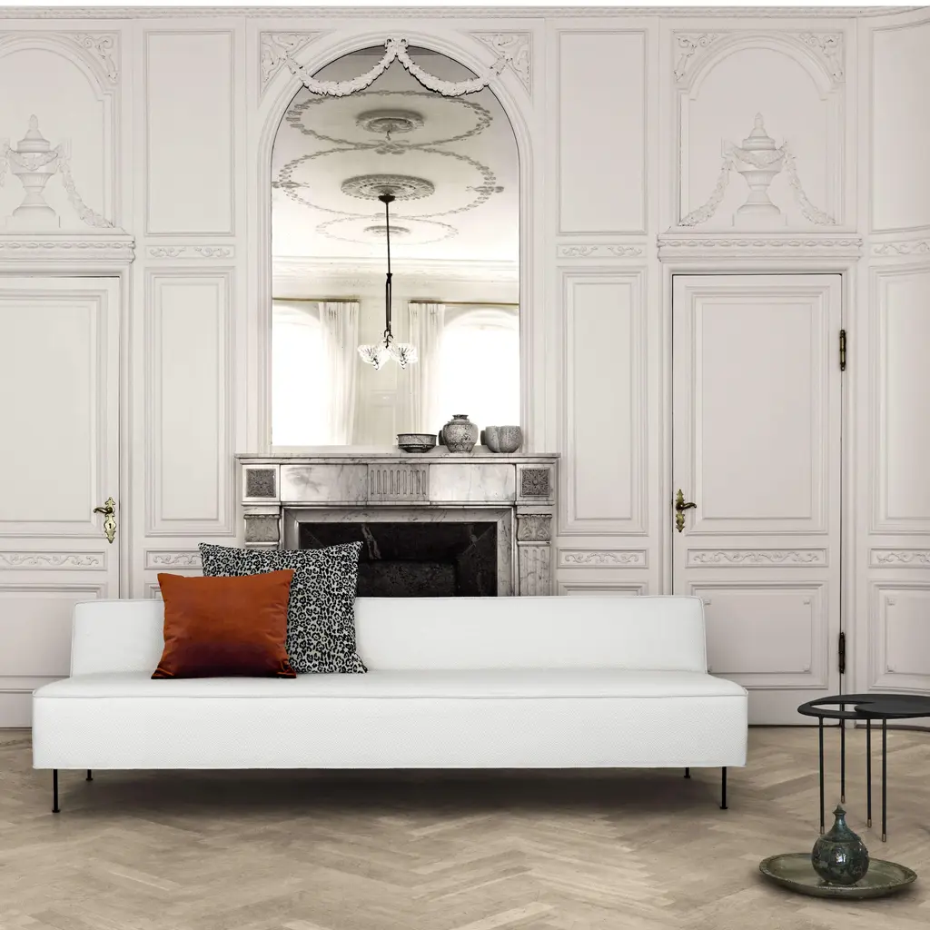 This masterful sofa is the starting point for Swedish design icon Greta M. Grossman’s collection Modern Line. First unveiled in 1949, it remains a timeless paradigm of luxurious minimalist expression with its bold geometric lines. The sleek and substantial upholstered form contrasts with the elegantly slender legs, a Grossman signature, which impart a sense of leavening weightlessness.