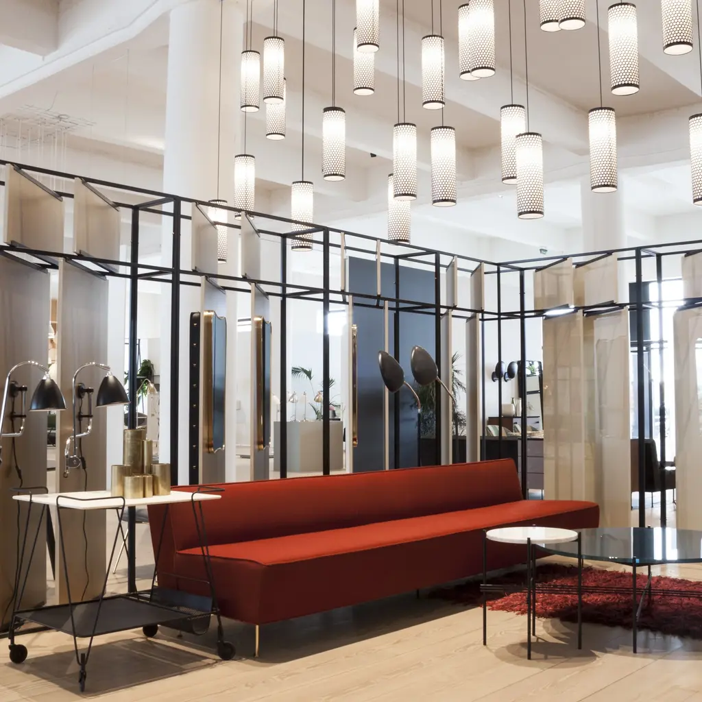 This masterful sofa is the starting point for Swedish design icon Greta M. Grossman’s collection Modern Line. First unveiled in 1949, it remains a timeless paradigm of luxurious minimalist expression with its bold geometric lines. The sleek and substantial upholstered form contrasts with the elegantly slender legs, a Grossman signature, which impart a sense of leavening weightlessness.