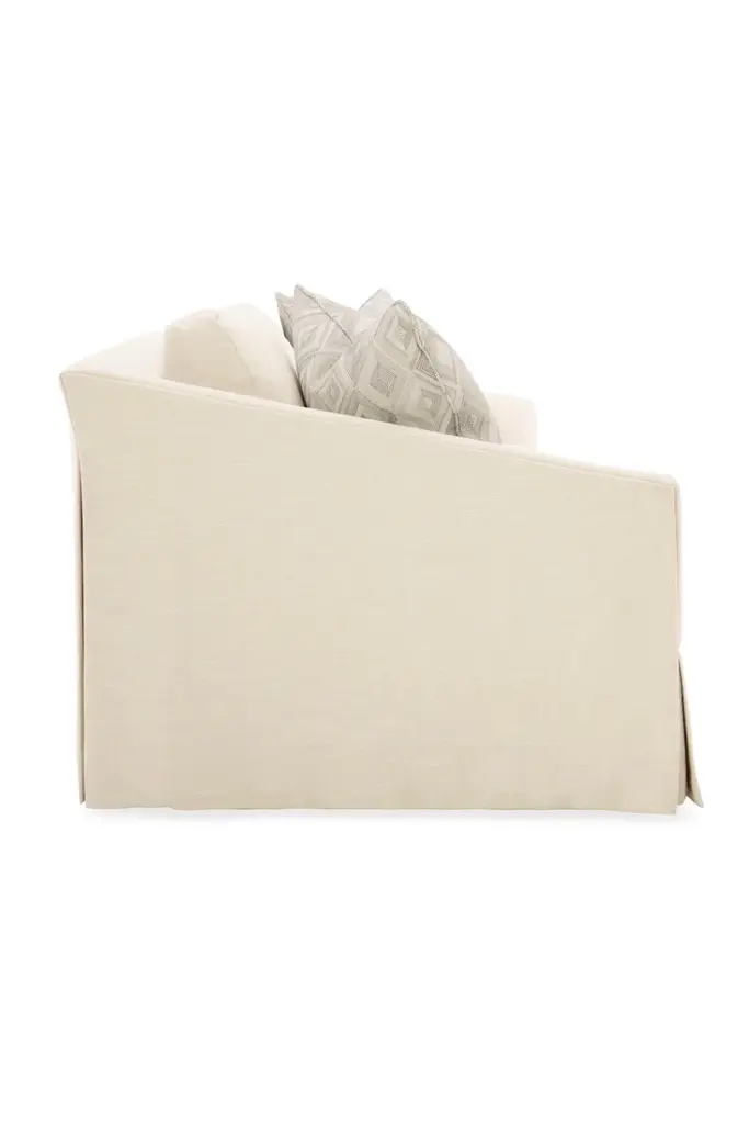 A Casual Affair illustrates how fashion informs home fashion. Drawing inspiration from the latest styles shown at NY Fashion Week, this captivating sofa showcases clean lines paired with a classic flow of draped material and layered pleats. Its sleek sloped arms feature a dressmaker skirt that falls open from the top of the arm front and back. Luxuriously soft, neutral accent pillows add a touch of tonal pattern. Relaxed, refreshed, and ever so classic, this sofa is a foundation piece for fine design.