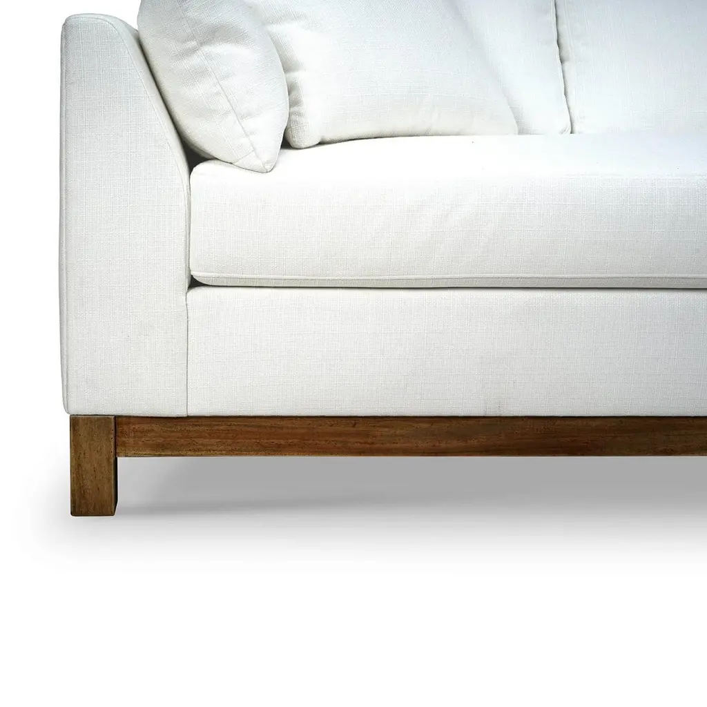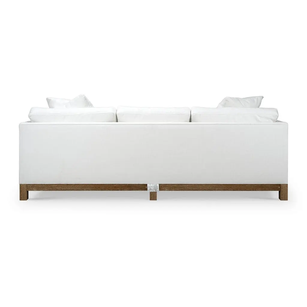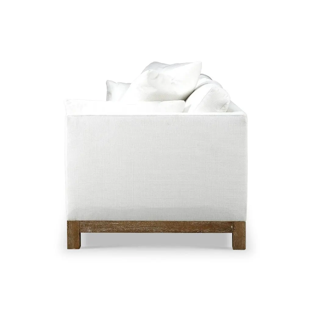 This exquisite sofa features a sleek, angular frame upholstered in premium arctic white performance fabric, providing both elegance and durability. The simple solid wood base, finished in a rich straw wash stain, adds warmth and sophistication, making this chair a standout piece in your home decor.Ideal for living rooms, bedrooms, or reading nooks, this sofa not only enhances the visual appeal of your space but also offers superior comfort with its plush cushions and ergonomic design. Dimensions: 98" W x 38" D x 28" HSeat 85" W x 19" HArm - 29" HCustom finish options are also available. Contact us to learn more.