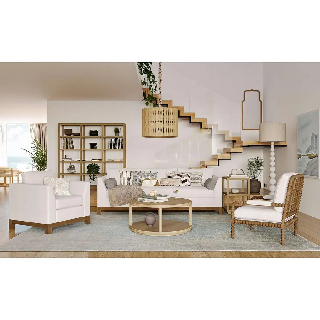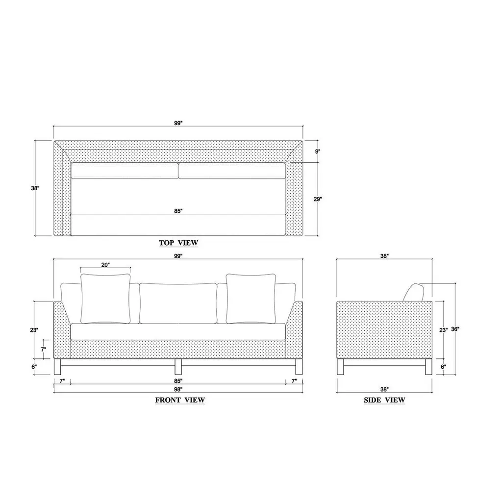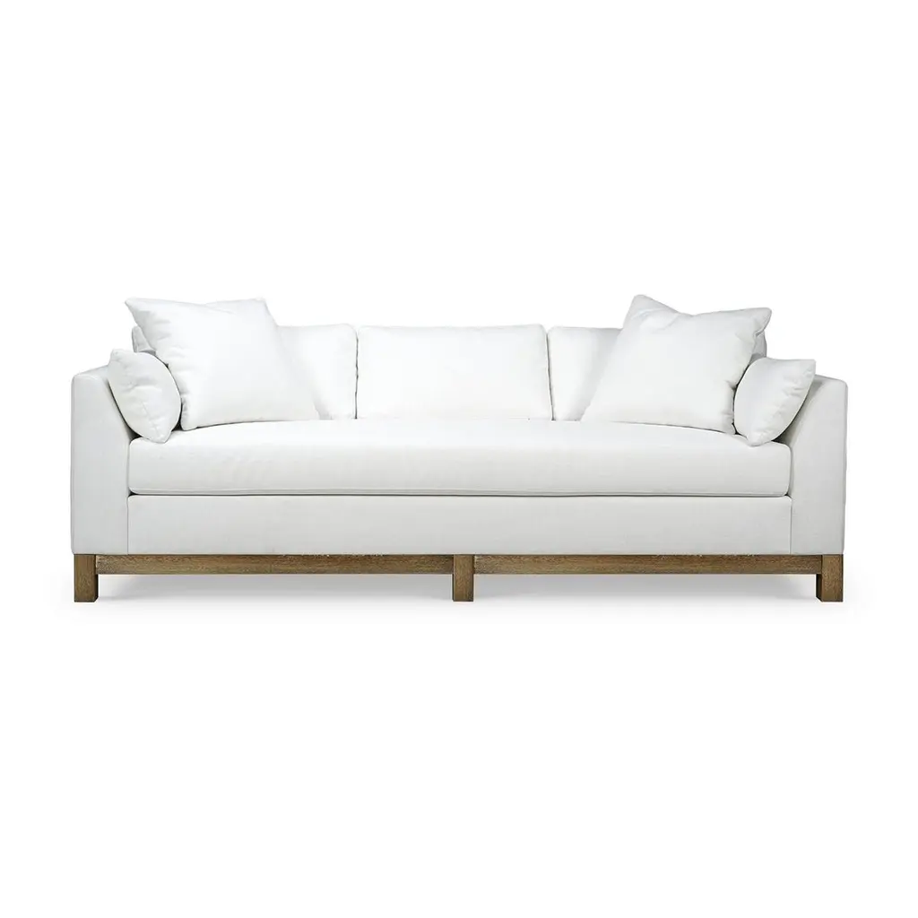 This exquisite sofa features a sleek, angular frame upholstered in premium arctic white performance fabric, providing both elegance and durability. The simple solid wood base, finished in a rich straw wash stain, adds warmth and sophistication, making this chair a standout piece in your home decor.Ideal for living rooms, bedrooms, or reading nooks, this sofa not only enhances the visual appeal of your space but also offers superior comfort with its plush cushions and ergonomic design. Dimensions: 98" W x 38" D x 28" HSeat 85" W x 19" HArm - 29" HCustom finish options are also available. Contact us to learn more.