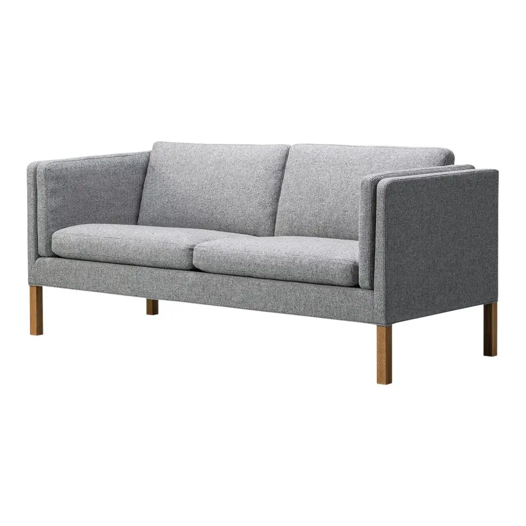 The 2.5 seater sofa was designed by Borge Mogensen's son, architect Peter Mogensen, as a completion of his father's last furniture series. The extended width of the cushions softens the formality of the design in a respectfully unpredictable way.