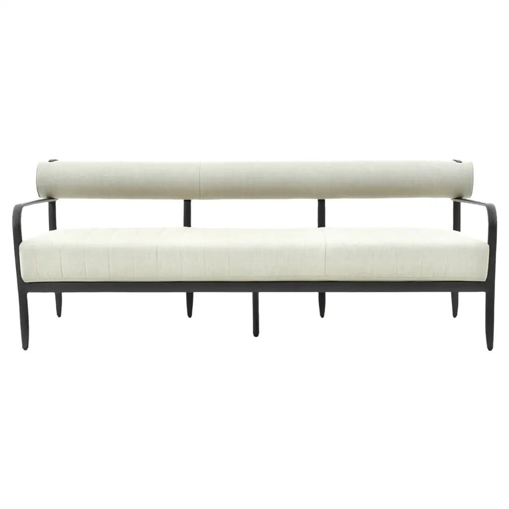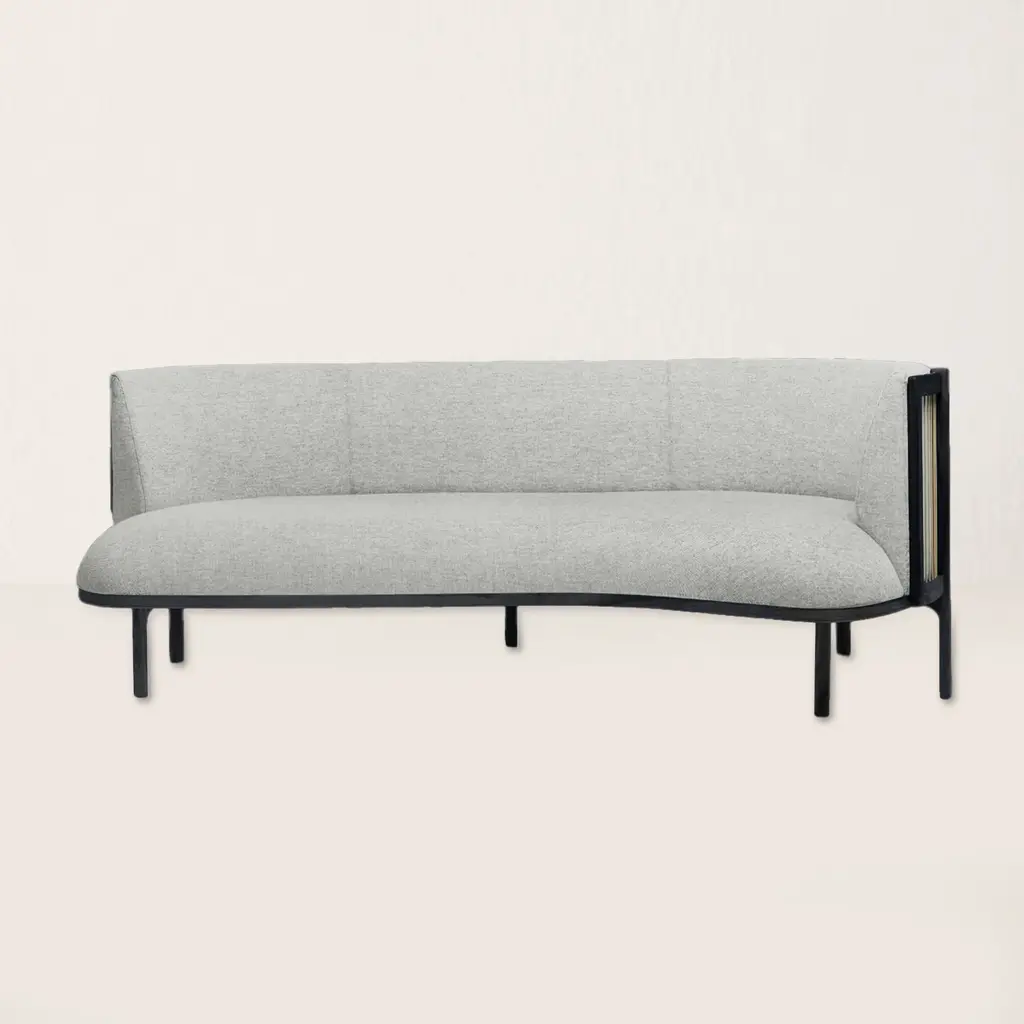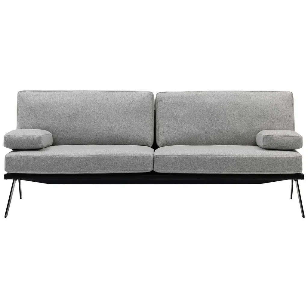 This elegant gray pholstered two seater sofa is enriched by a painted 4 legged steel frame in matte black.