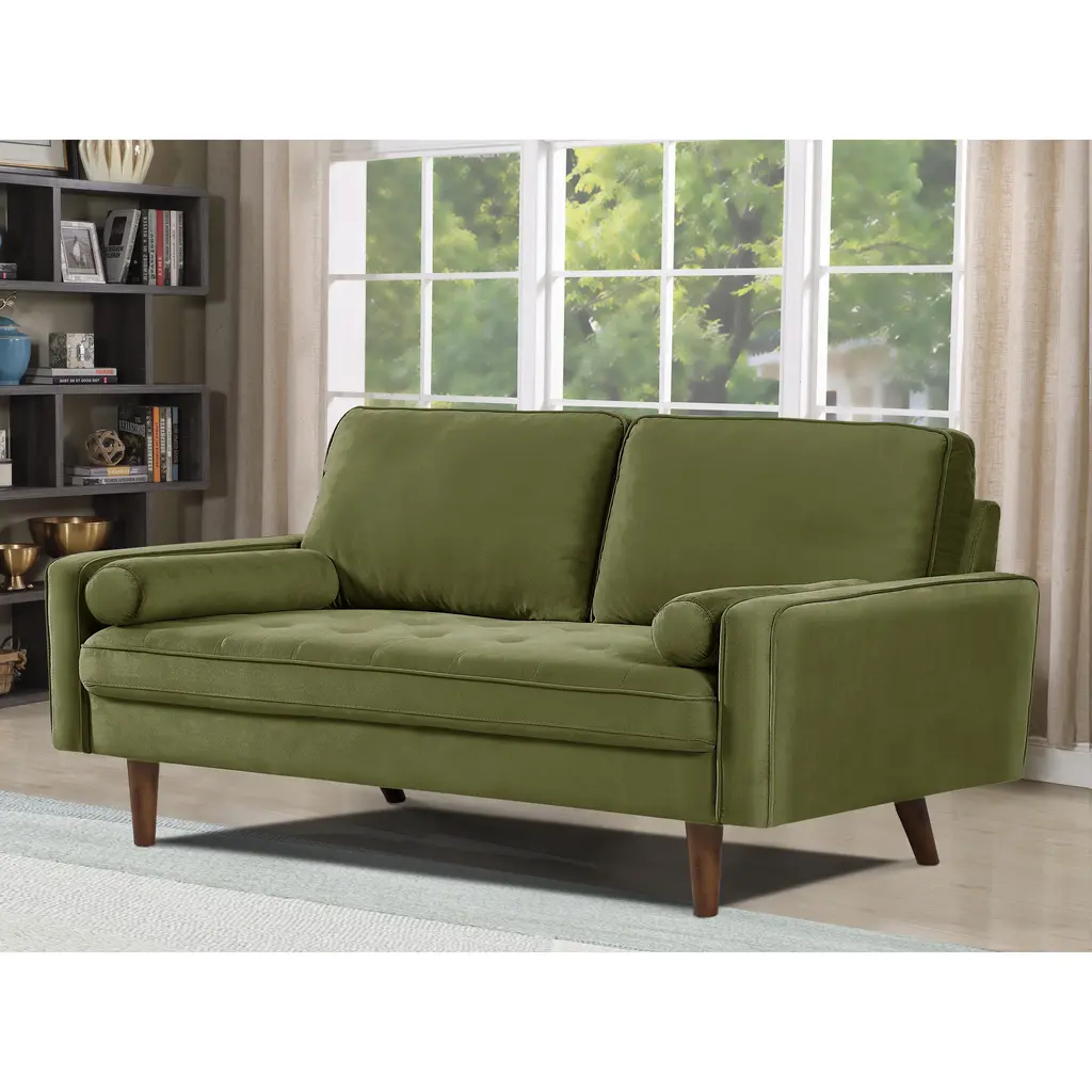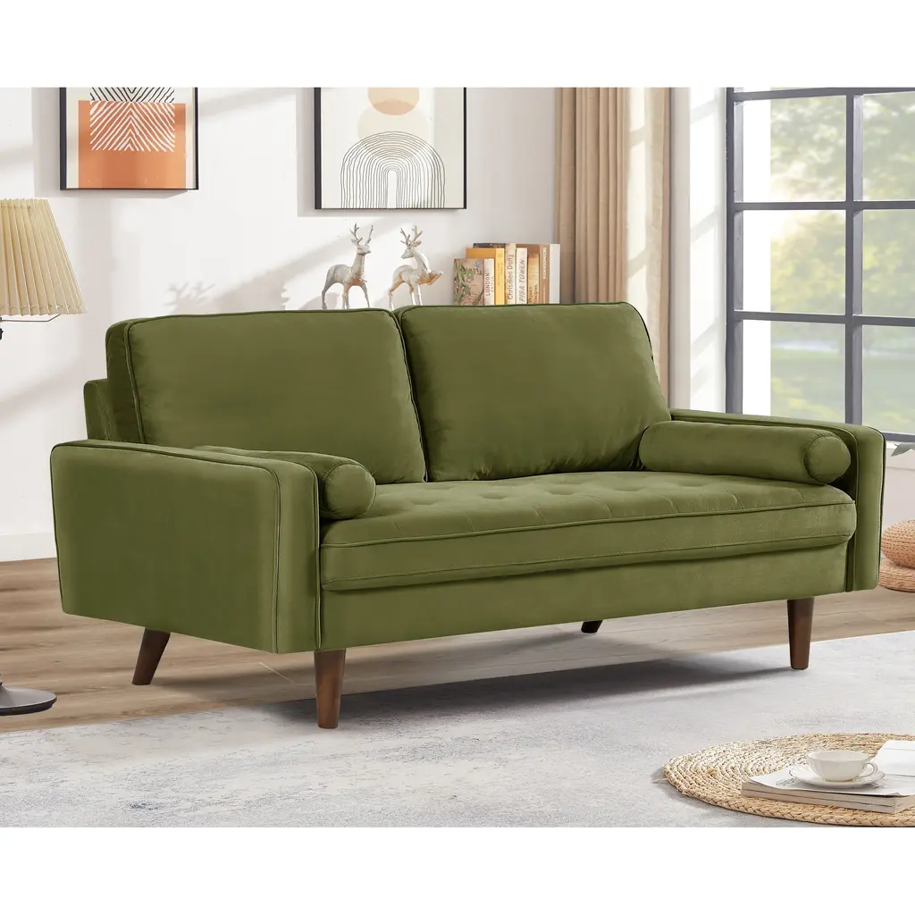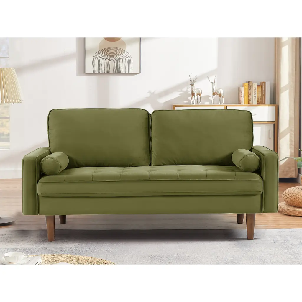 The classic design of the sofa, Mid-century style gives this wood frame Velvet Tufted sofa a distinctive look that elevates your well-curated collection. Its button tufted details add a refined touch to any space while its streamlied silhouette and square arms fuse together to make a modern look. It features the button tufted seat and back cushion and finished wood legs. Two bolster pillows are included. Loveseat dimensions: 57.87*31.5*33.07