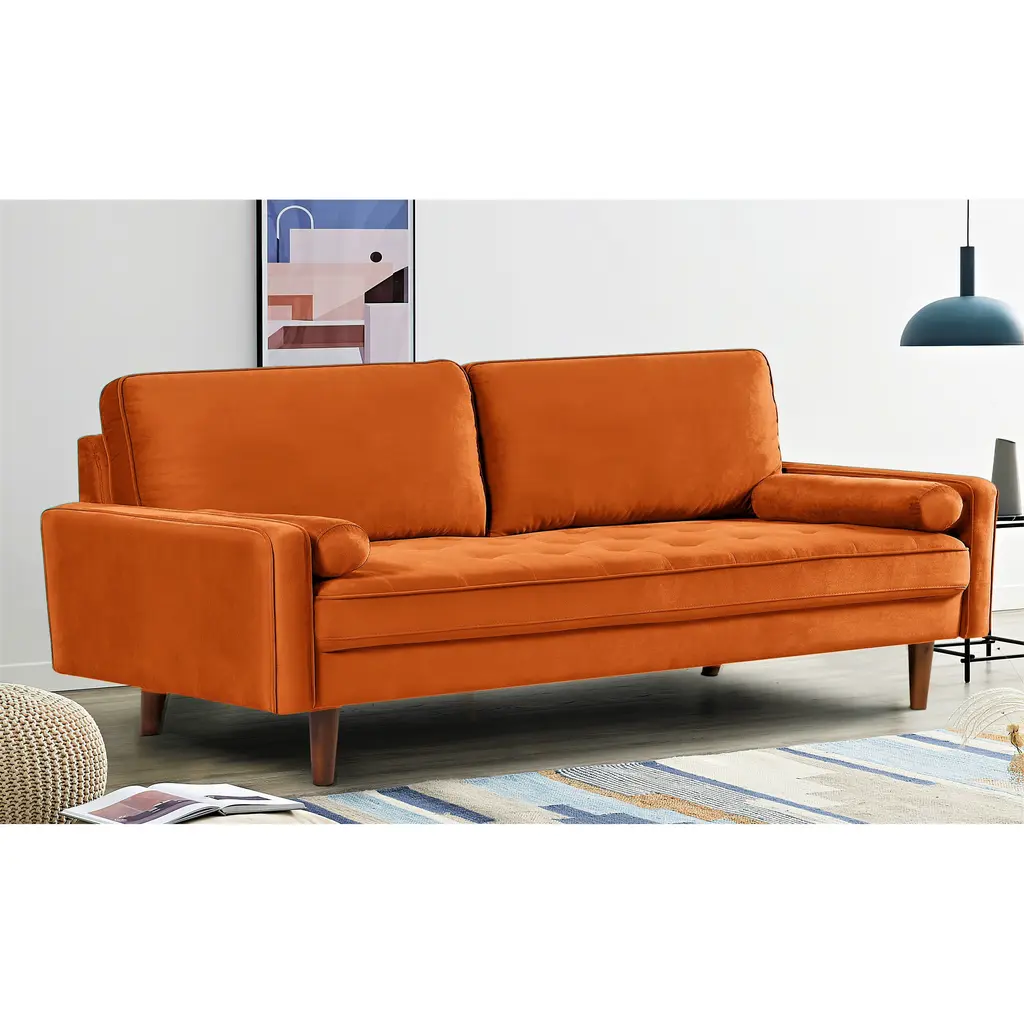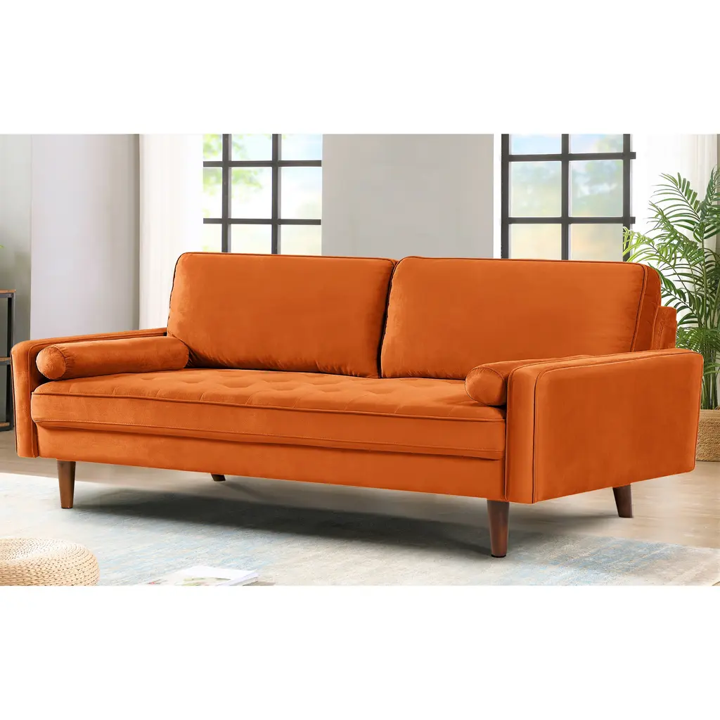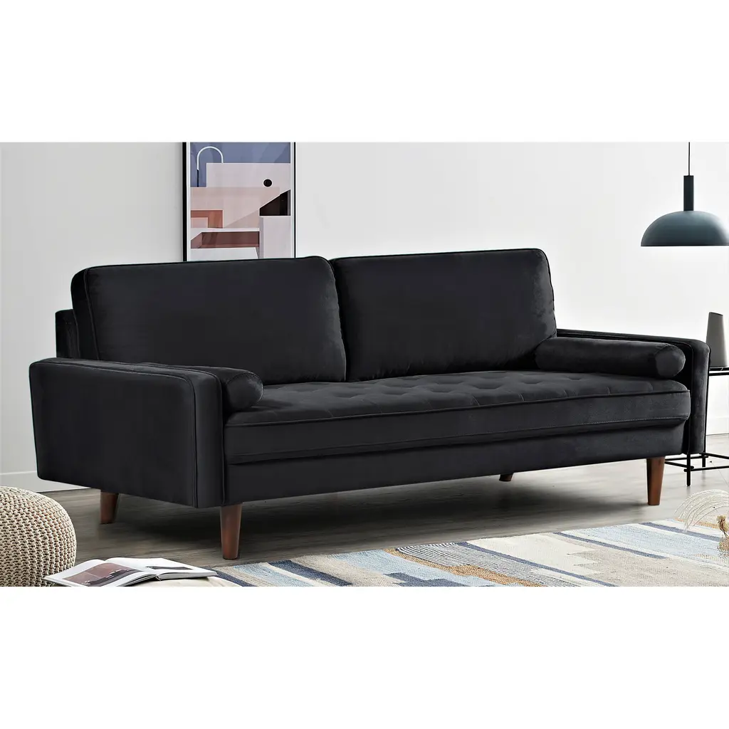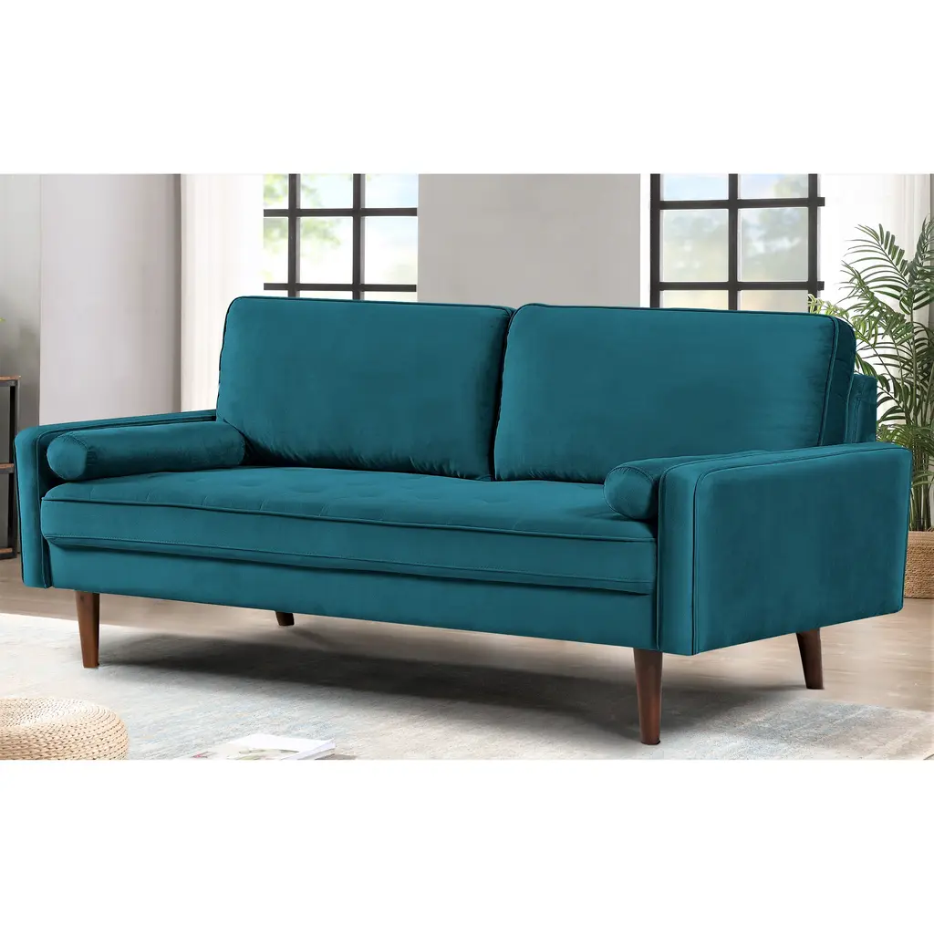 The classic design of the sofa, Mid-century style gives this wood frame Velvet Tufted sofa a distinctive look that elevates your well-curated collection. Its button tufted details add a refined touch to any space while its streamlied silhouette and square arms fuse together to make a modern look. It features the button tufted seat and back cushion and finished wood legs. Two bolster pillows are included. Sofa dimensions: 70*31.5*33.07