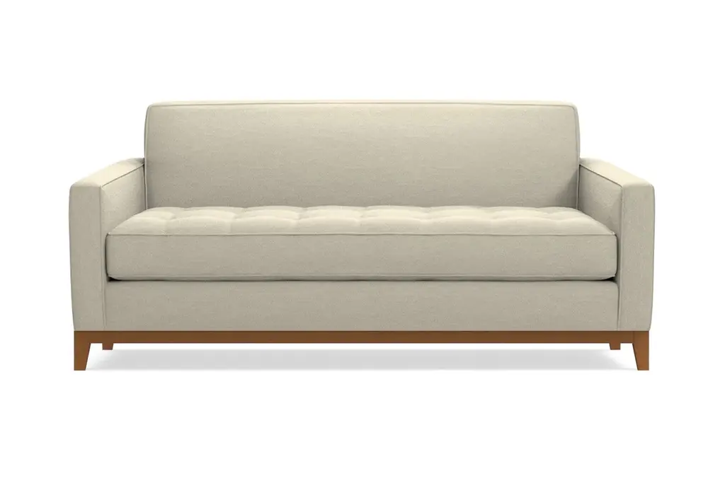 The Monroe Drive Collection is a modern update of our show-stopping Monroe Collection. The same eye-catching Mid Century Modern design details that defined the Monroe are still on display, but now with the addition of a stunning, solid wood base. The sophisticated button-tufted cushions and sleek tight back make the Monroe Drive look like it came straight from a classic Hollywood film set. The contemporary base creates a handsome, formal profile that allows the Monroe Drive to feel right at home in a variety of different decor styles. Available in your custom choice of our kid friendly and pet friendly fabrics, the Monroe Drive is perfect for your family home, for your sophisticated apartment, or for your chic small space loft.