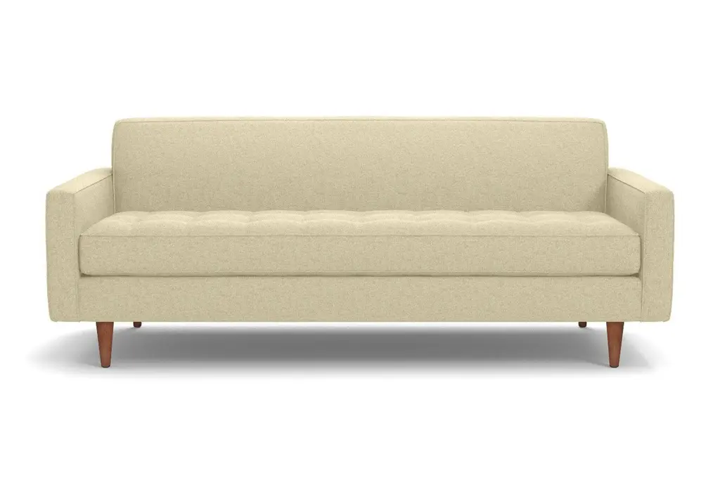 This midcentury modern sofa boasts a hot retro vibe thanks to its sleek silhouette and button-tufted seat cushions. The backing is a solid piece straight across, offering a smooth look and feel. The piped edges create additional texture and the tapered wooden legs finish off the design. Our Kyle Schuneman sofas are made in the United States using the finest craftsmanship. Made with hypo-allergenic, stain-resistant upholstery, you'll enjoy this sofa for years to come. Available in your choice of 50 colors - we're huge fans of the pink sofa - you're sure to find the perfect shade just for you. Apt2B offers a 100-percent satisfaction guarantee, so go ahead, add the Monroe to your cart! The Monroe is a perfect way to add a hip factor to any room. The clean lines and simple shape make it perfect for any small space. It packs a big punch without taking up a lot of square footage.