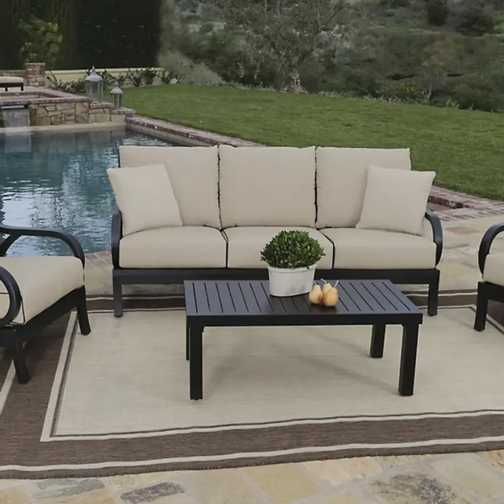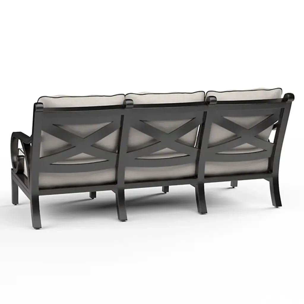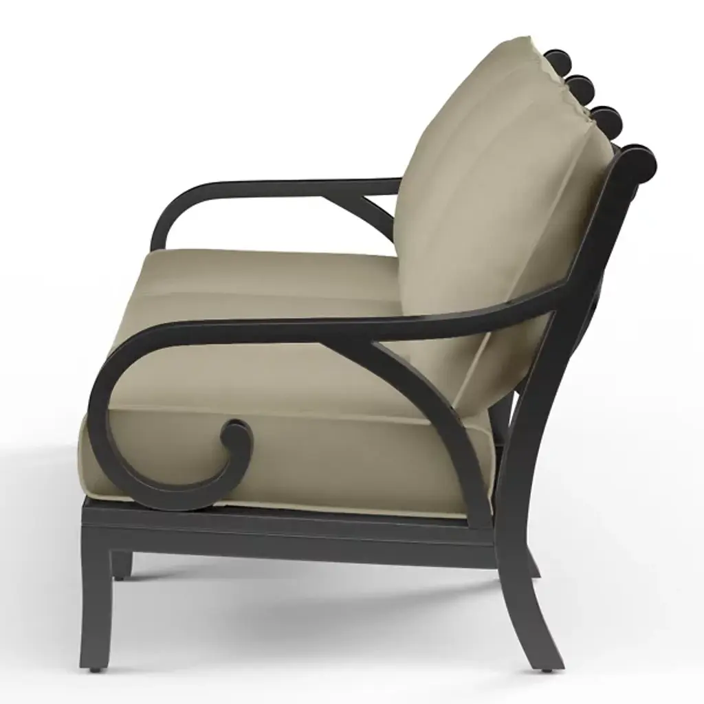 The Monterey Outdoor Sofa from Sunset West sweeps through dramatic curved armrests that spiral outward like unfurling scrolls, establishing the collection's artistic identity. Three-seat configuration accommodates family gatherings while maintaining the intimate scale that defines quality outdoor furniture. Old World Copper finish weathers naturally to develop an authentic patina that enhances the handcrafted aesthetic over time. Cross-back detailing adds structural interest beneath plush cushioning that invites extended conversations. This sofa anchors living spaces where artistic expression meets comfortable functionality for entertaining experiences.