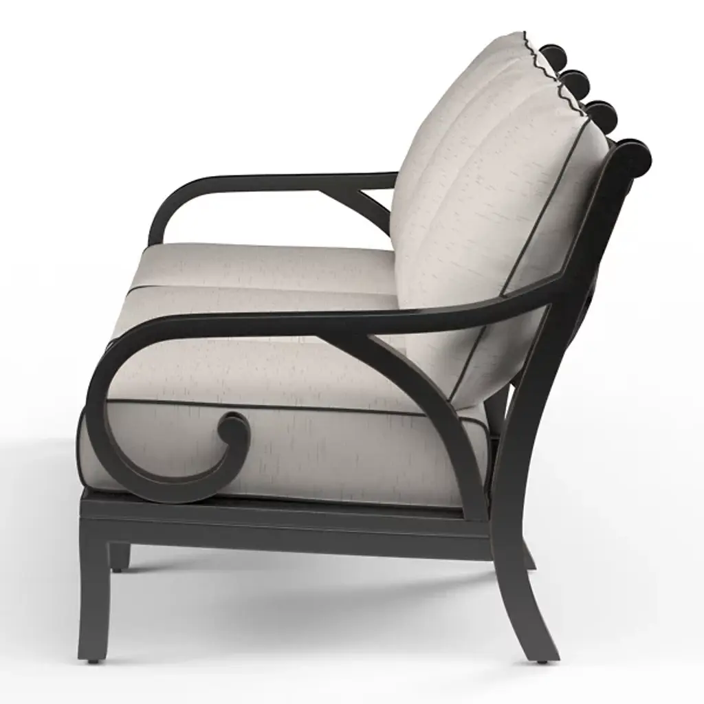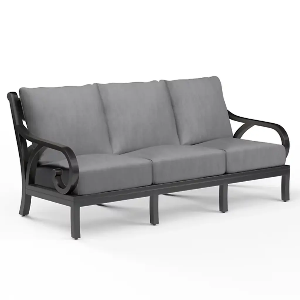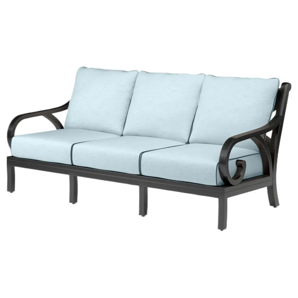 The Monterey Outdoor Sofa from Sunset West sweeps through dramatic curved armrests that spiral outward like unfurling scrolls, establishing the collection's artistic identity. Three-seat configuration accommodates family gatherings while maintaining the intimate scale that defines quality outdoor furniture. Old World Copper finish weathers naturally to develop an authentic patina that enhances the handcrafted aesthetic over time. Cross-back detailing adds structural interest beneath plush cushioning that invites extended conversations. This sofa anchors living spaces where artistic expression meets comfortable functionality for entertaining experiences.