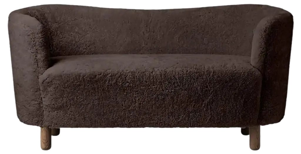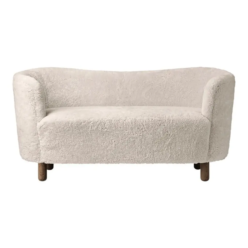 Moonlight sheepskin and smoked oak mingle sofa by Lassen.Dimensions: W 154 x D 68 x H 74 cm. Materials: sheepskin, oak.The Mingle sofa was designed in 1935 by architect Flemming Lassen (1902-1984) and was presented at The Copenhagen Cabinetmakers’ Guild Competition in the same year. It was subsequently praised for its qualities as a small but elegant sofa in the professional journal “The Architect”. Flemming Lassen loved to travel, and he was often inspired by his journeys throughout Europe. He was very taken with both Italy and France, and had a burning desire to tour those countries on his motorcycle. Flemming Lassen wanted to create a sofa made for conversation with a comfort that invited people to stay seated and talk together for long periods of time. The armrests were designed to encircle the sitters, generating intimacy and transforming the sofa into a cosy place to relax. Flemming Lassen took inspiration from both French elegance and modern Italian style, and transferred the trends and his own ideas to a small, upholstered sofa called Mingle.By Lassen is a Danish design brand focused on iconic designs created by Mogens and Flemming Lassen, founded by Lassens’ relatives in 2008. Brothers Mogens (1901-1987) and Flemming (1902-1984) Lassen are known as two of Denmark’s greatest architects and designers. Both were renowned pioneers of Danish functionalism and modernist architecture, honoured with numerous prestigious medals and awards. Headed by Mogens Lassen’s grandson Søren Lassen, By Lassen carries on the brothers’ design philosophy by manufacturing their iconic designs as well as products by other designers that complement the Lassen’s functionalist style. The company’s mission is to continue the tradition of timelessness, functionality and quality, and to introduce the Lassen’s design heritage to new generations.