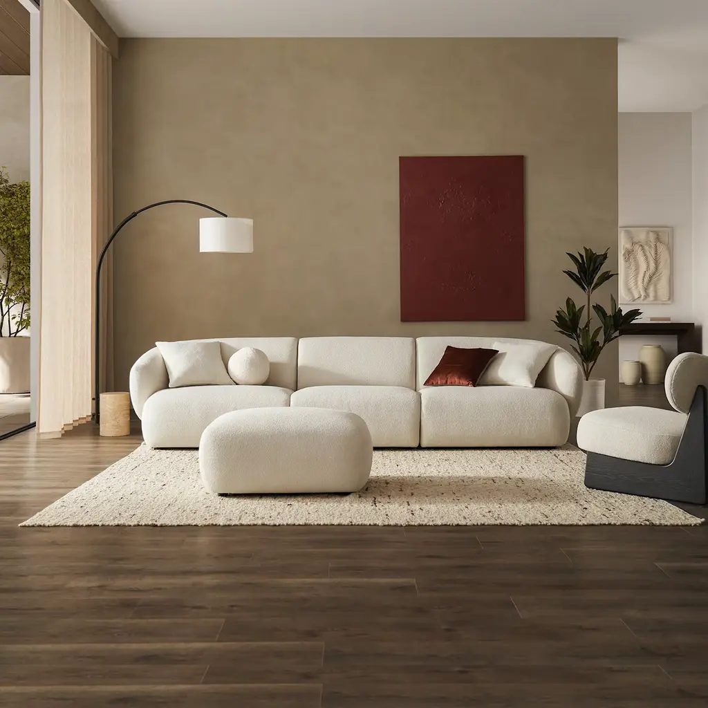 Pacific is the continuation of a design process begun in 2010 with the iconic Redondo collection by Patricia Urquiola. “It’s the evolution of a collection that over recent years has been very successful not least for its use of innovative, luxurious finishes”, explained Patrizia Moroso, the company’s Art Director. “With Pacific, we focus more on the shape, restoring generous, curved lines.”In the Pacific sofa, hard edges are banned while the soft shapes are enhanced with the use of “couture” details. The soft, woolly upholstery was chosen to give an extraordinarily tactile experience, with a choice of sophisticated boucle, plush wool or luxurious velvet.Textile: Boucle A5708 - SandFire tests: US Cal.Tech.Bull.117Abrasion resistant: 50.000 giriDIMENSIONS:W. 250 x D. 120 x H. 77 cm