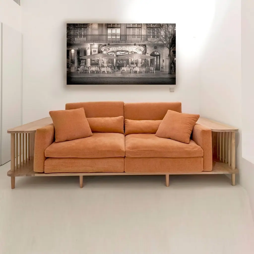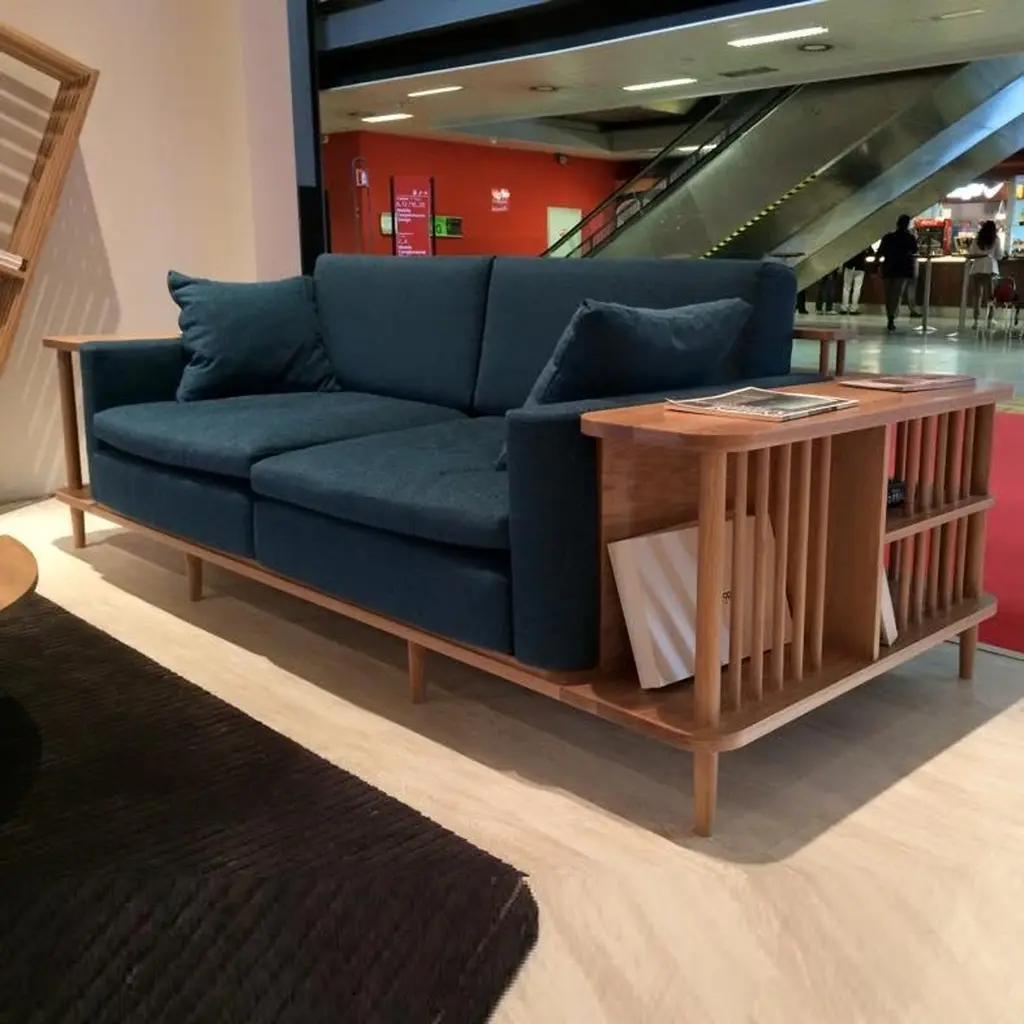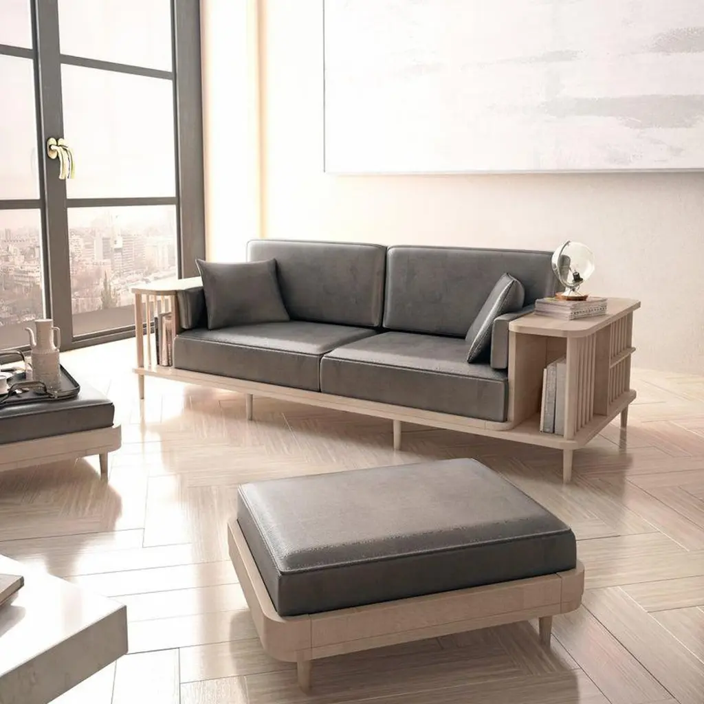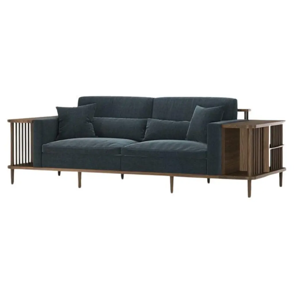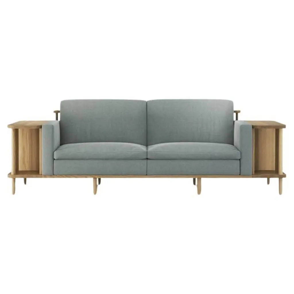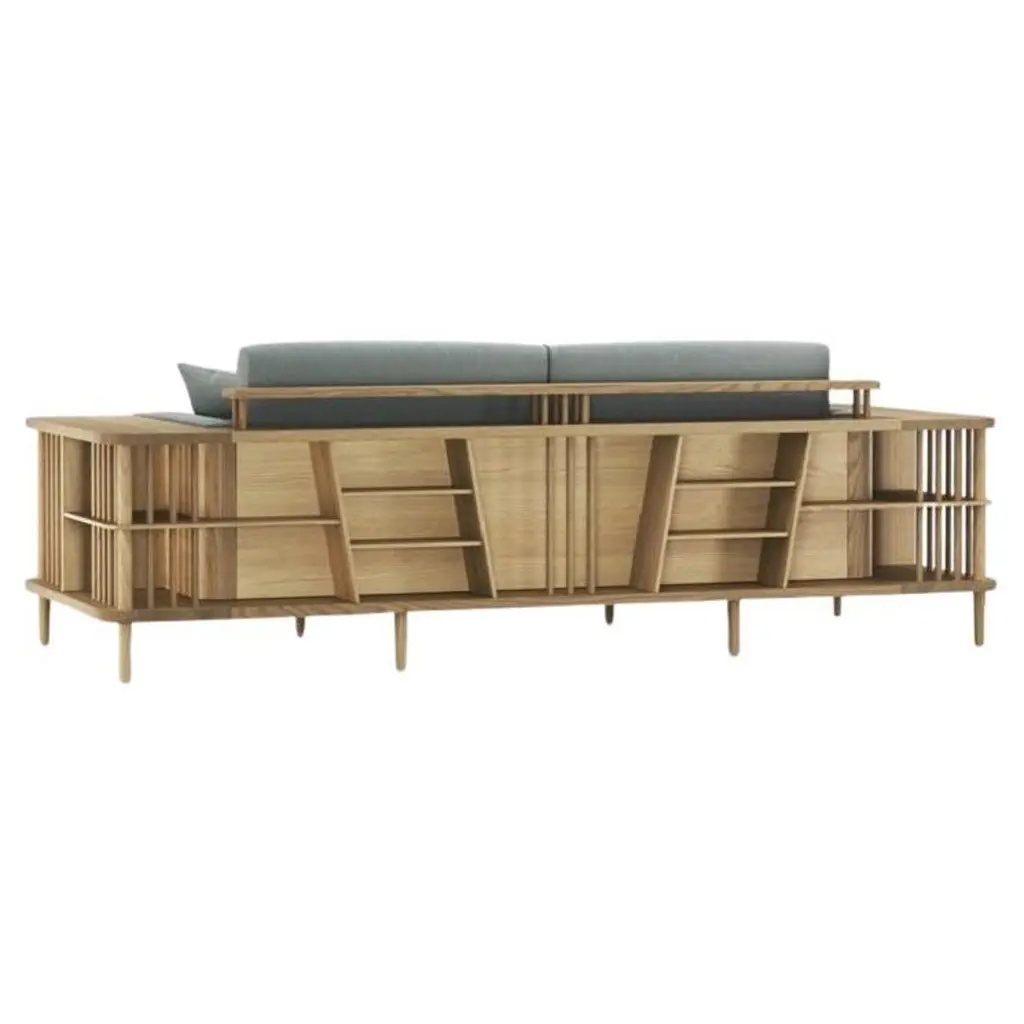 Crafted from premium materials, this sofa offers both comfort and functionality with its surrounding wooden frame doubling as a bookshelf or room divider, showcasing exquisite craftsmanship.The focal point of this sofa is its 100% solid wood structure, characterized by sturdy yet minimalist lines. Enhanced by a natural wood finish, it exudes Scandinavian charm, seamlessly blending into contemporary or traditional interiors.Contact us to enquire about COM/COL production, requirements and material shipping instructions.Please contact us if you have any questions about customization and pricing. We will be glad to check with the factory’s technical team if sizes, finishes, and colors can be customized. We do our best to expedite production and to ship and deliver product within the listed lead time, however current lead times might be longer due to global shipping backlog and delays. These delays are out of our control and cannot be a reason to cancel an order.